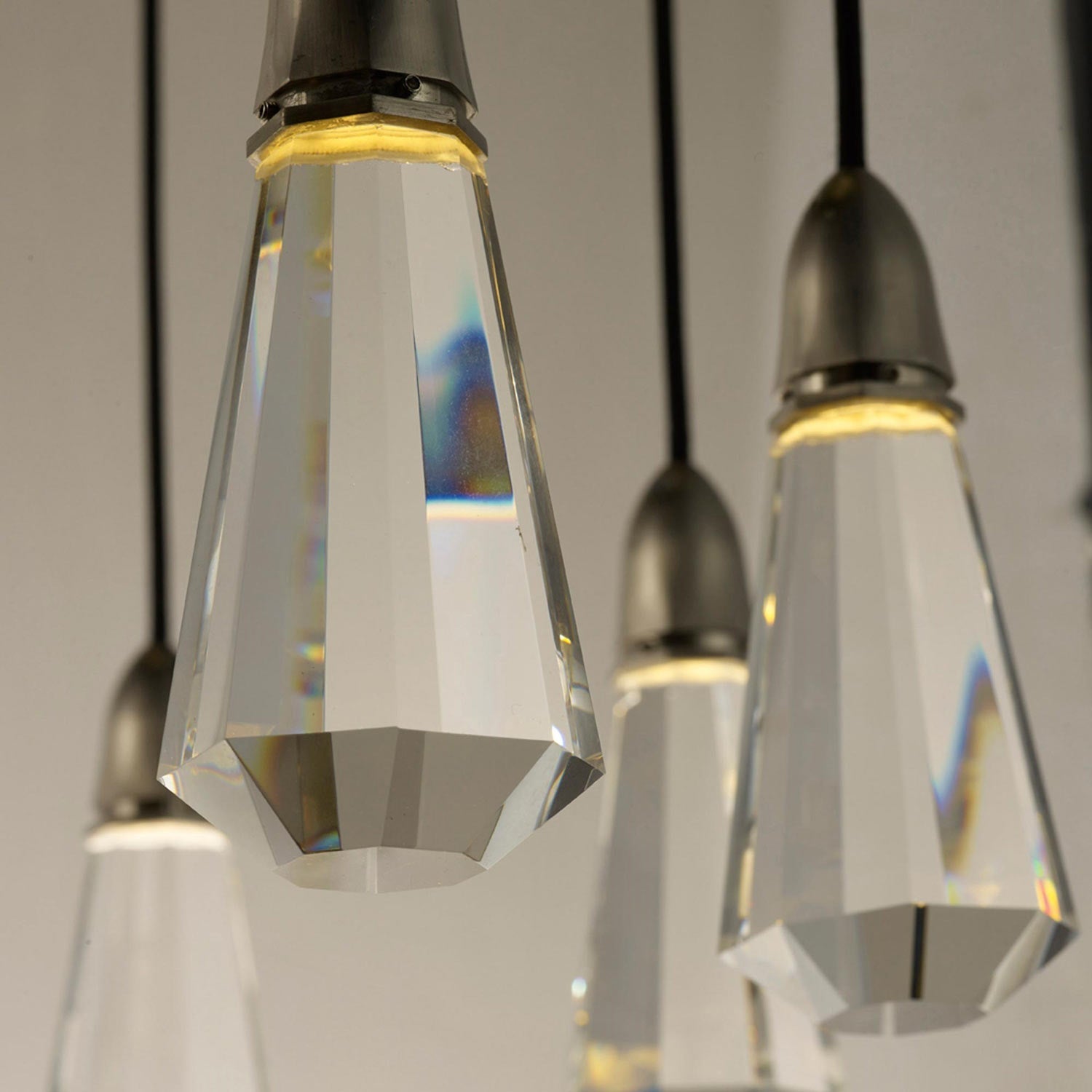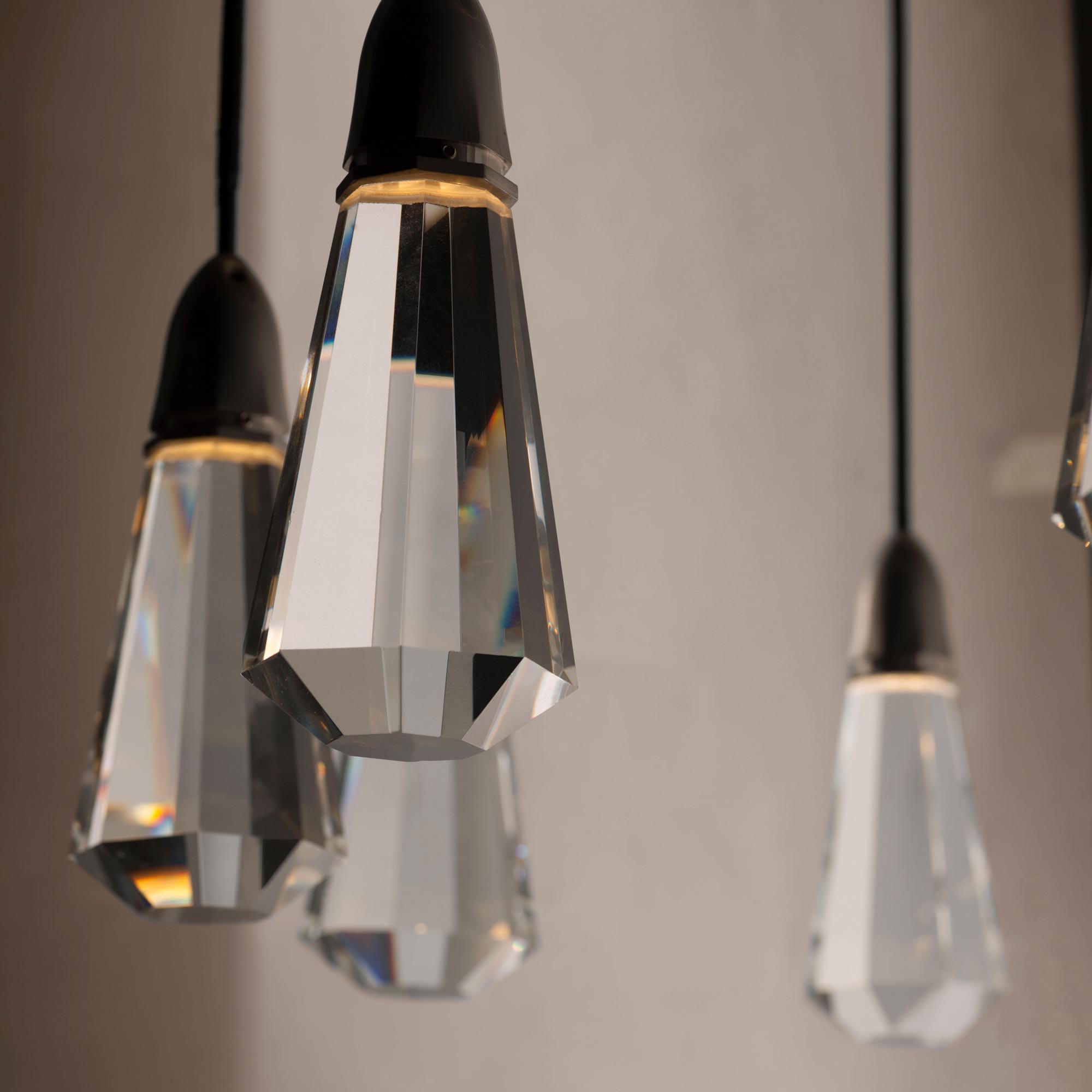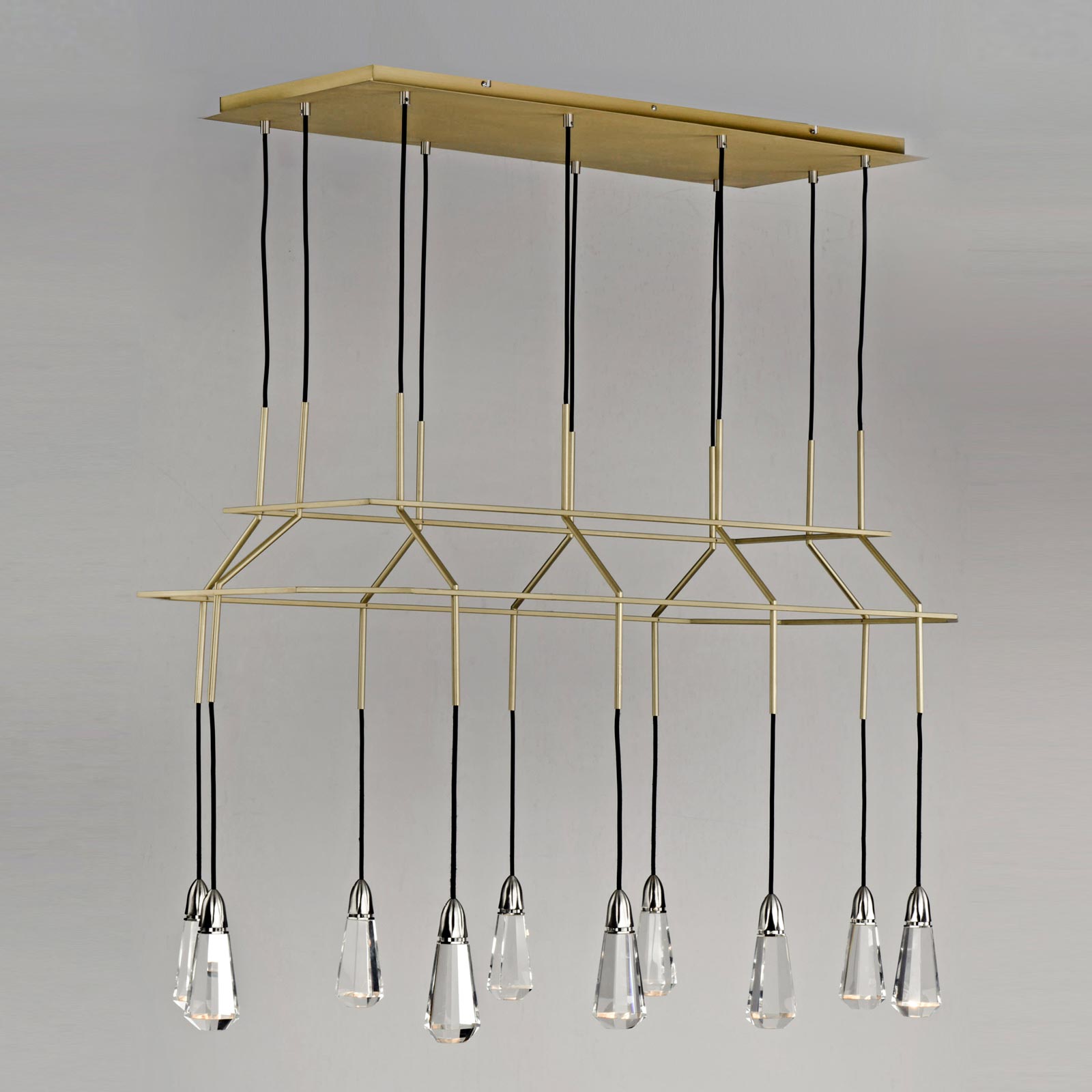 This energy-efficient contemporary modern 10 Carat LED Rectangular Chandelier from Studio M presents a breathtakingly glamorous addition to formal dining areas and more. Cascading crystals drape over a rectangular shape cage, offering a magnificent illumination and scintillating effect across tablescapes and focal walls.