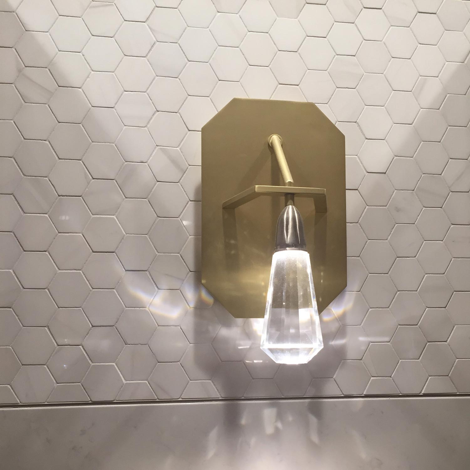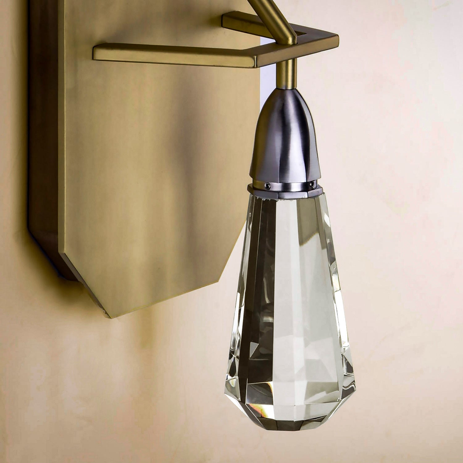 A striking addition to focal walls and foyers, this contemporary modern 10 Carat LED Wall Light from Studio M lends a refined silhouette with a hint of glamour. A glittering cut crystal teardrop shade dangles from a ledge, creating a breathtaking elegance and balanced expression to this energy-efficient wall light.
