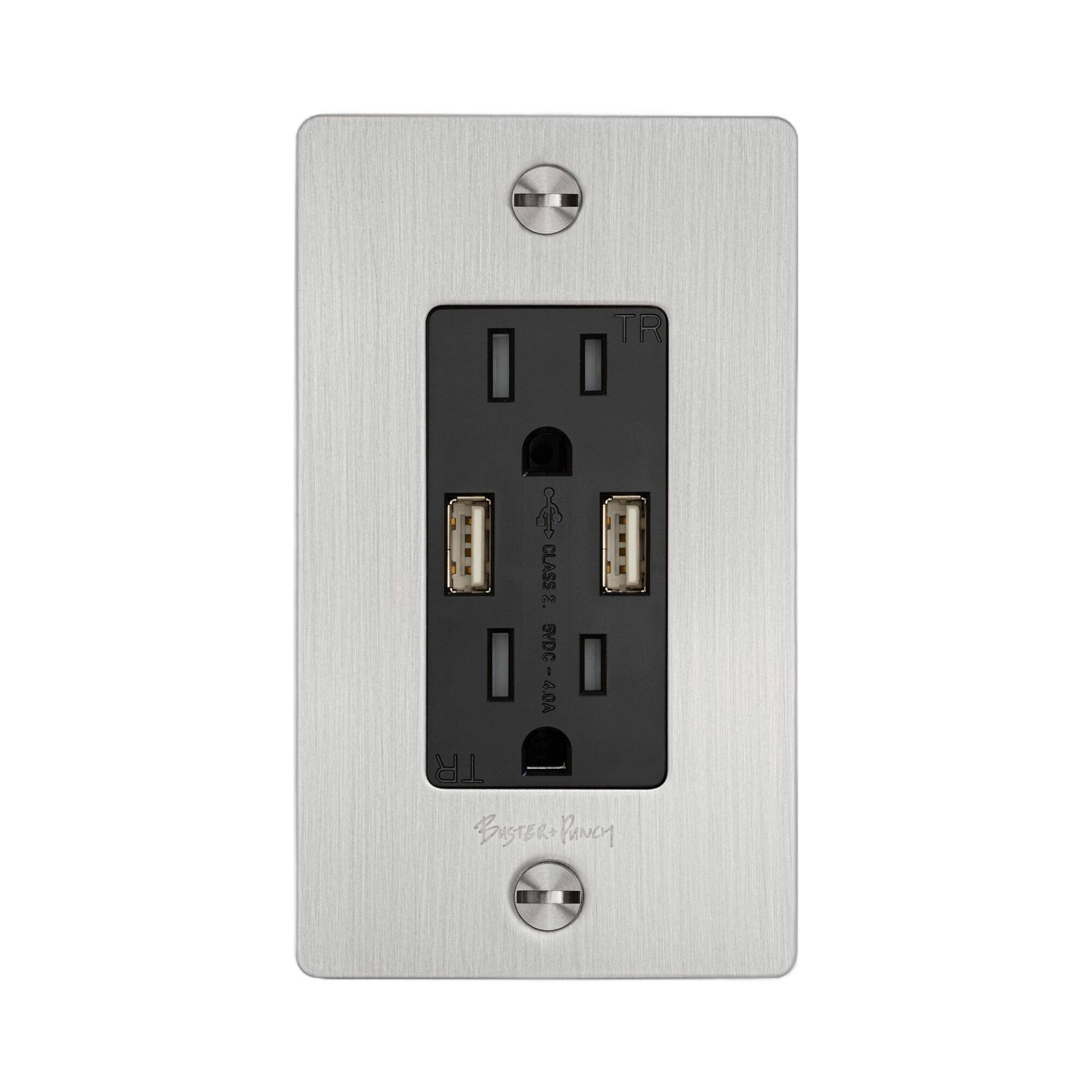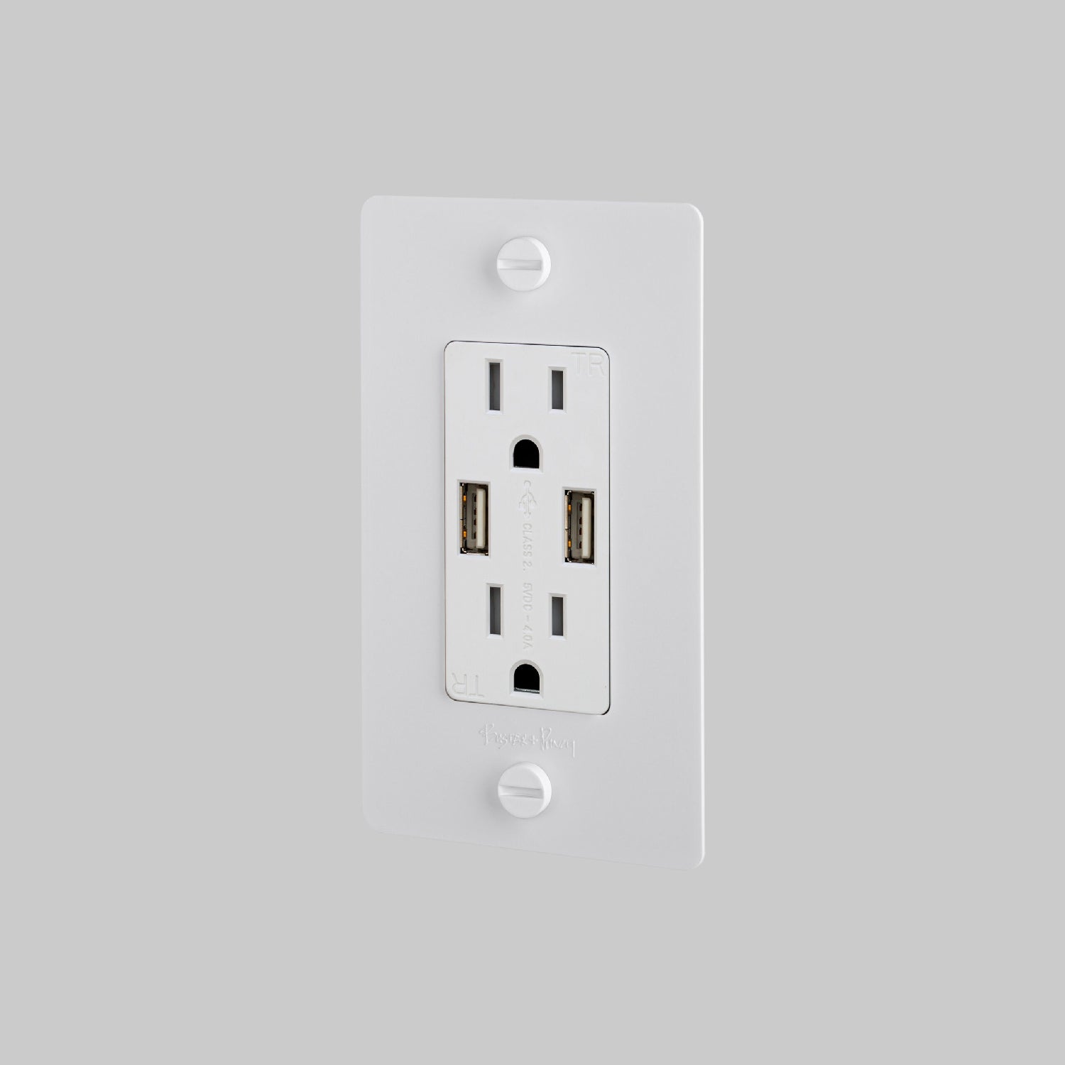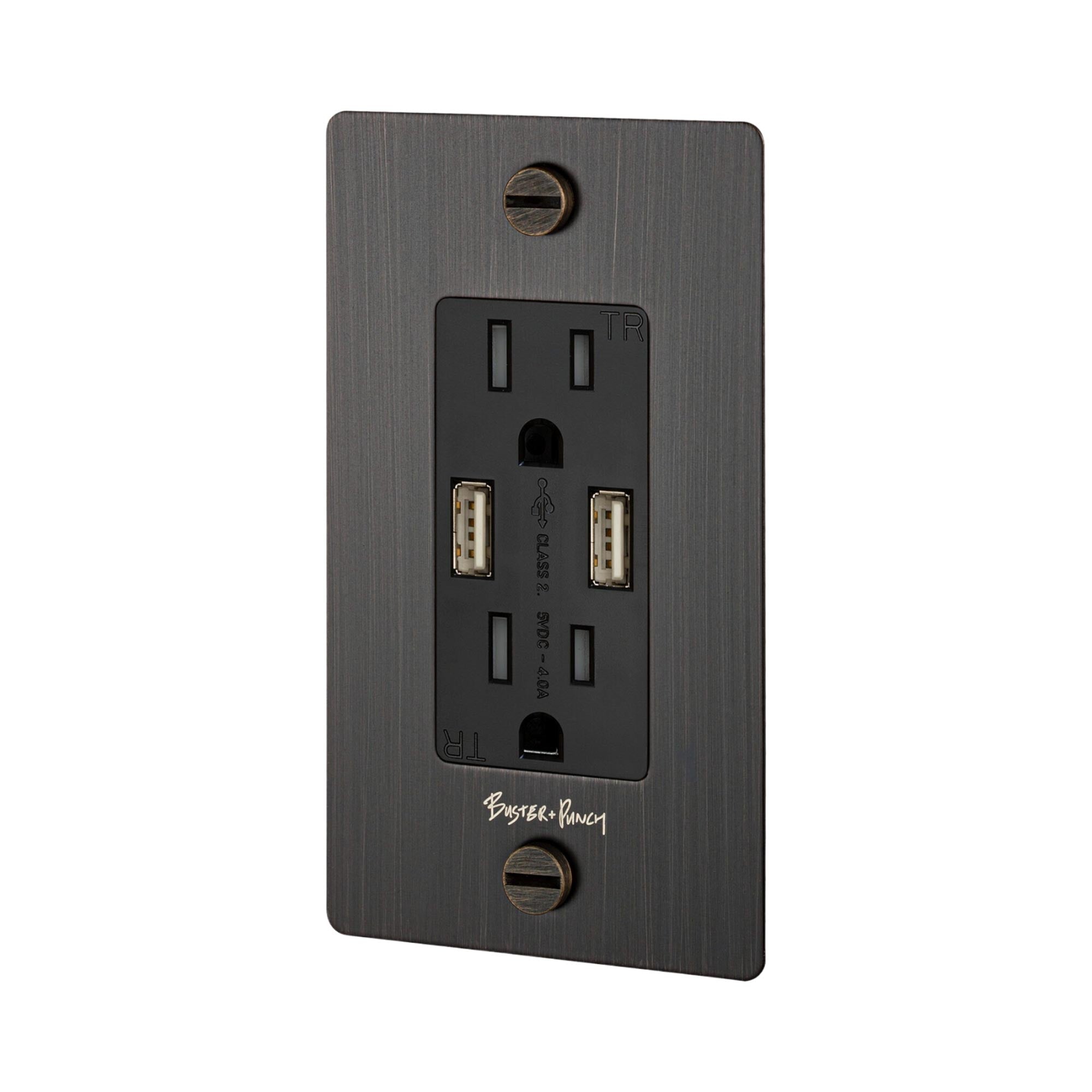 The 1G Combination Duplex Outlet with 2 USB Ports from Buster and Punch features multiple functionalities and a clean modern design. Handy device charging through USB ports enhances the utility of this well-made, well-designed modern accessory. This duplex outlet mounts with included solid coin crews