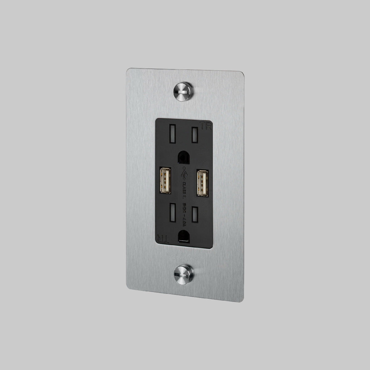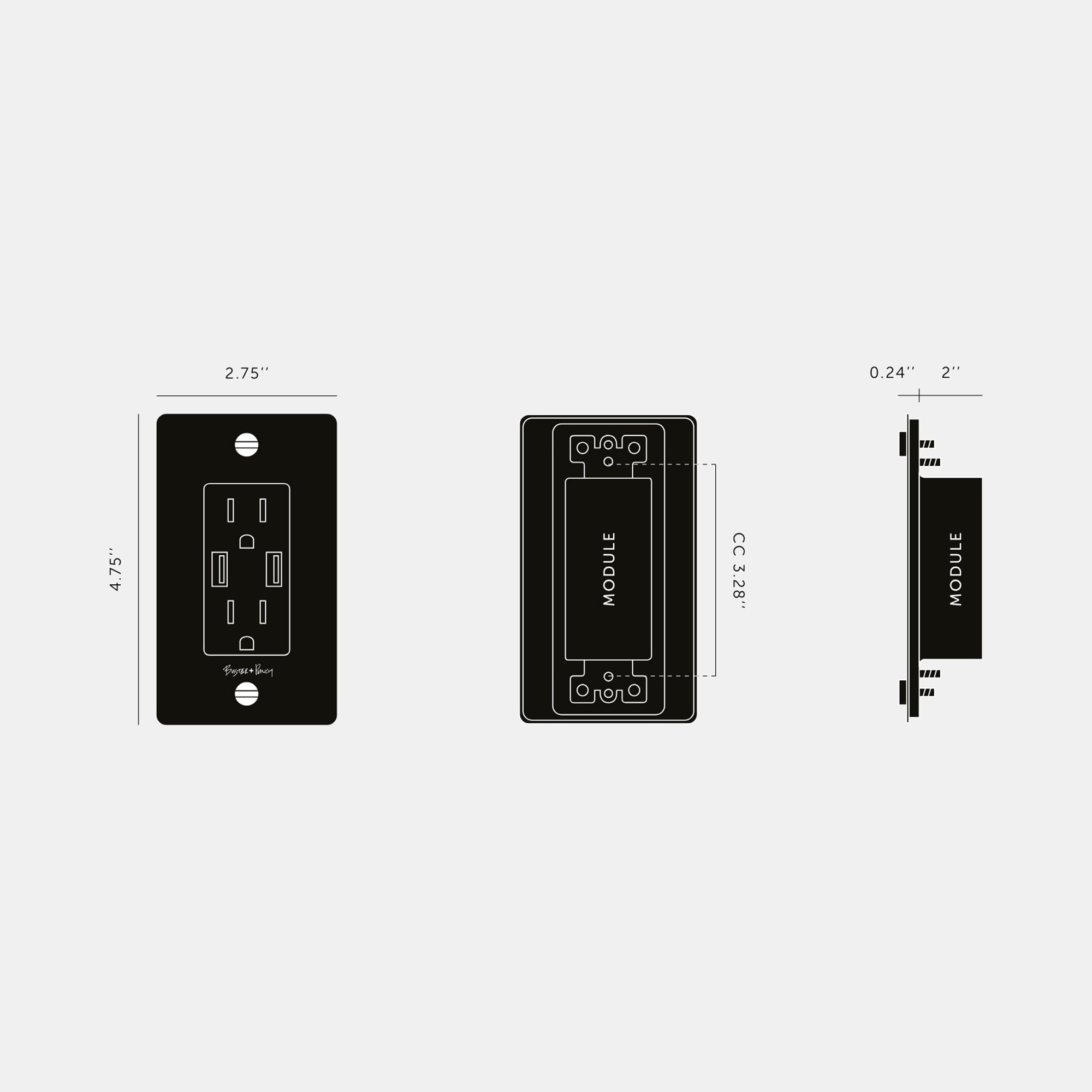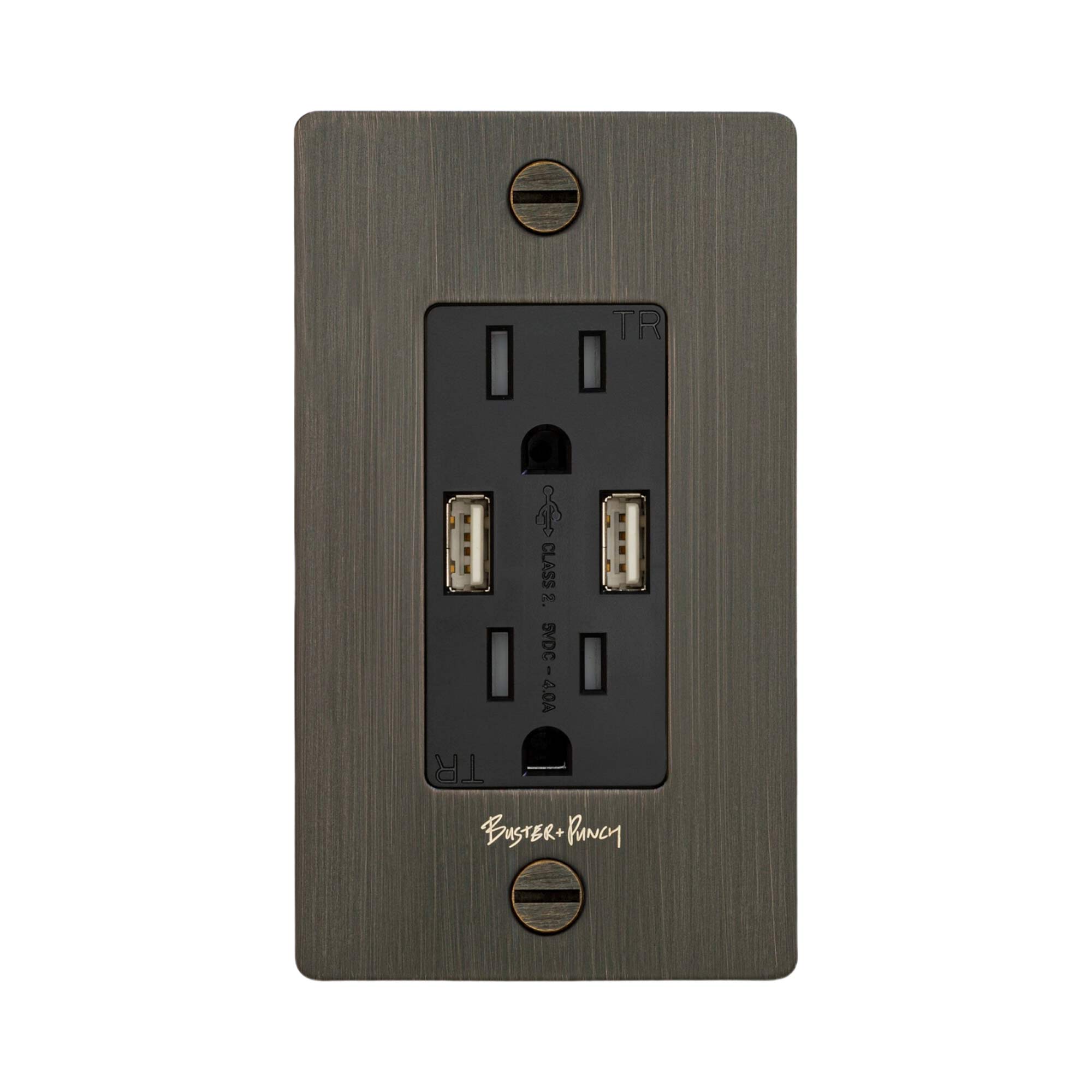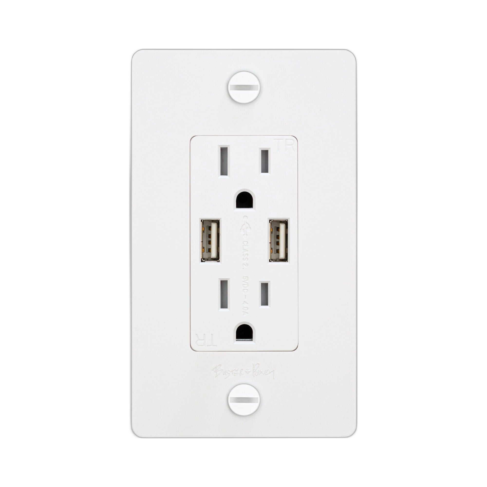 The 1G Combination Duplex Outlet with 2 USB Ports from Buster and Punch features multiple functionalities and a clean modern design. Handy device charging through USB ports enhances the utility of this well-made, well-designed modern accessory. This duplex outlet mounts with included solid coin crews