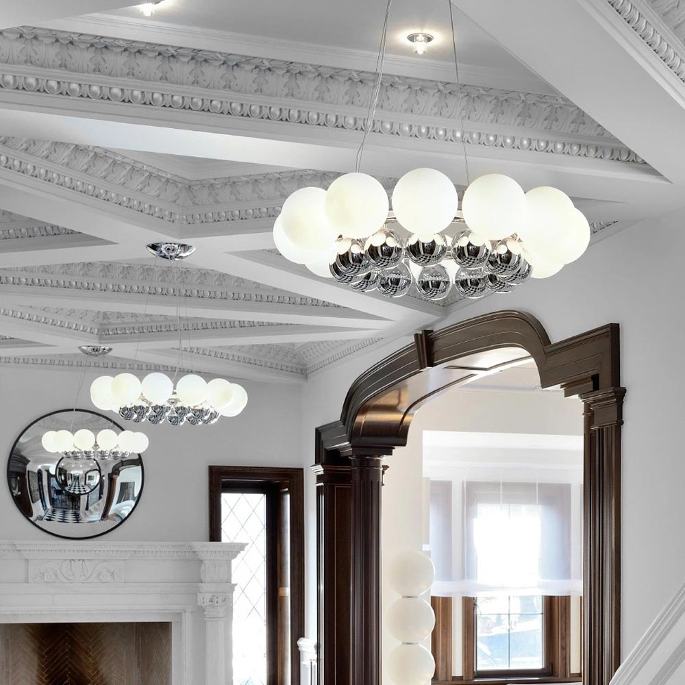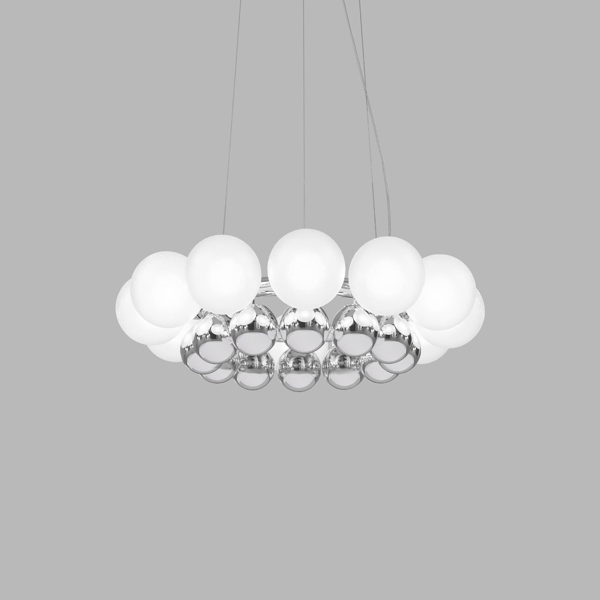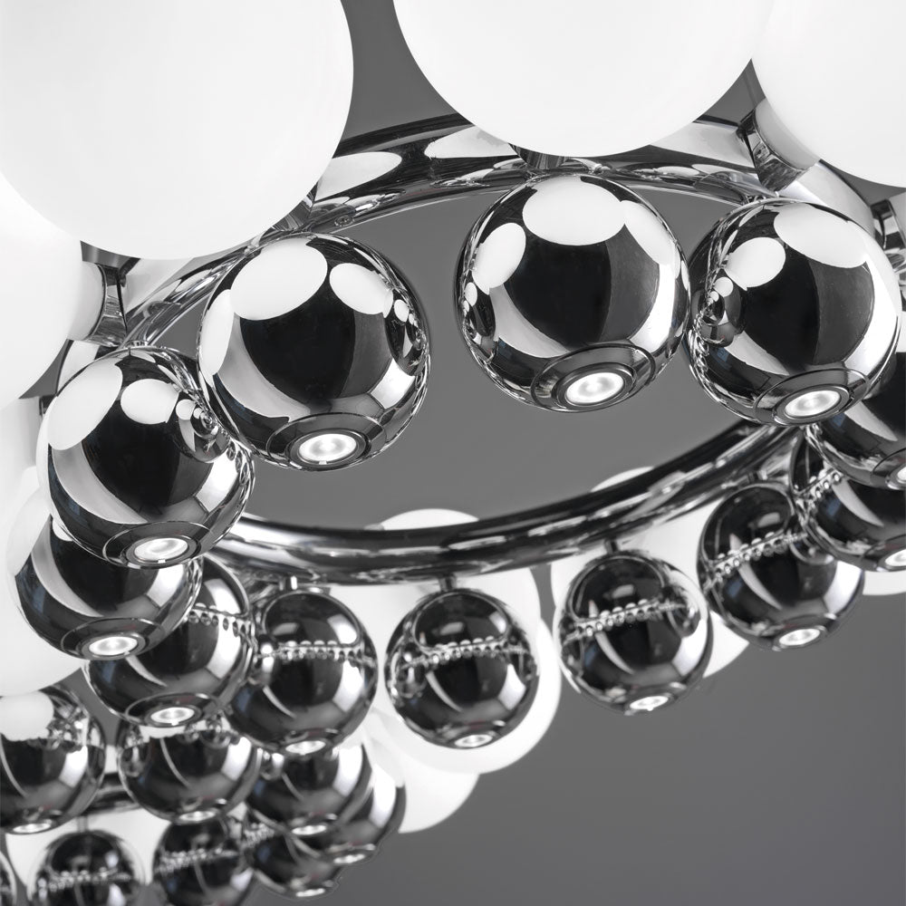 Lift the festive climate in a custom space with the delightful 24Pearls Chandelier from Vistosi. Art Deco goes mod and captivating in a fixture celebrating bubble-like bulbs made of chic white metallic finish glass, encircling a chic metal frame. Petite metal shades align below, embellishing light reflection and balancing the ring silhouette of this fabulous fixture.