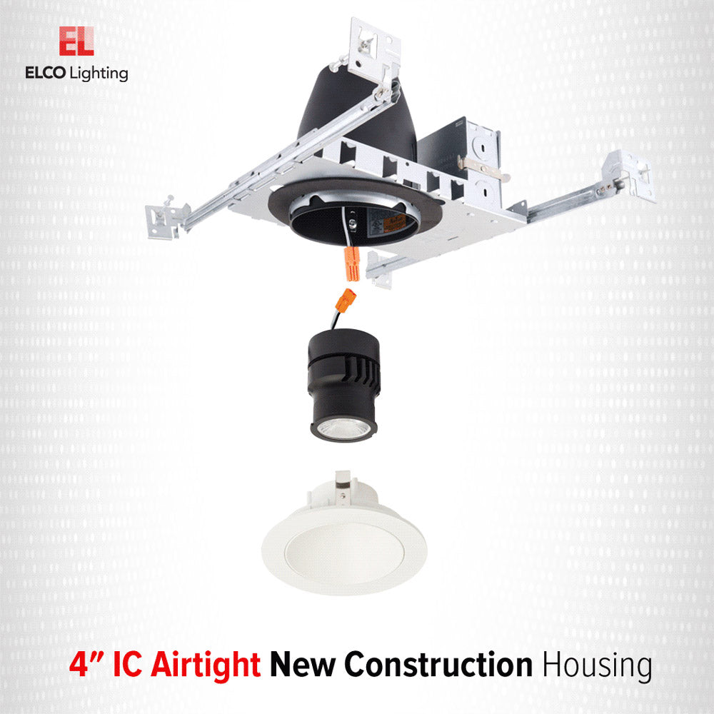 This 4" New Construction IC Airtight Housing from Elco Lighting is designed for the LED insert module of your choice (sold separately). It's rated for direct contact with insulation and features an 18-watt fixture maximum. Both Title 24 and Energy Star compliant.