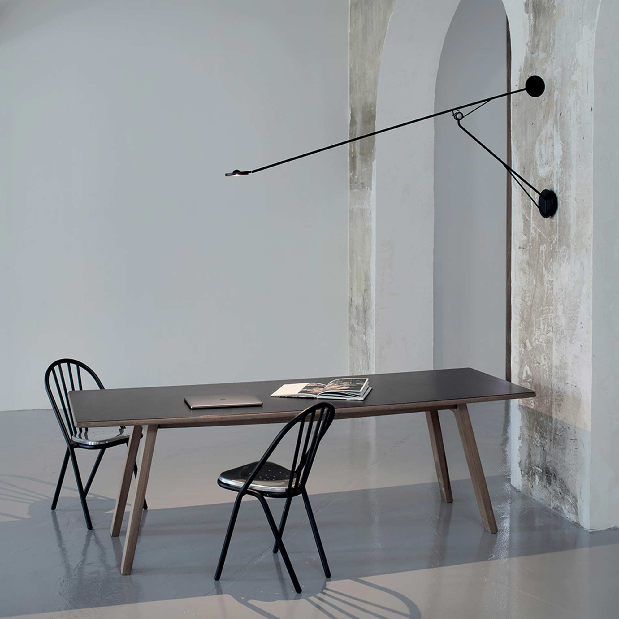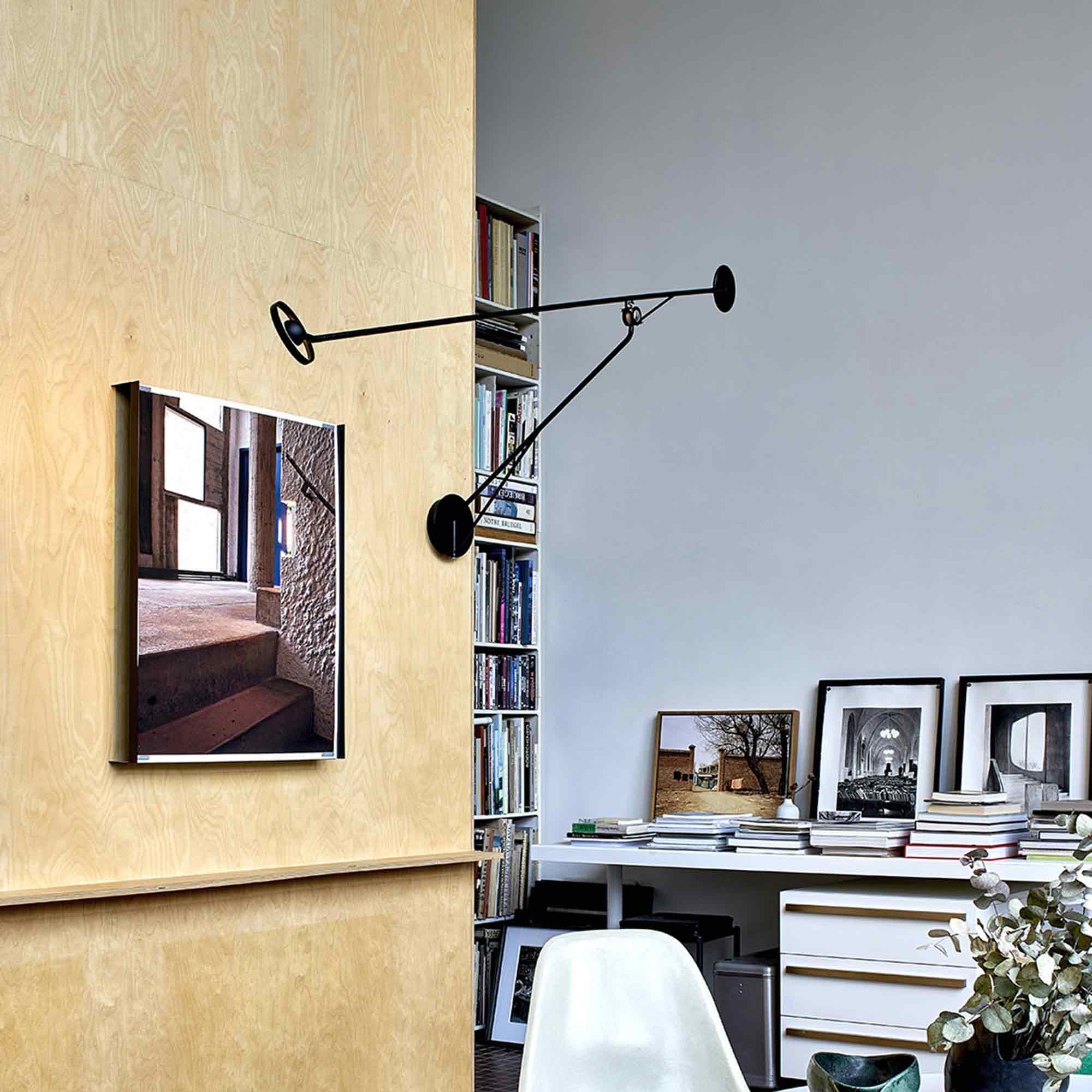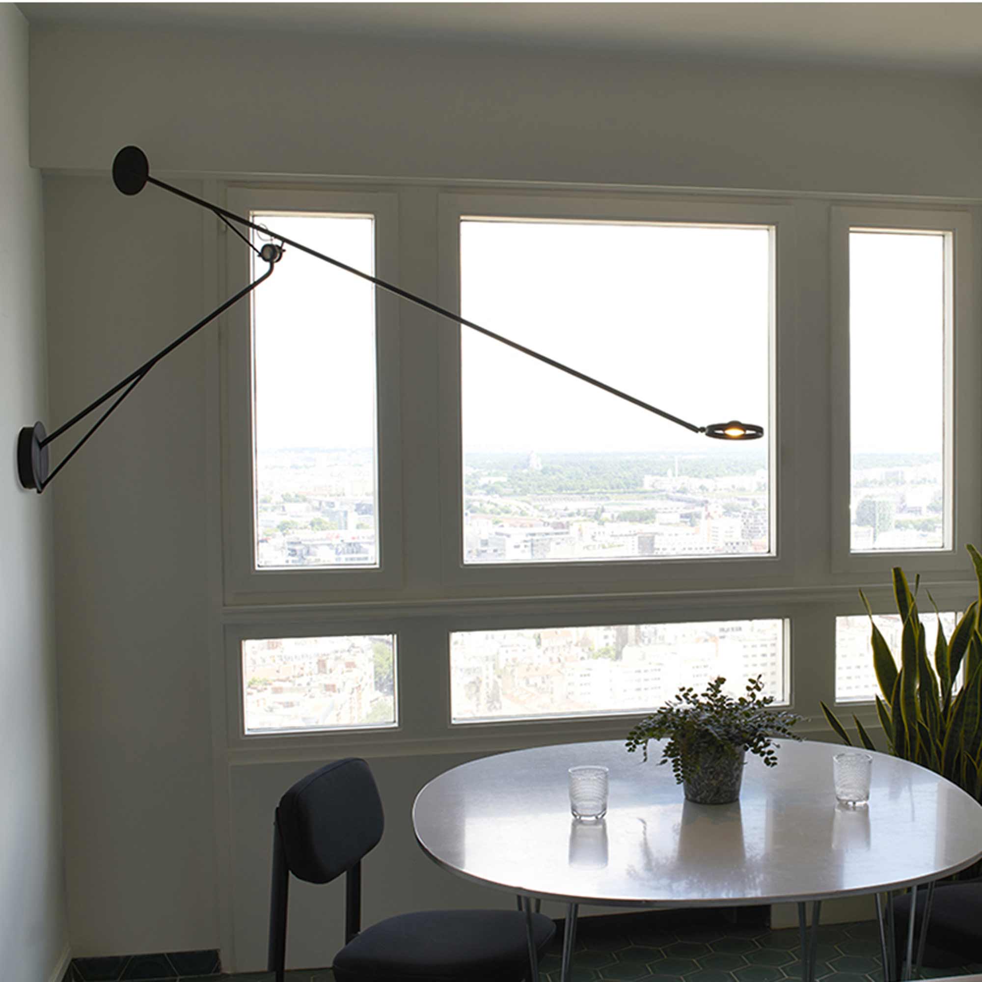 Wall lamp in steel and aluminum. The starting point of Aaro was a gesture. A movement. Simon Schmitz wanted to create an as fluid motion as possible, which immediately lead him to the sphere. The end result is an object that seems to be moved by the wind. It revolves effortless around its centerpiece, like planets orbiting around each other.