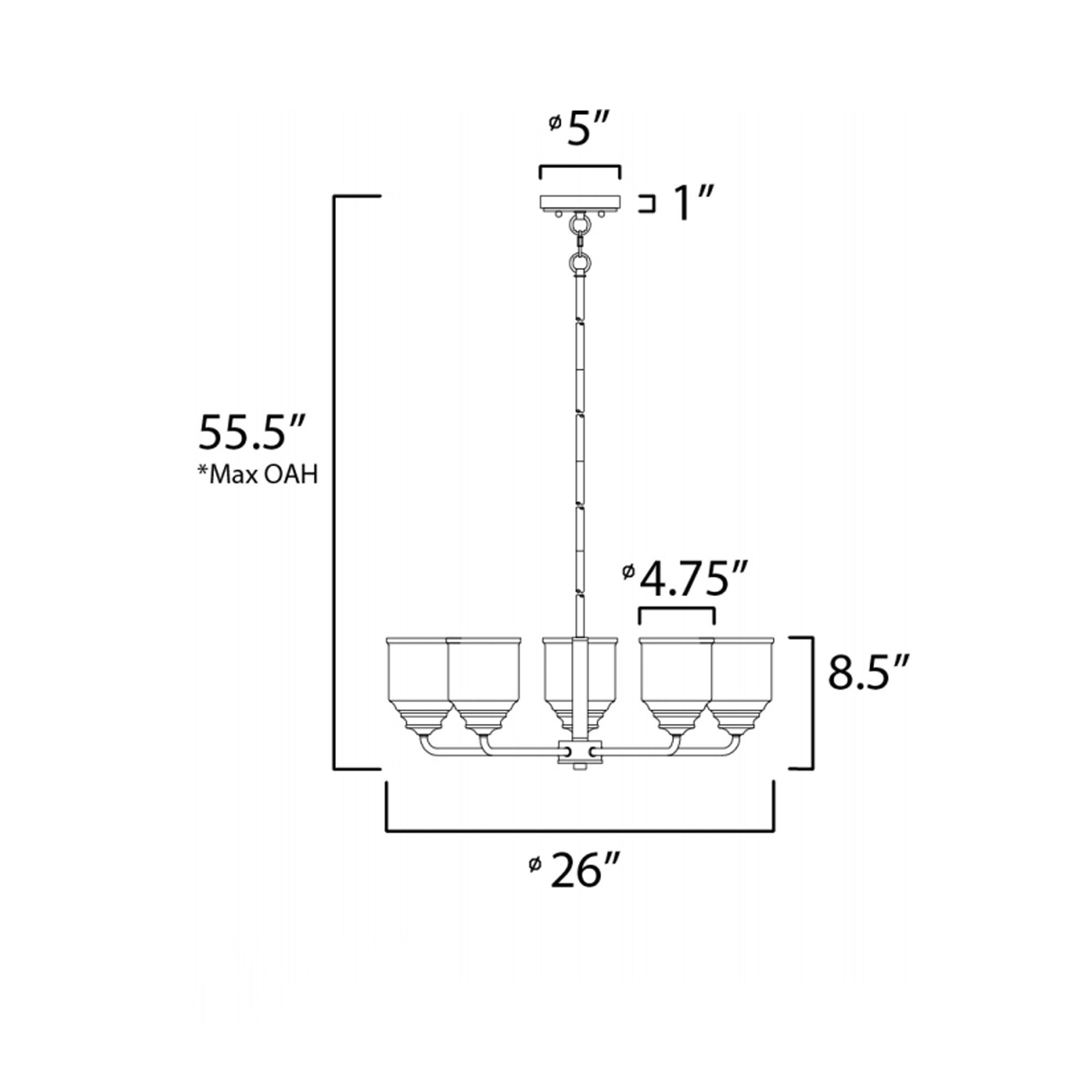 - 5-Light: 26"D X 8.5"H; 55.5" max height