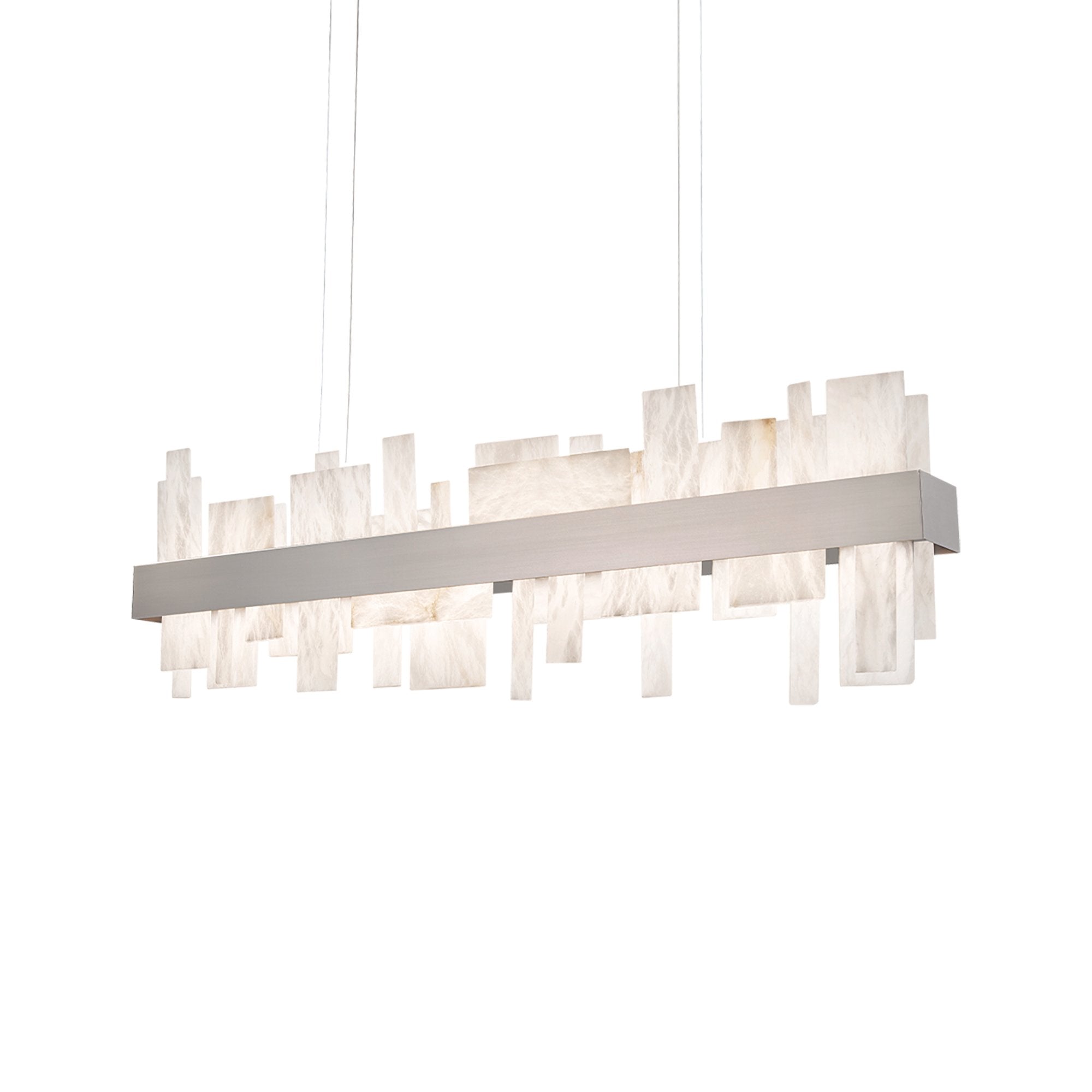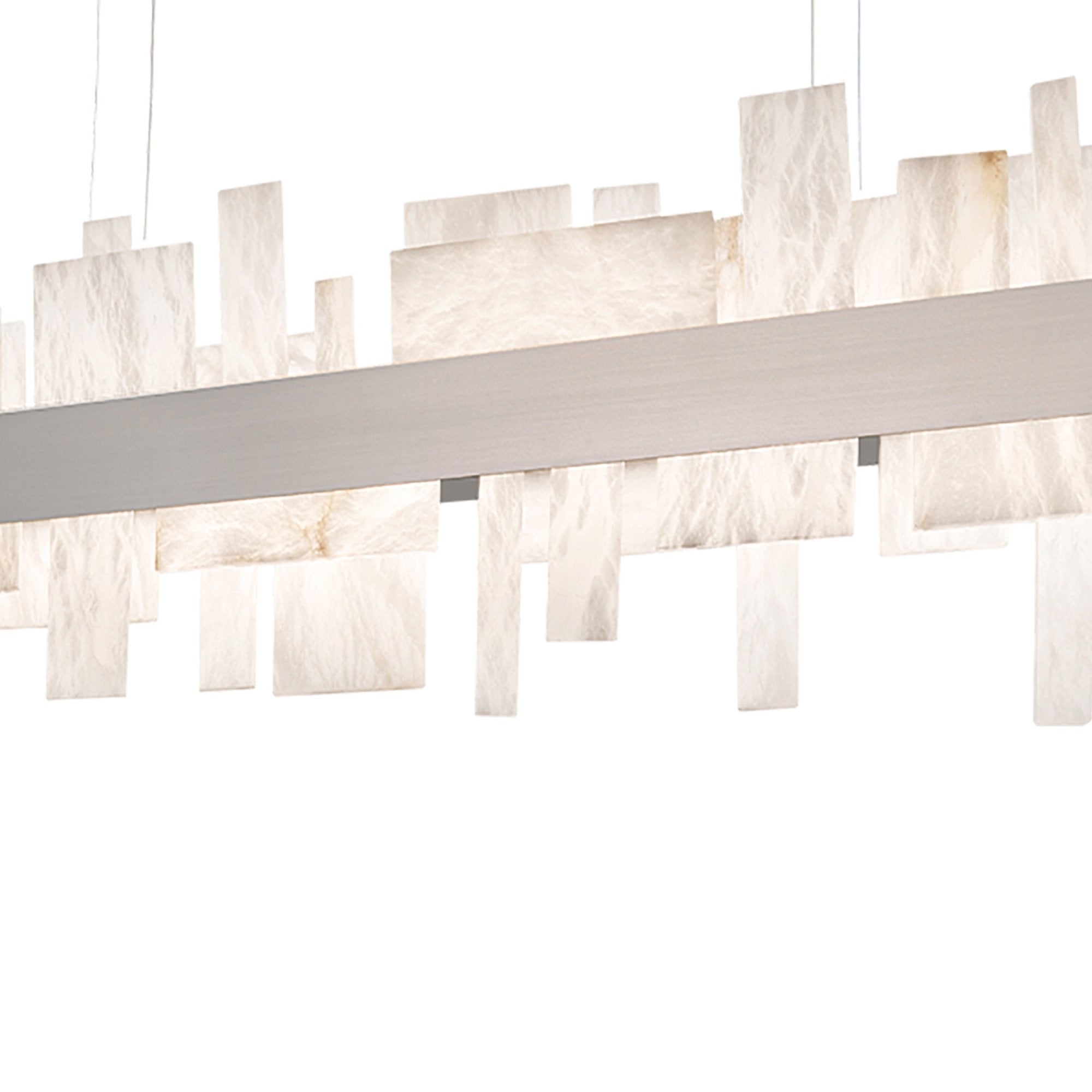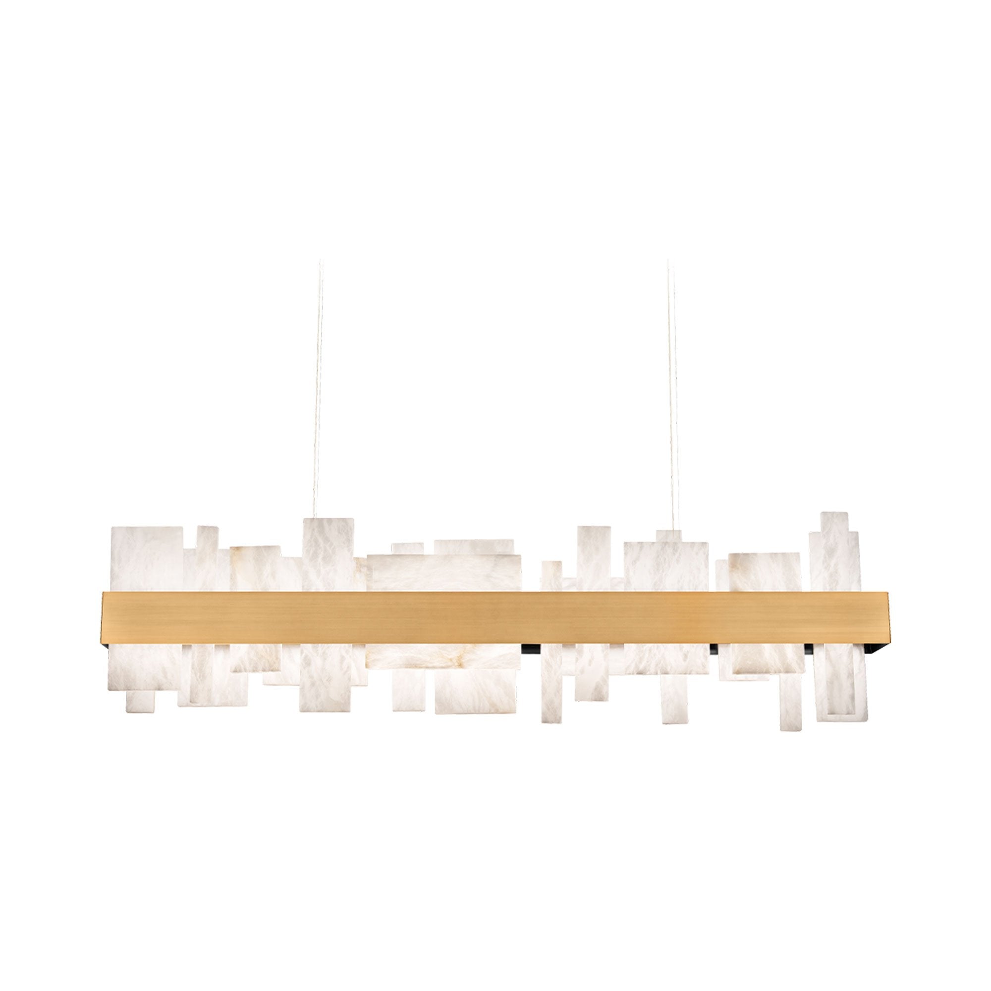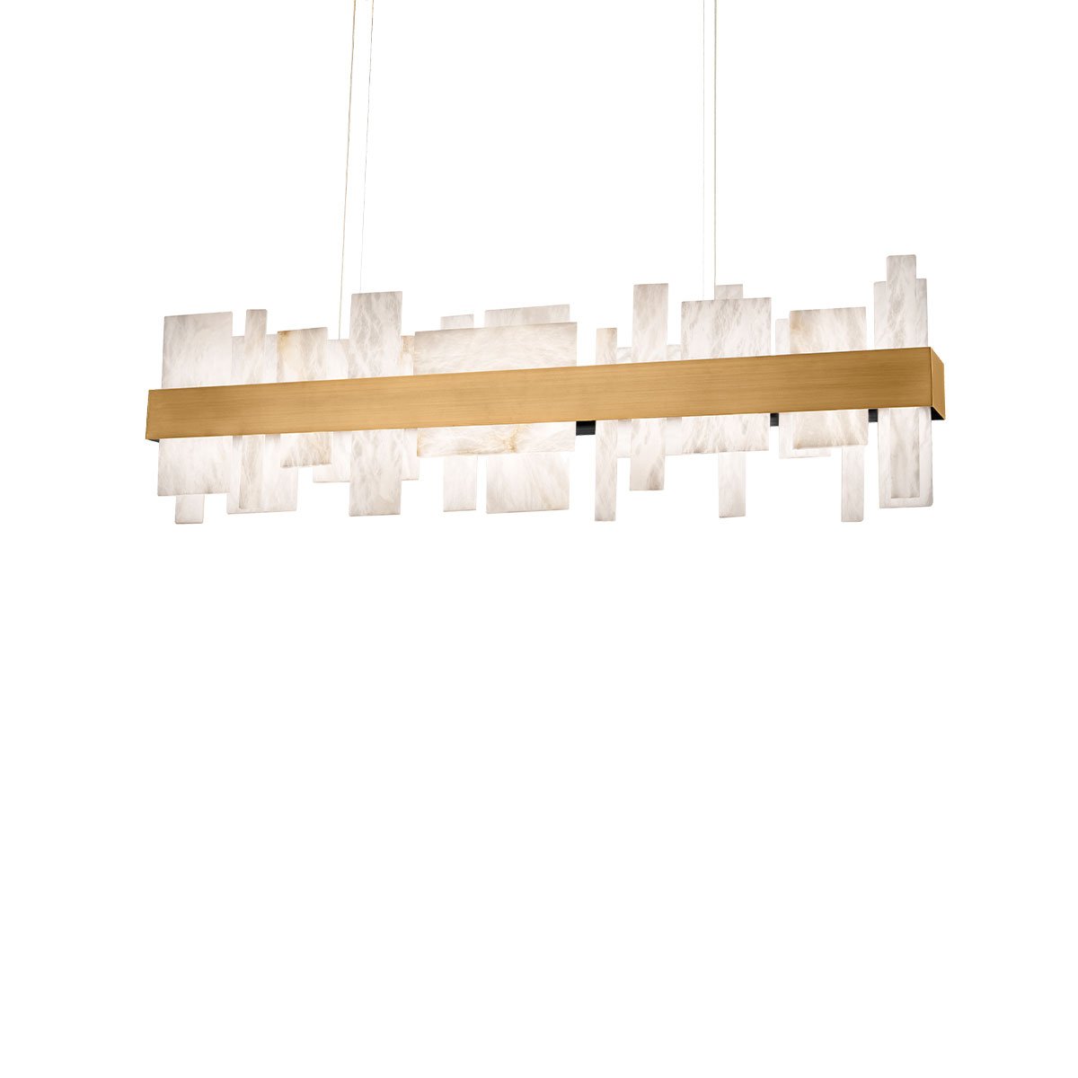 From the shining city on a hill, our visual vocabulary gives us a statement piece for the ages. This abstract lights cape features undulating Spanish natural alabaster forms reflected below a luminous aged brass band in peaceful symmetry. Ultra-thin power cables and minimal hardware completes a clean architectural design.