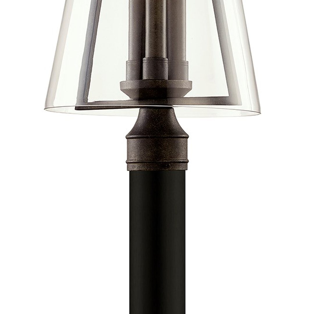 Stunning with elegant style, the Adamson Outdoor Post Light from Troy Lighting glams up an exterior space with a fixture fashioned of French iron finish metal and a tapered clear glass shade shielding a candelabra bulb base.