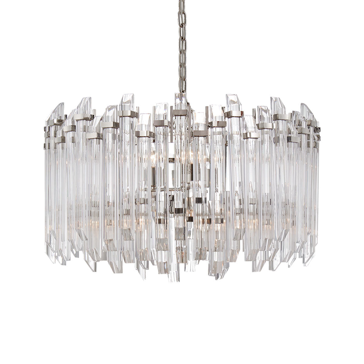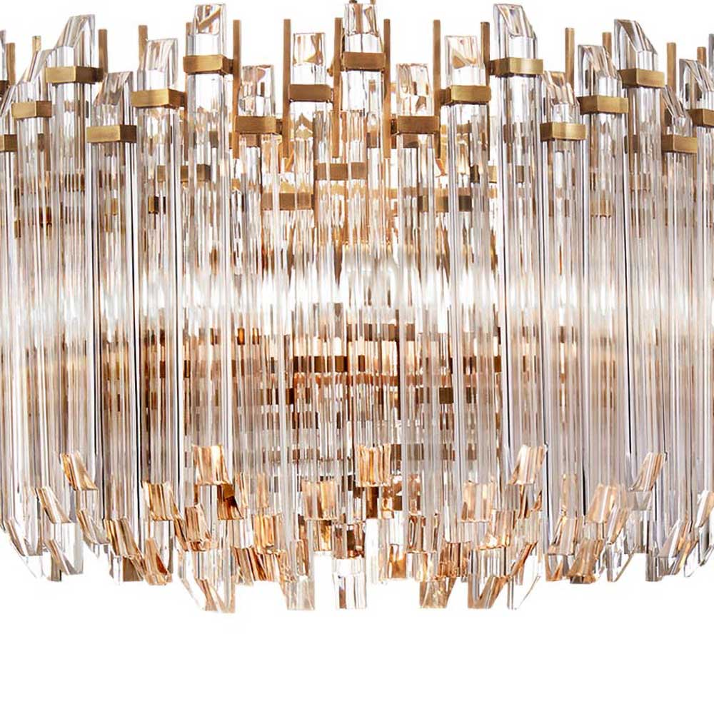 Magnificently glamorous, the contemporary Adele Drum Pendant Light from Visual Comfort Signature offers a timeless Hollywood Regency style that captivates audiences and creates a wonderfully luxe interior. Clear acrylic rods shaved at each end cascade around this breathtaking chandelier, scintillating light across tablescapes and capturing the light in a way that can only be seen to be believed.