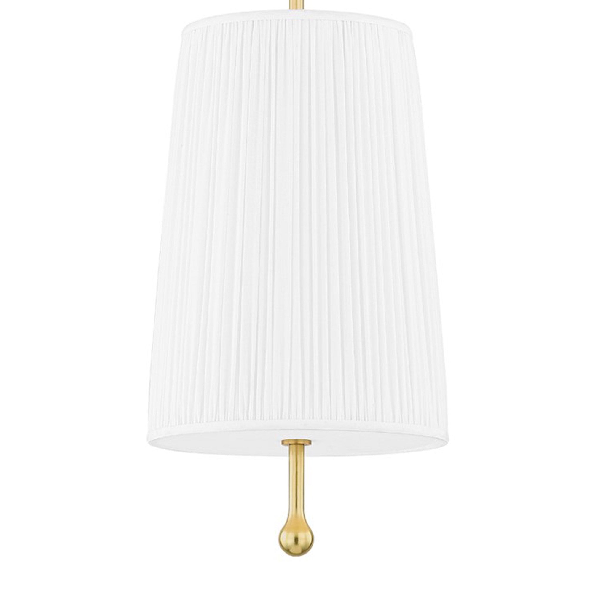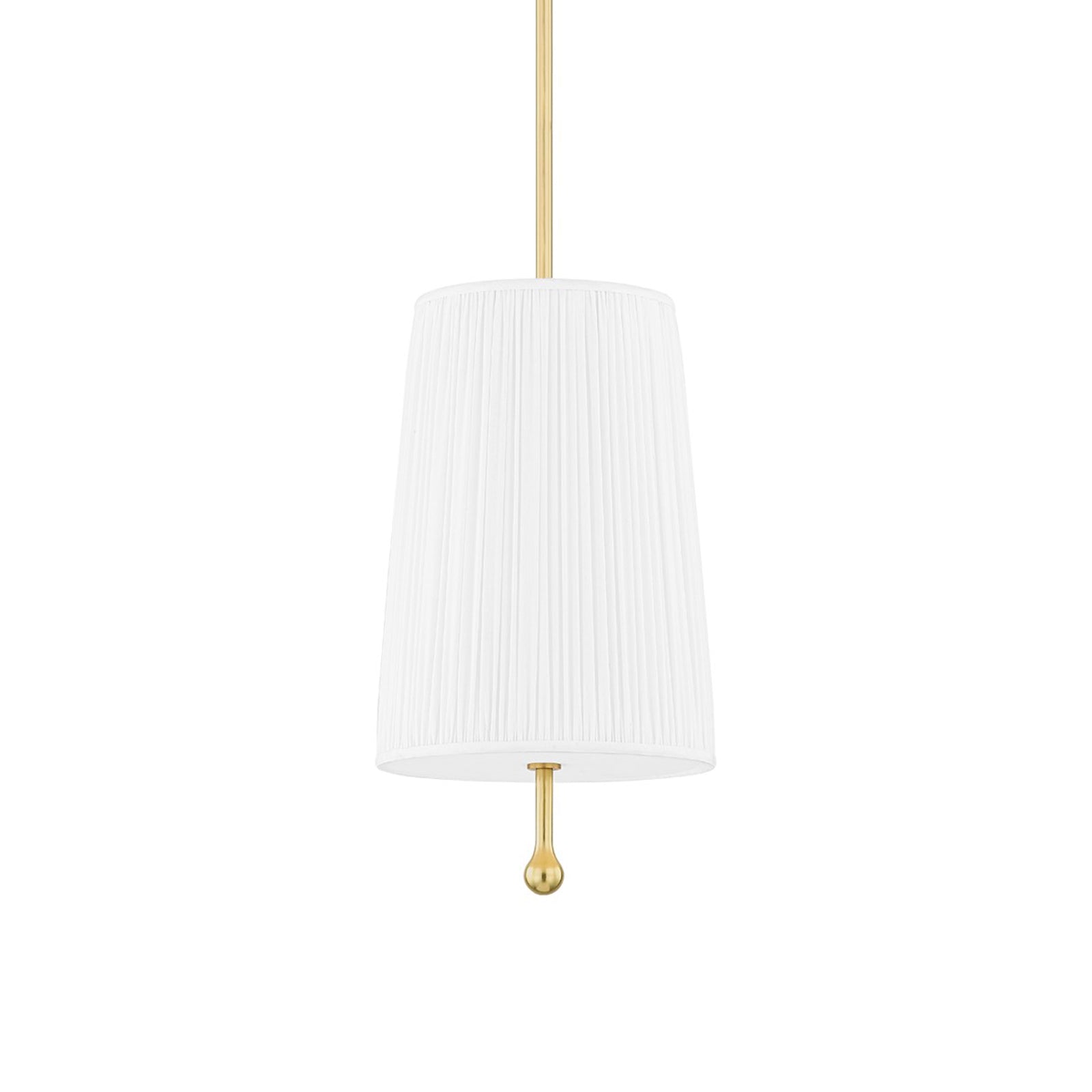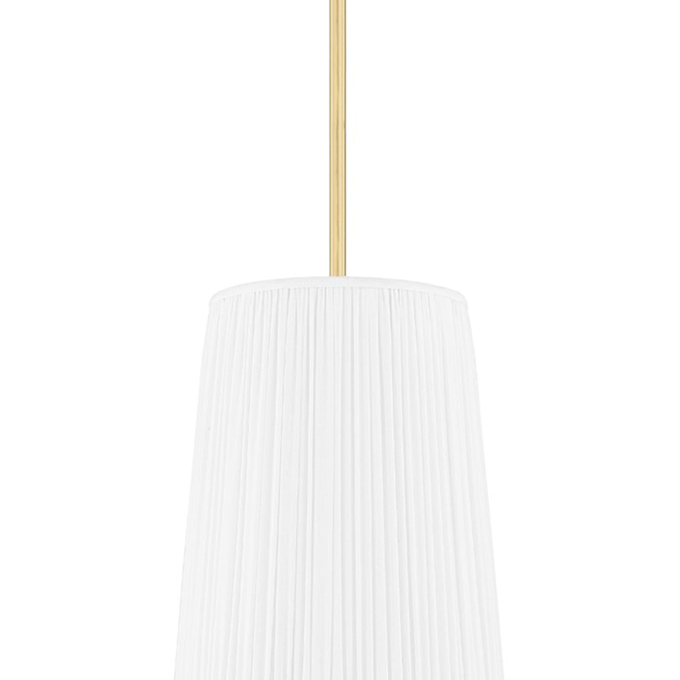 Tasteful design elements reflect in a conventional motif with sophisticated updates in a light fixture ideal for modern and traditional settings. The Adeline Pendant Light from Mitzi delivers stylish simplicity with an appropriate touch of minimalism embellished by glam influence. This elongated fixture wraps a texture-inducing pleated white fabric shade over a slender body stem fashioned of beautiful aged brass finish metal, leaning on surrounding décor to call out the style ensemble of a living room or bedroom.