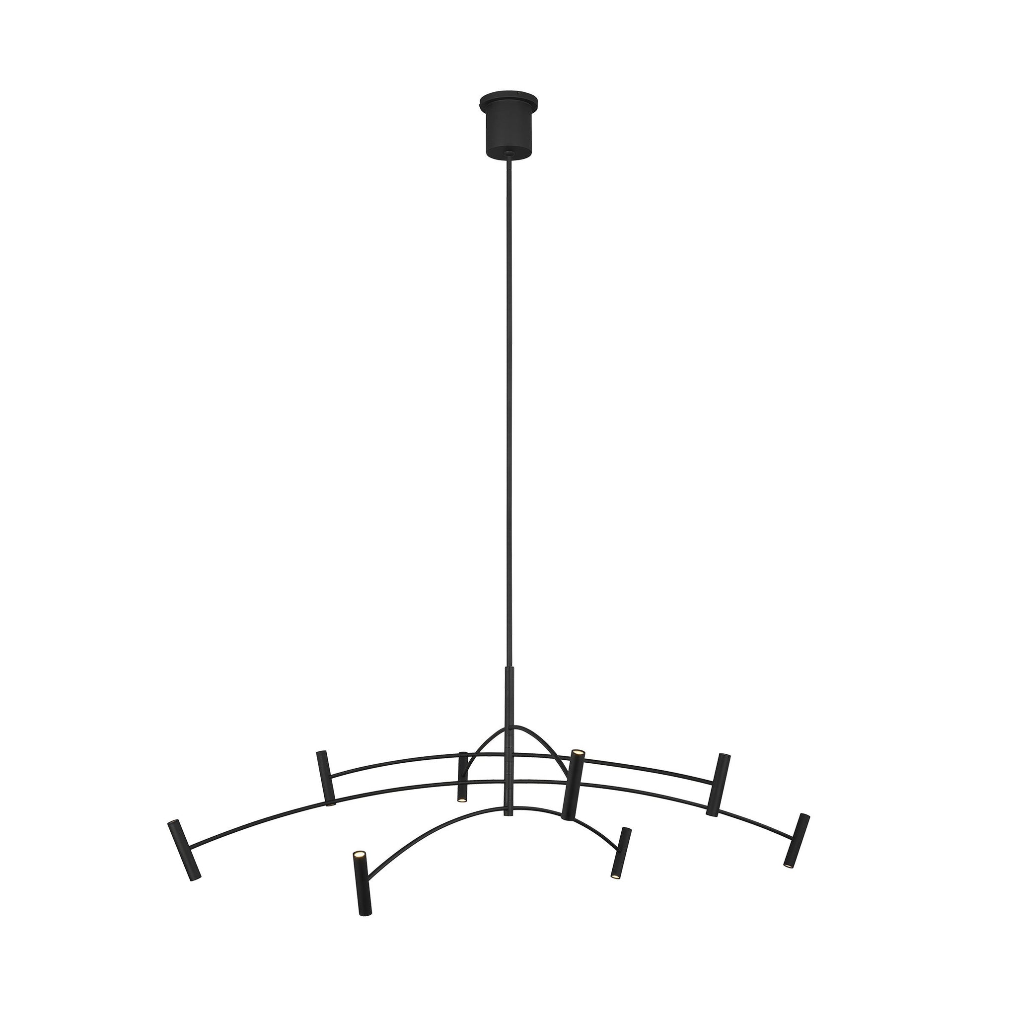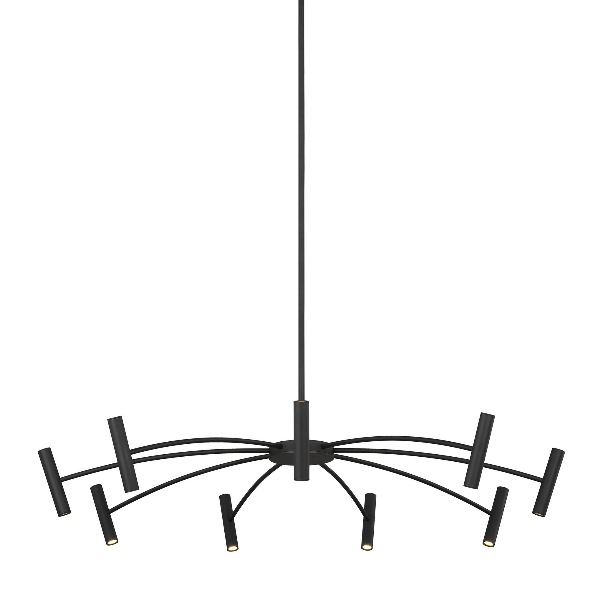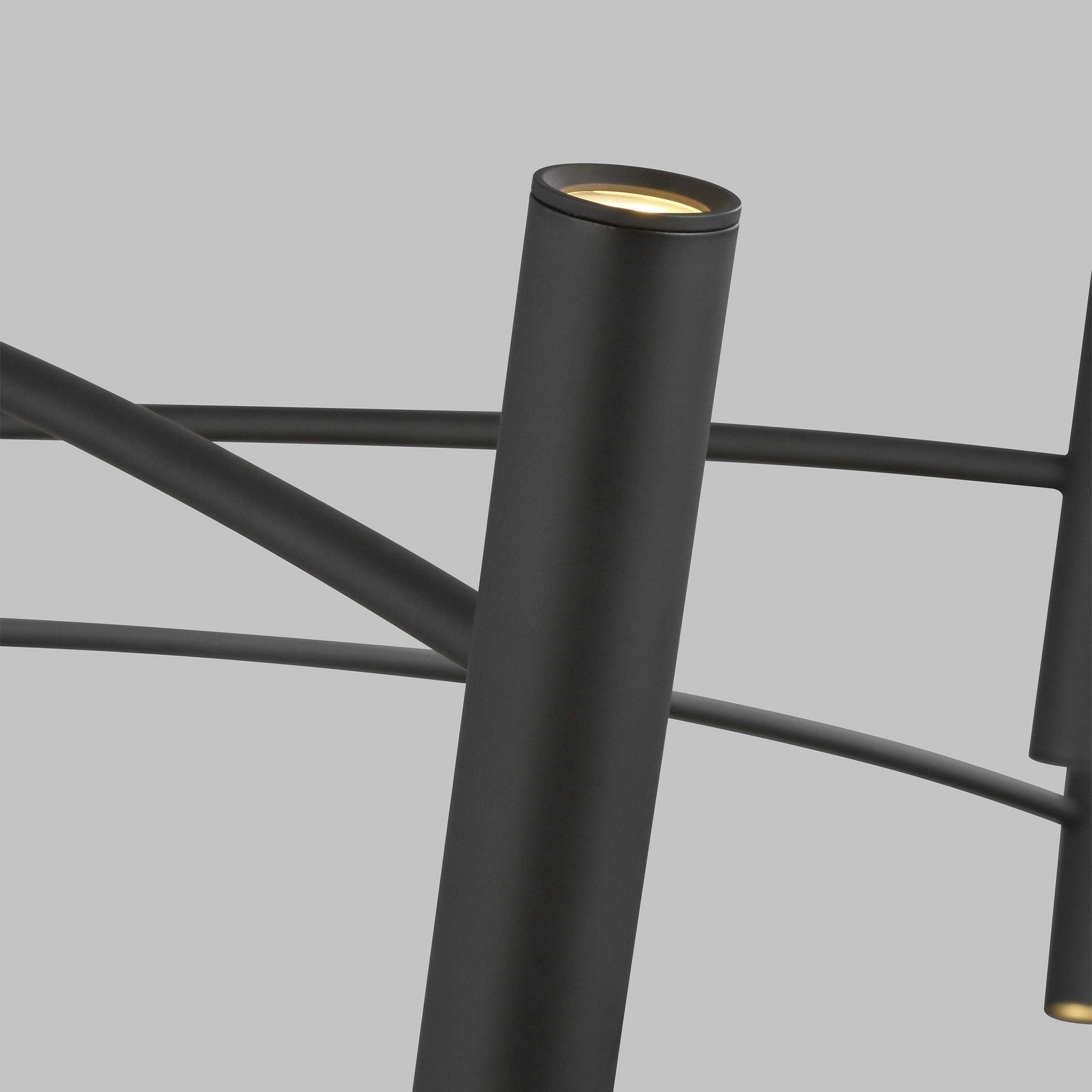 This Aerial LED Chandelier by Sean Lavin for Visual Comfort Modern features symmetrically spaced arched rods supporting a ring of slim cylindrical heads. The cylinders produce up and down illumination while concealing the integrated LED light sources. Offered in two large diameters, 40" and 55", the Aerial chandelier is highlighted in two contemporary finish options aged brass and matte black and hangs a maximum 60" with the included adjustable stems. A great piece to coordinate with the smaller scale Aerial chandelier in your open living space, dining area and foyer. Lamping options are compatible with most dimmers. Refer to the Dimming Chart for more information.