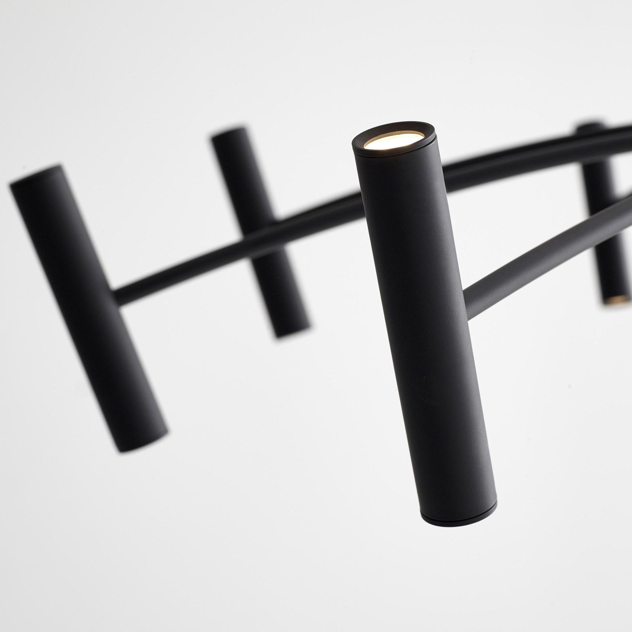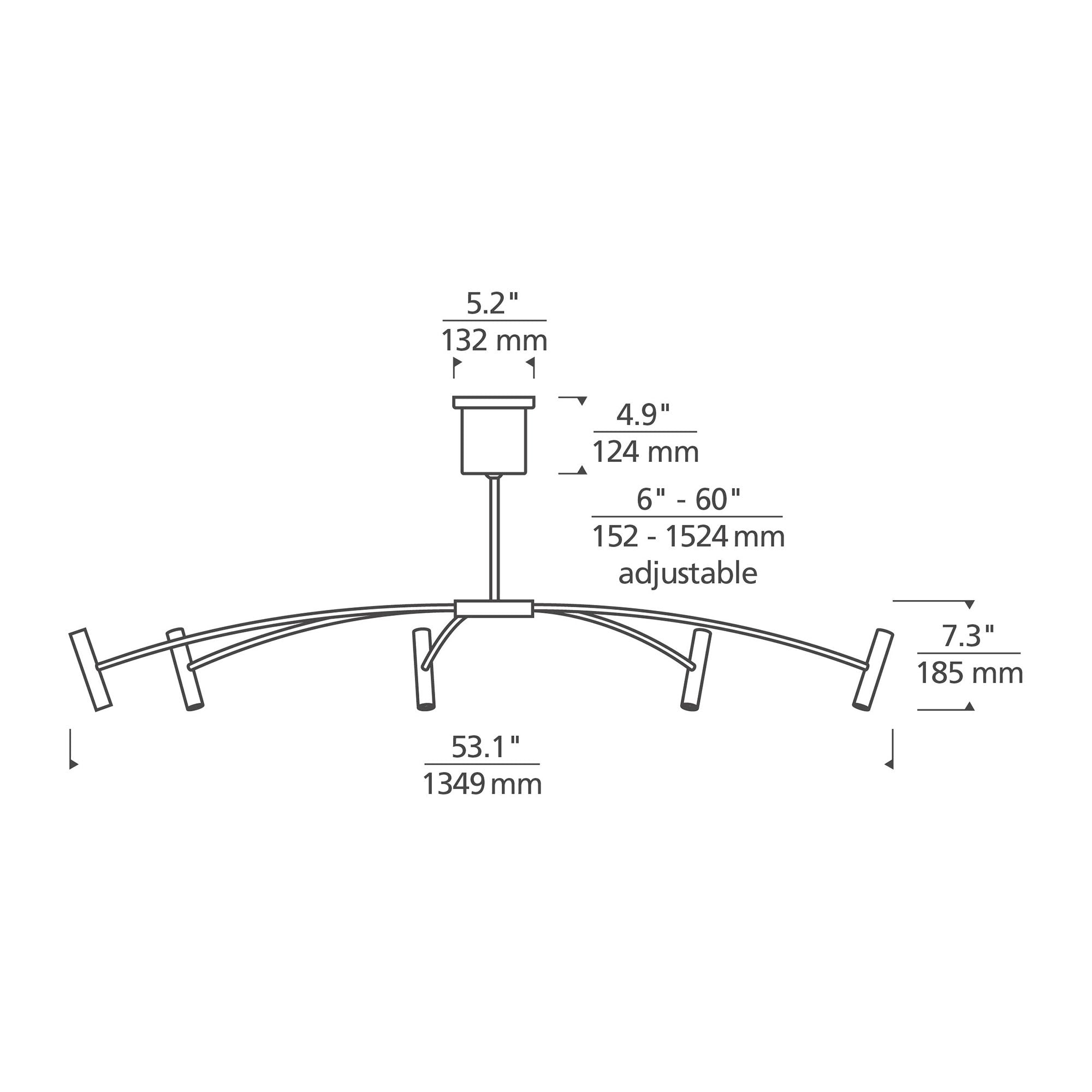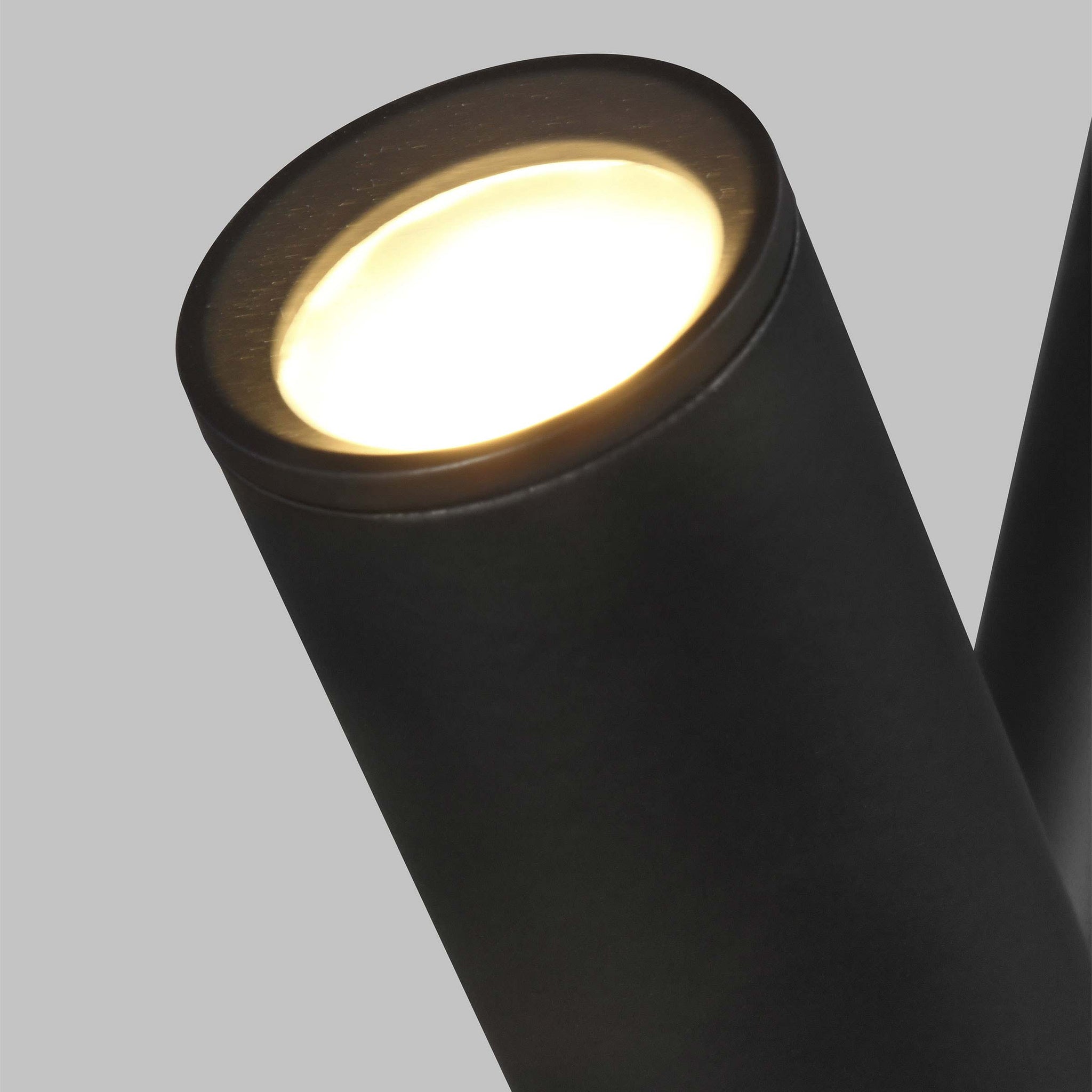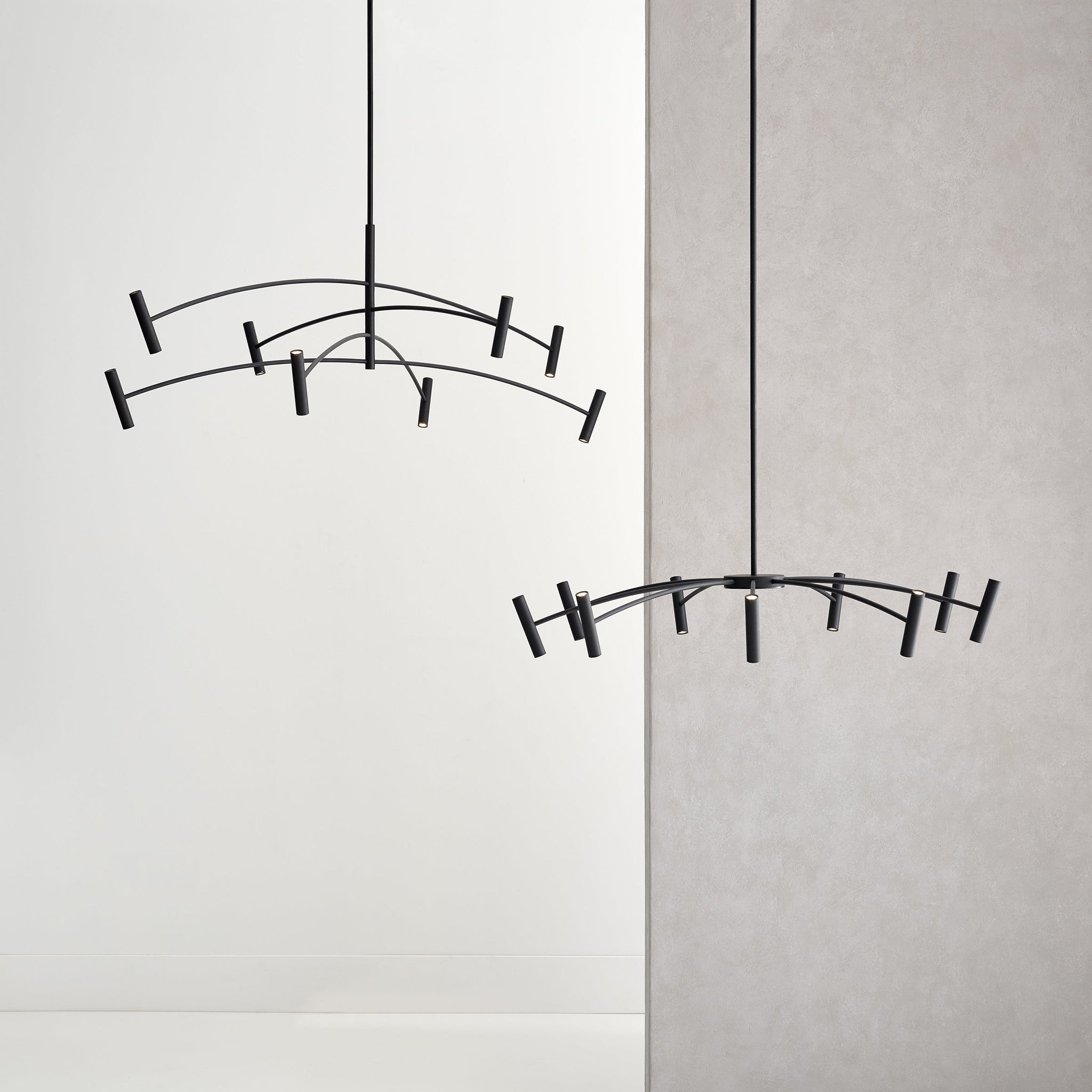 This Aerial LED Chandelier by Sean Lavin for Visual Comfort Modern features symmetrically spaced arched rods supporting a ring of slim cylindrical heads. The cylinders produce up and down illumination while concealing the integrated LED light sources. Offered in two large diameters, 40" and 55", the Aerial chandelier is highlighted in two contemporary finish options aged brass and matte black and hangs a maximum 60" with the included adjustable stems. A great piece to coordinate with the smaller scale Aerial chandelier in your open living space, dining area and foyer. Lamping options are compatible with most dimmers. Refer to the Dimming Chart for more information.