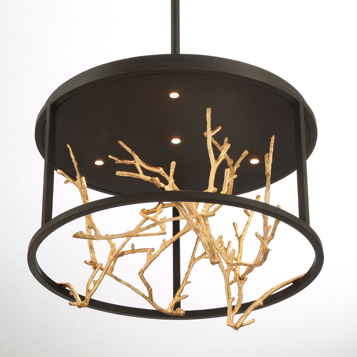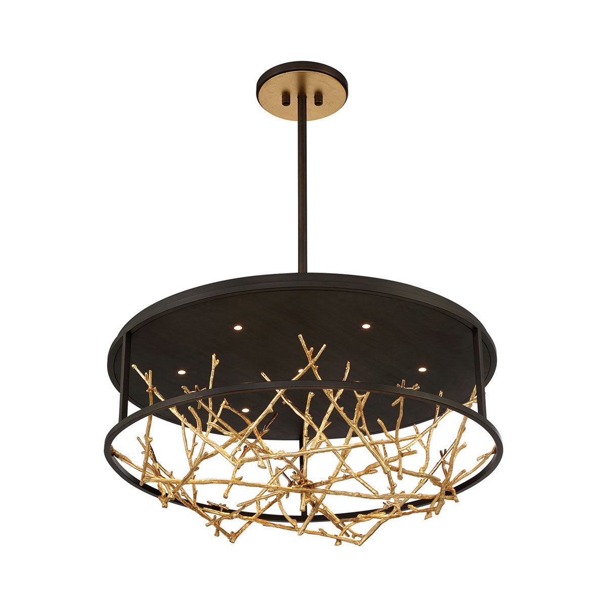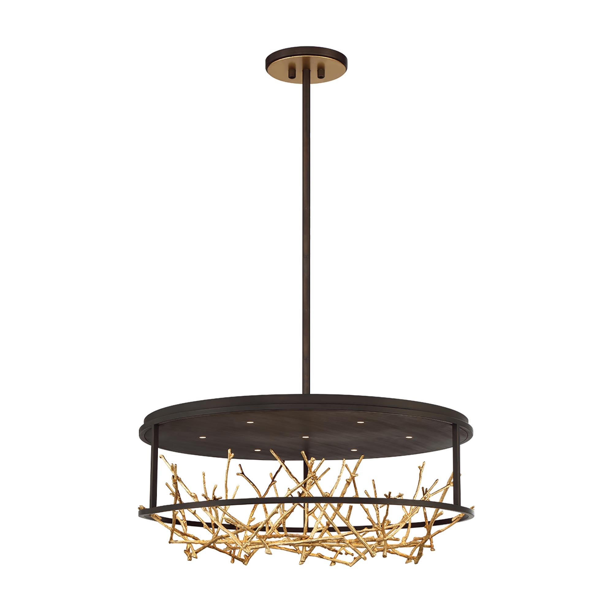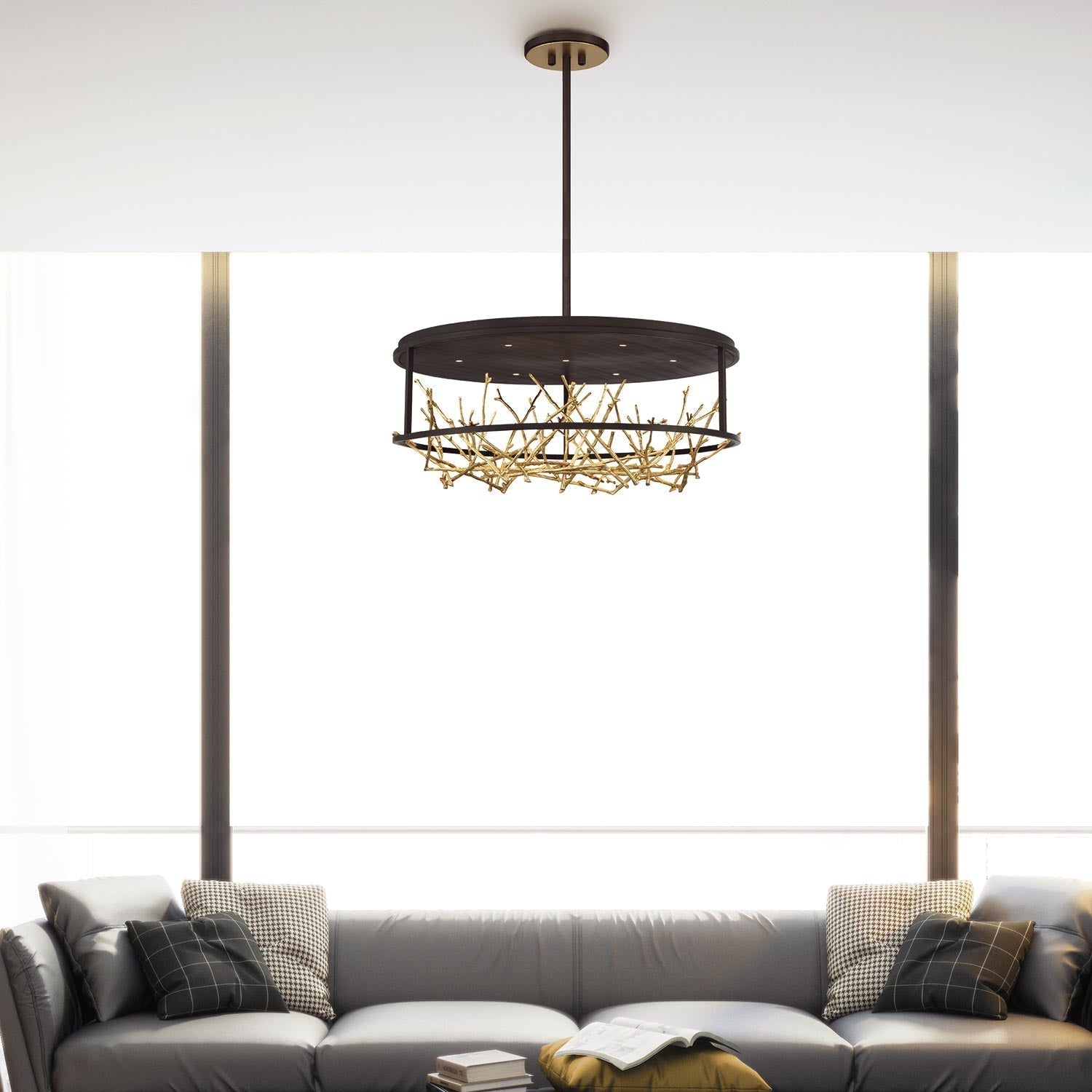 Decadence in lighting follows a path of nature-inspired artistry as the Aerie LED Chandelier from Eurofase seeks a novel approach to fixtures. Lush metal framing follows a rounded cage motif with gilded twig branch elements creating visual impact. This energy-efficient fixture becomes a conversation starter and focal point in a living room, entryway, or dining space.