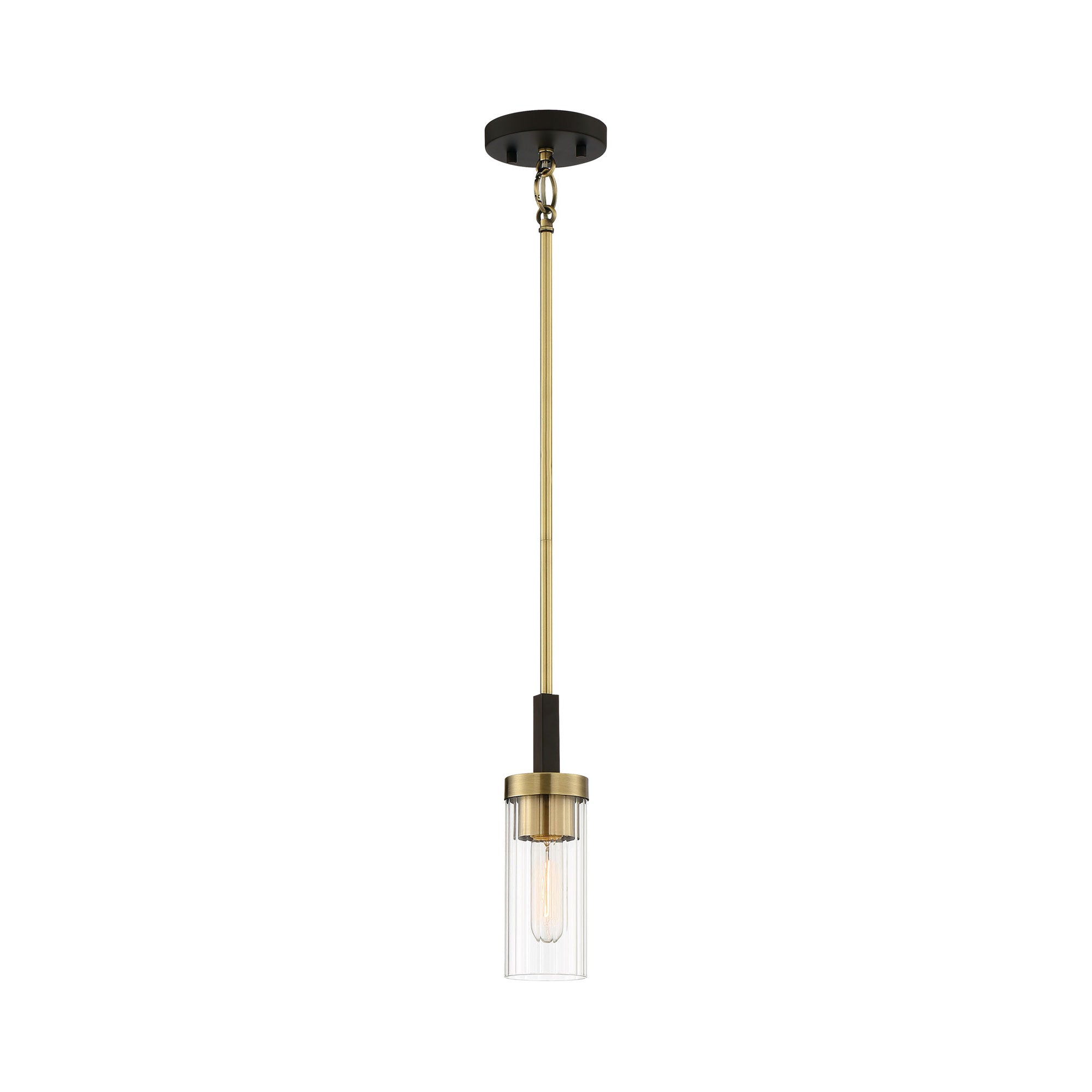 Simple and elegantly understated, the Ainsley Court Mini Pendant Light from Minka Lavery offers a chic glam vibe to bar tops and countertop spaces. A contrasting two-tone design boasts a brushed brass frame and suspension rod with an aged bronze neck accent. The textured and warbled cylindrical glass shade creates a lovely distorted view of the industrial-inspired bare bulb within.