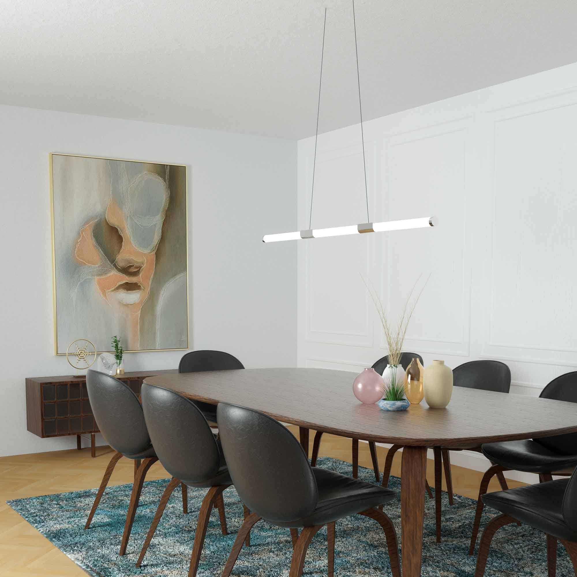 Basic design elements turn festive when the Akari LED Linear Pendant Light from Kuzco Lighting delivers soft, energy-efficient lighting where needed. Metallic finishes blend with a linear silhouette to create a versatile complement to easy-living kitchens and living areas.