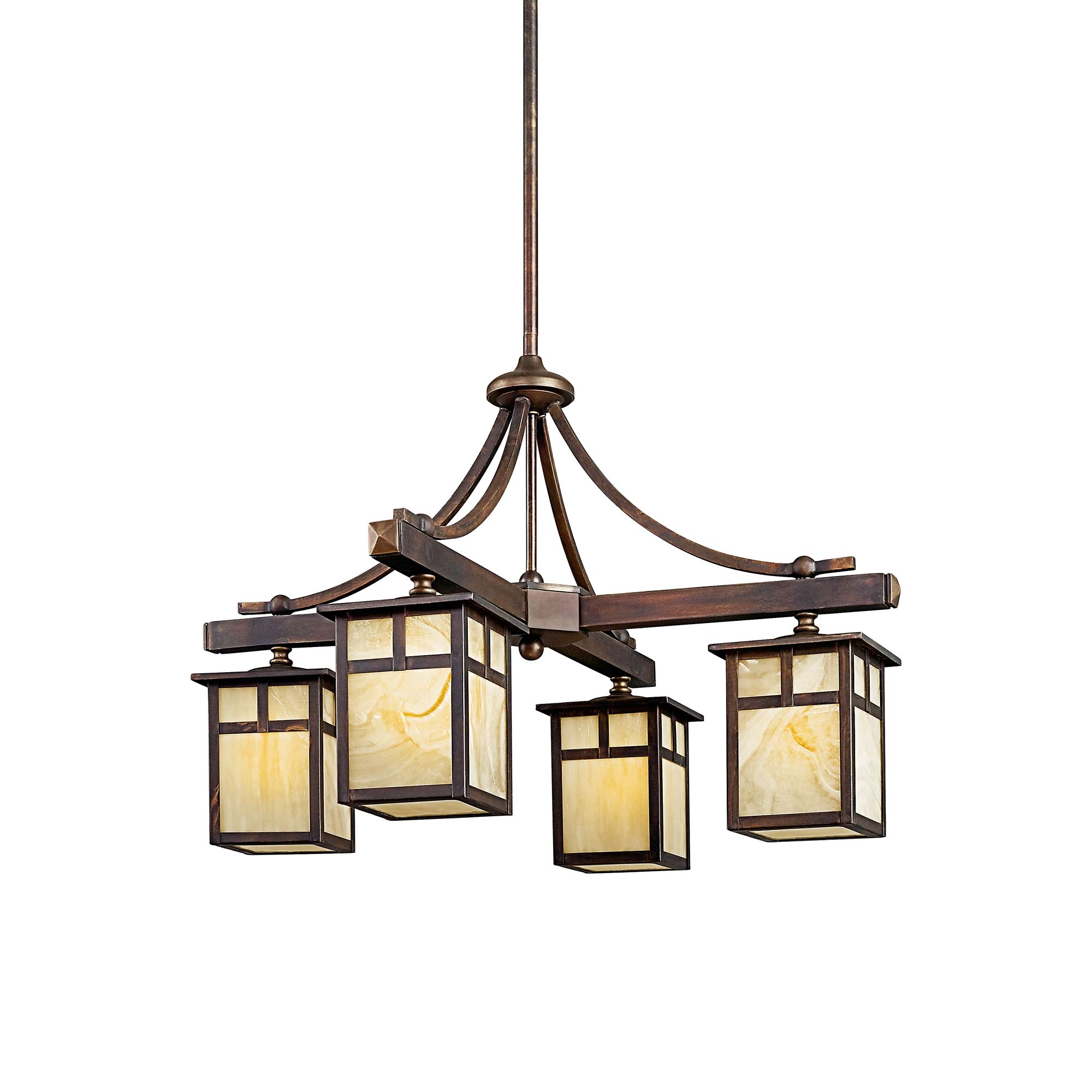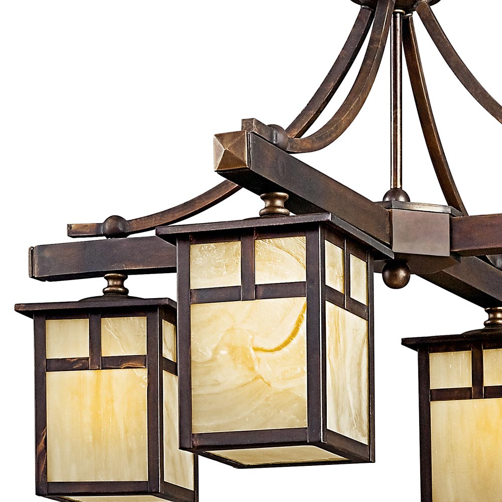 Charge up the inviting style of your home with the Arts and Crafts inspirations of the Alameda Outdoor Chandelier from Kichler. Simply charming over a spacious porch or patio living space, the chandelier pairs a rich Canyon View finish with luminous honey opalescent glass that casts a warm glow. Curved arms and decorative glass overlays complete the look with detail and depth.