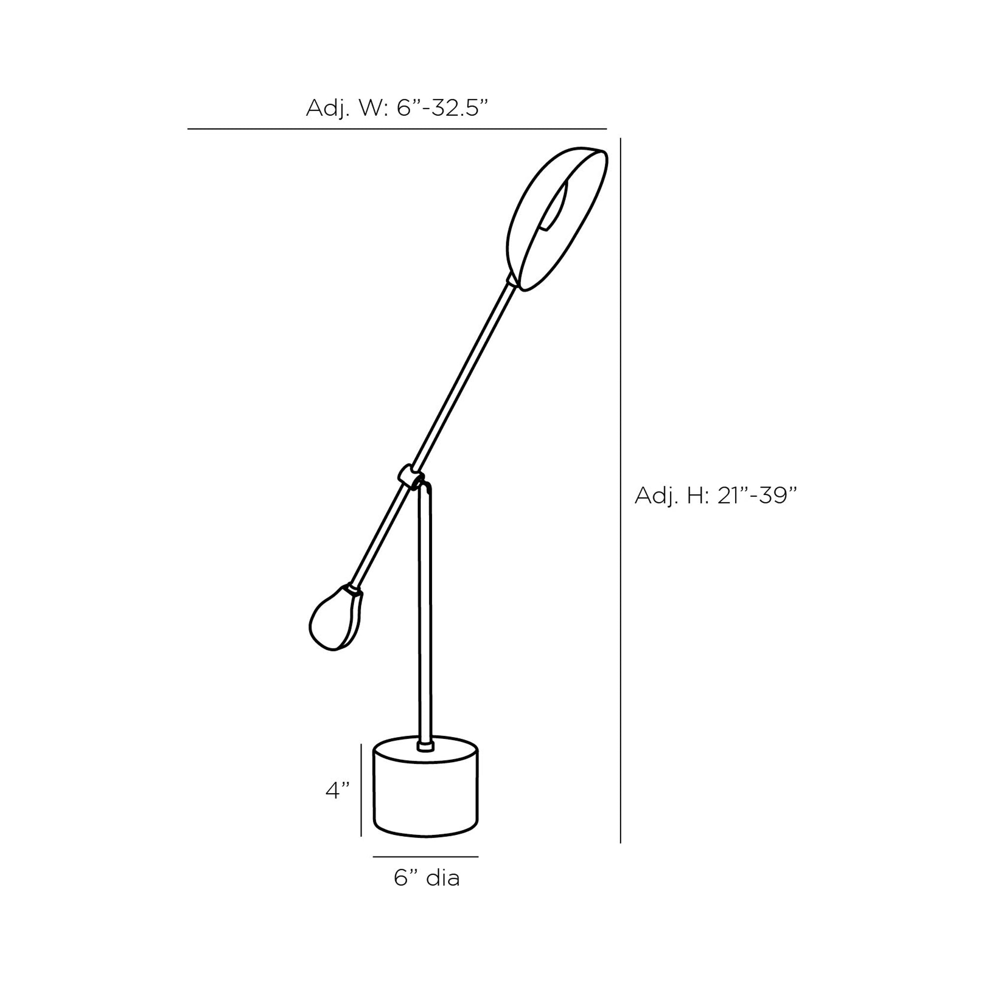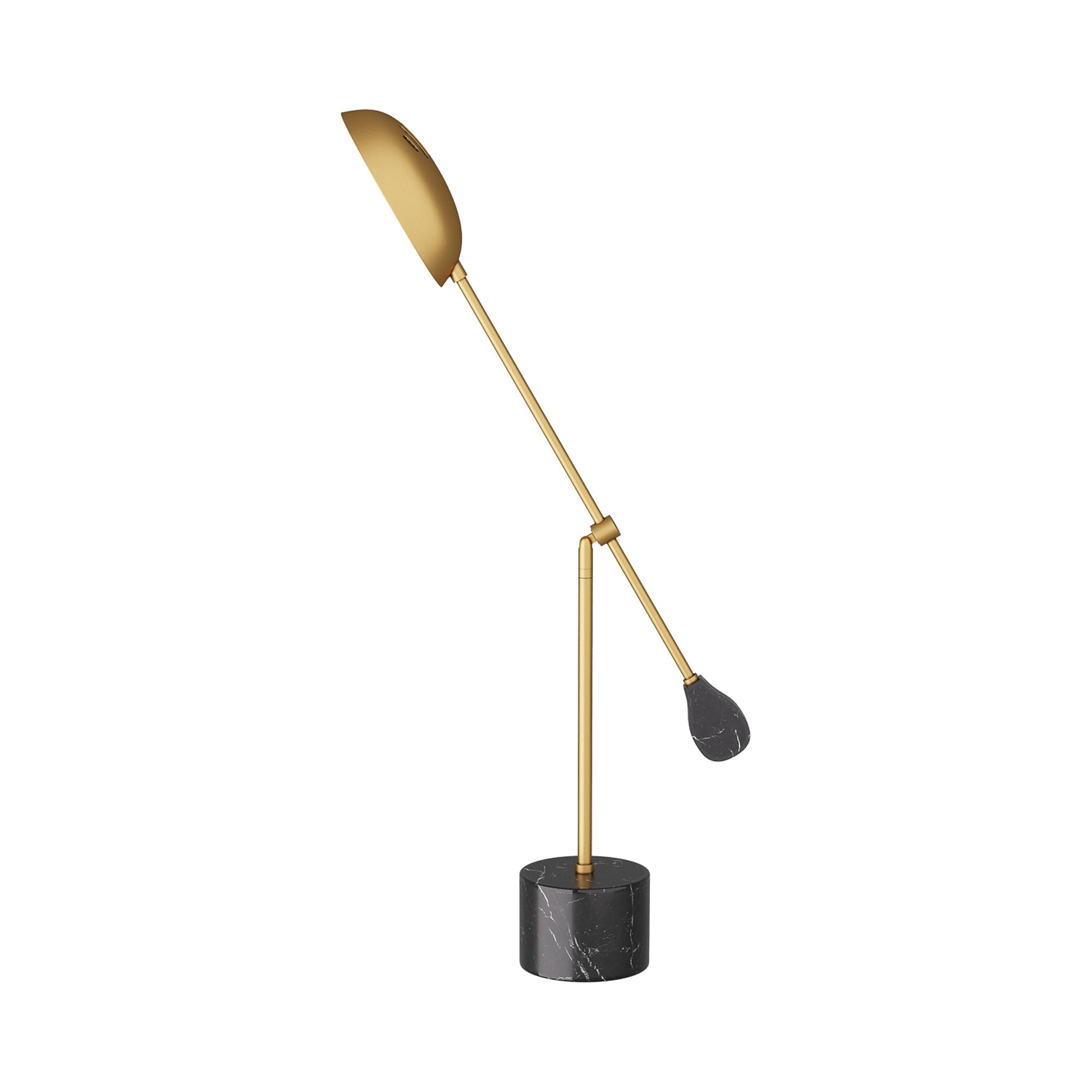Tipping the scales on design, the Alaric Table Lamp from Arteriors demonstrates the aesthetic power of asymmetry and gravity-influenced silhouetting. Lush antique brass construction with a pivoting arm capped by a charming bud-shaped shade. Dramatic black marble accents add contrast and drama.