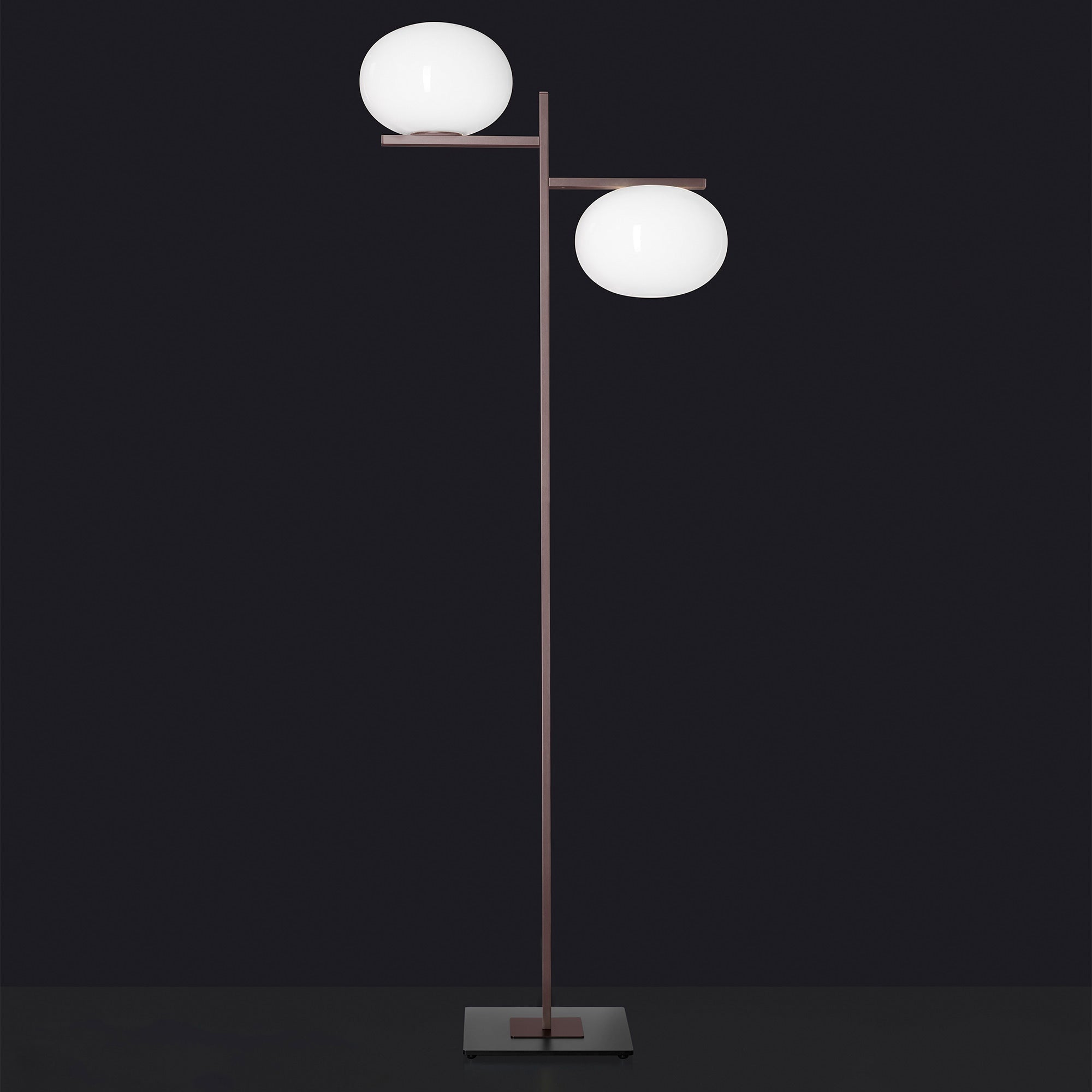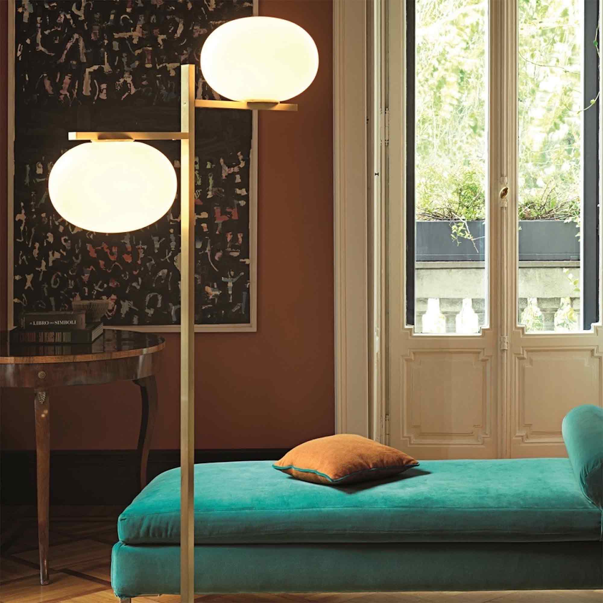 The concept of Alba starts with a very simple element: the designer’s imagination was inspired by a drop of water – which she puts to use in different ways, depending on the model. The Alba floor lamp has a large rectangular-section stem with a satin brass finish arises from an anthracite base and an arm that branches off from the top with a sphere suspended underneath it.