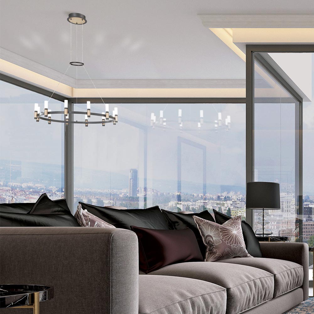Classic circular silhouetting embellishes the drama-influenced look of a light fixture with promise. Ideal for punctuating a theatrical mix of futuristic and farmhouse-industrial, the Albany LED Ring Chandelier from Eurofase delivers an unforgettable element along with energy-efficient lighting.