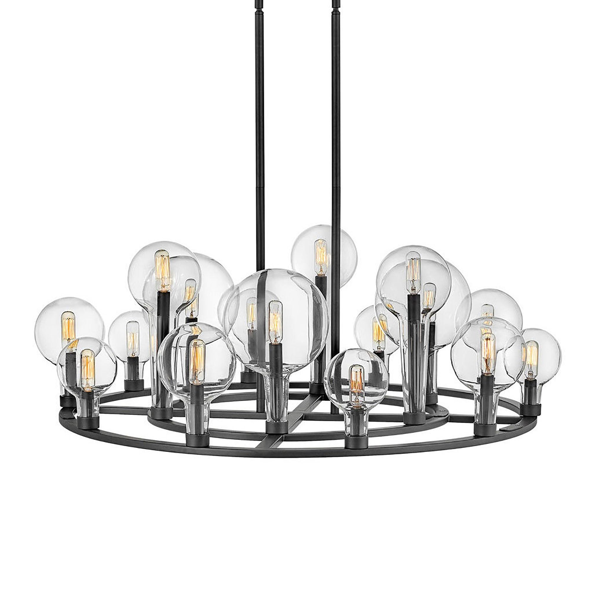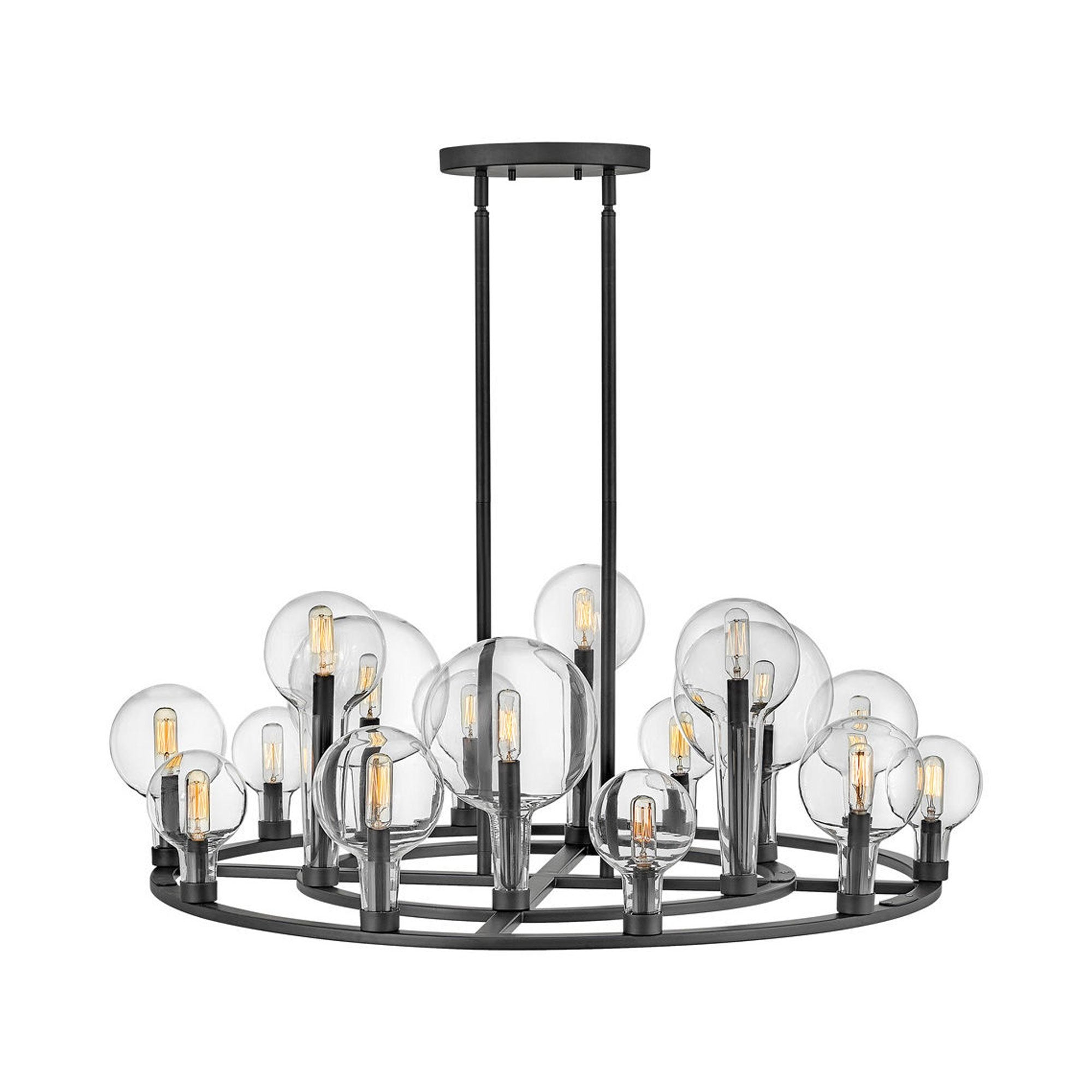 Inspired by the vintage flasks of a chemistry classroom, Alchemy Chandelier is a unique statement piece. Its tapered globes instantly stand out in a variety of spaces, while the Black open-cage silhouette enhances its sophisticated edge.