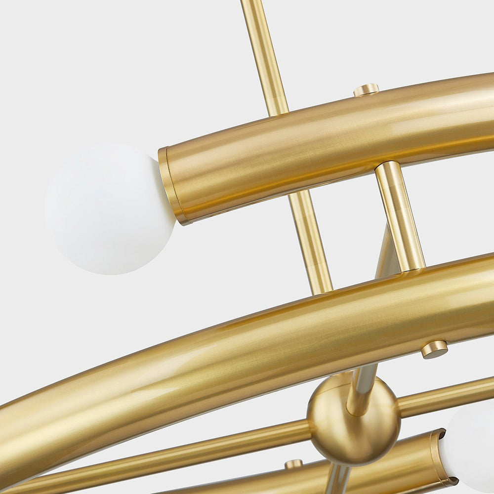 A classic ring chandelier is deconstructed to create the bold look and feel of the Allegra Chandelier from Mitzi. Four semi-circle frames are crafted in metal, receive a warm aged brass finish and are capped on each end with petite globe lights, offering an elliptical effect that's artistic and contemporary, perfect for a stylish entry, living or dining room.