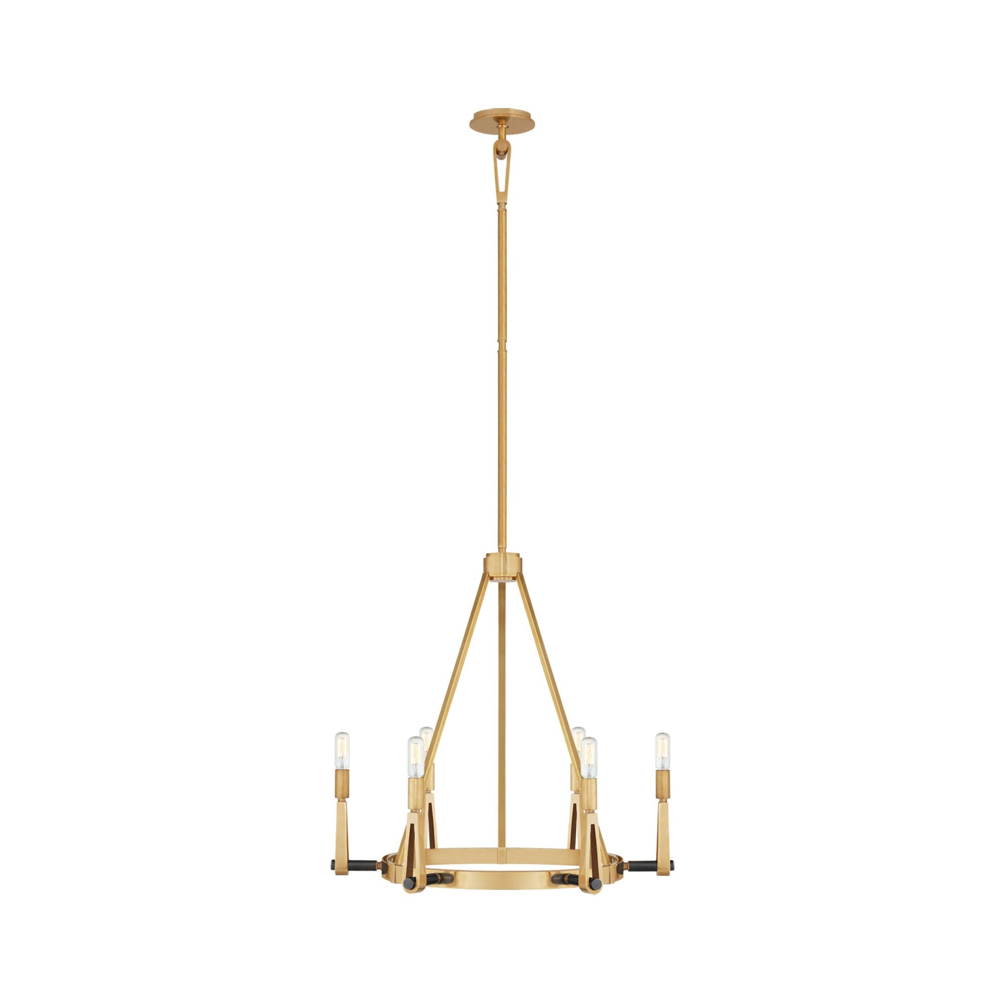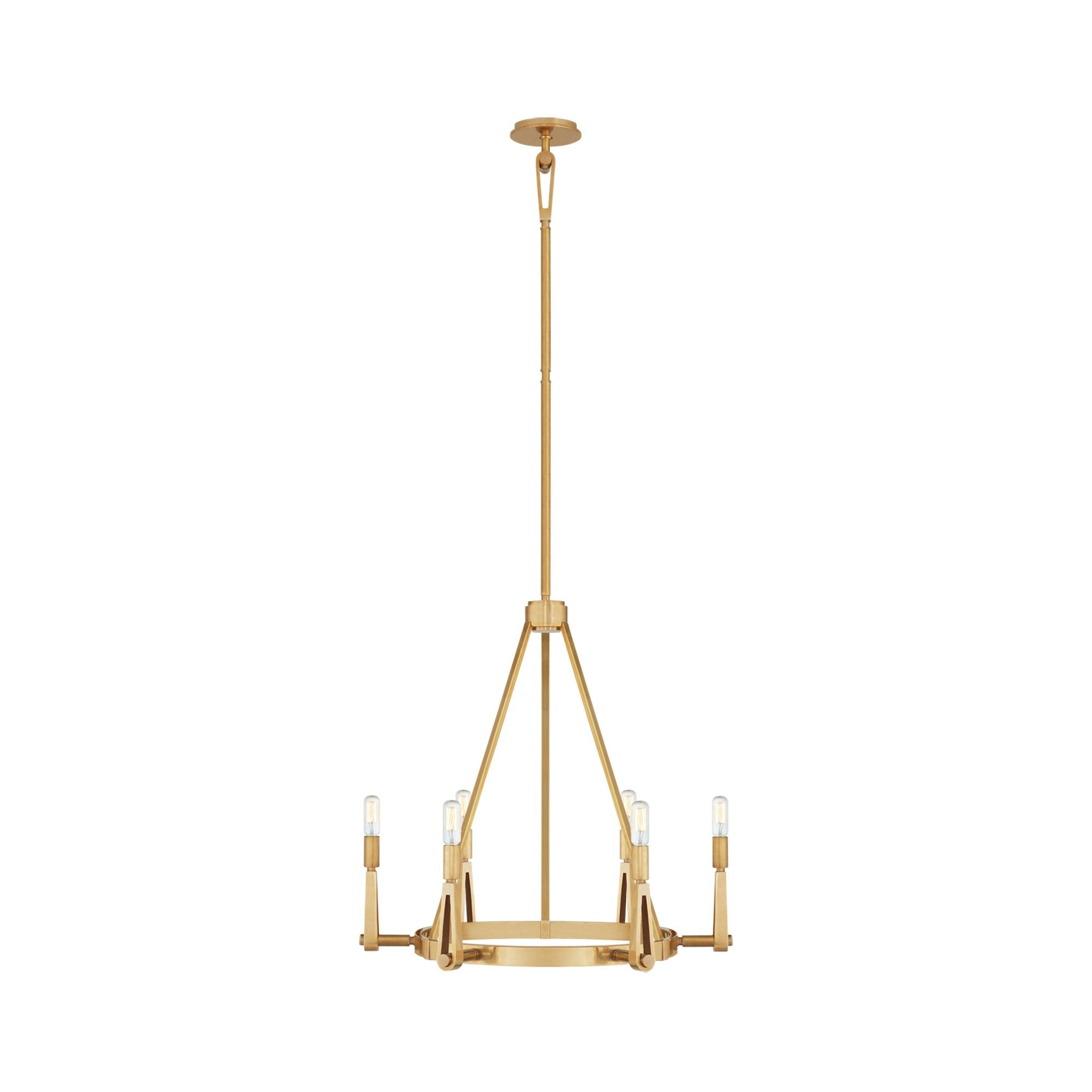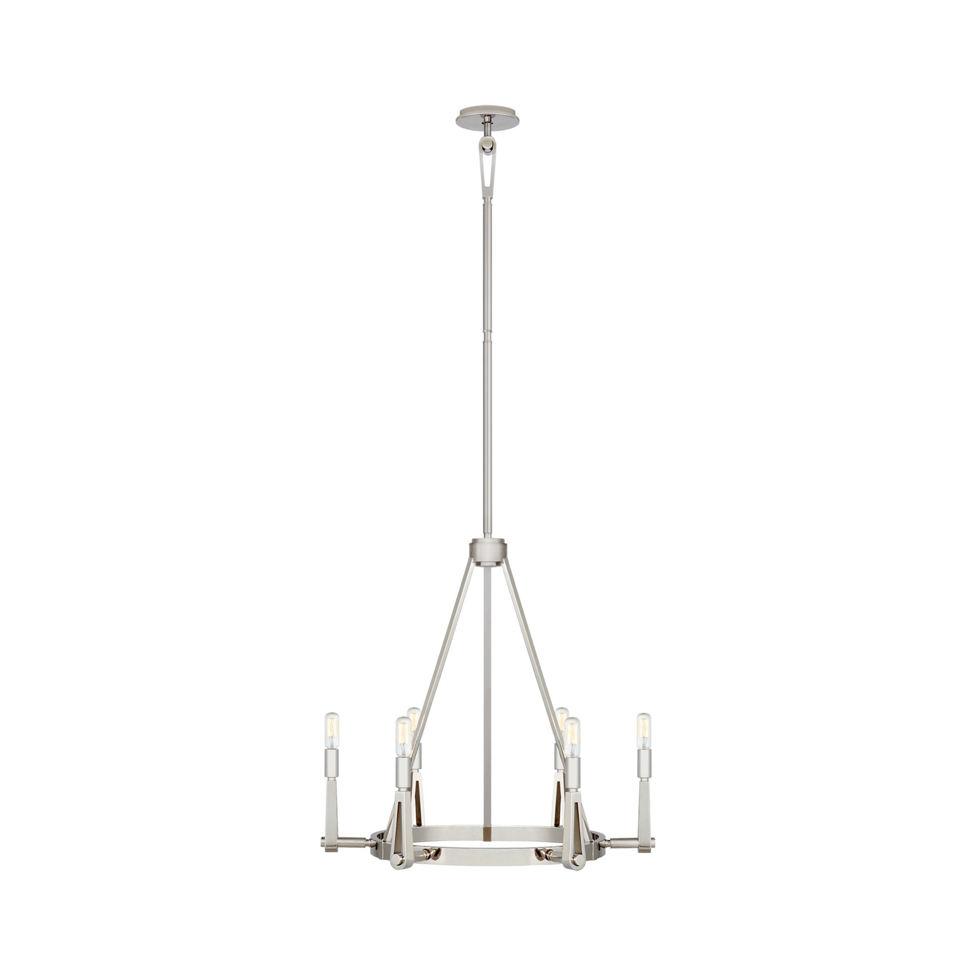 The Alpha Chandelier from Visual Comfort Signature reflects a modern version of Euro castle-inspired flavor, keeping its build slender and stylish. This decadent light blends geometric shapes with a circular frame showcasing tall, slender candelabra-style bulb sockets.