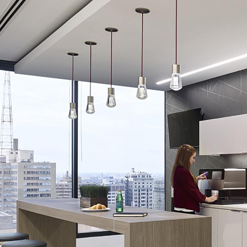 The Alva LED Pendant Light, by Sean Lavin for Visual Comfort Modern, is a classic Edison-style squirrel cage lamp reincarnated as a modern socket and cord-style LED pendant light. Alva features a powerful downward-firing LED that is smartly hidden within the "socket" then combined with a solid "bulb" of pure optic crystal. Intricately detailed "filaments" are laser-etched into the crystal for a visually intriguing light fixture. With a modern take on the cord-style trend Alva is customizable to your style. Choose from three finishes and eight cord colors to match any décor in your kitchen, bathroom and living room. Also available as a 3-, 7-, and 11-lite chandeliers (canopy included).