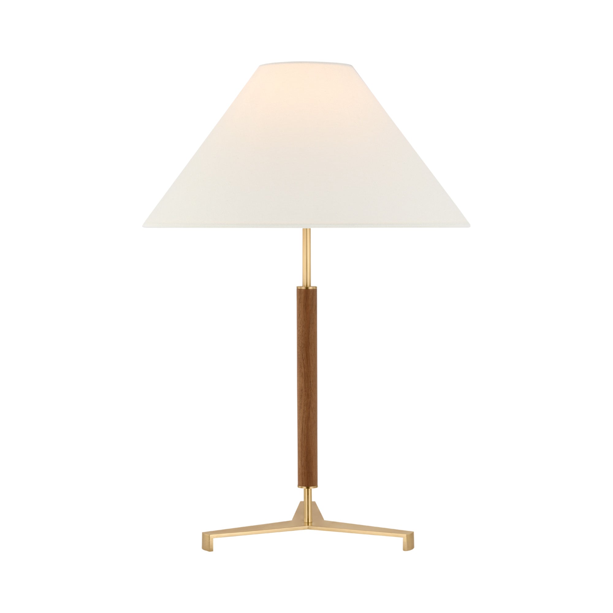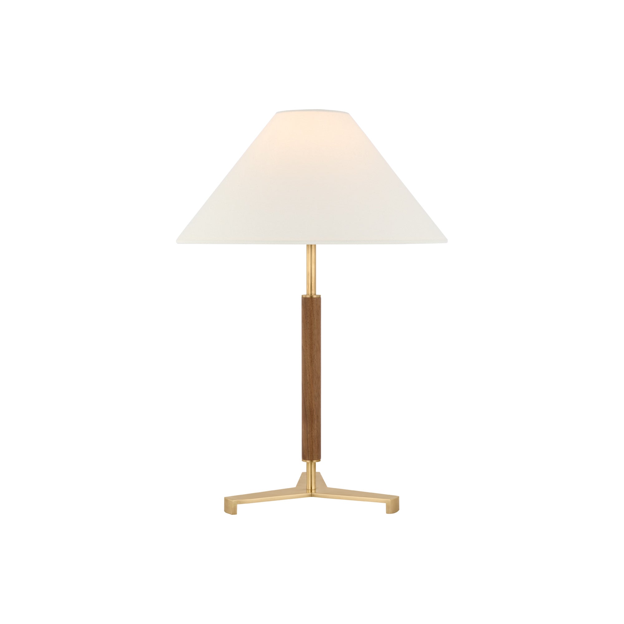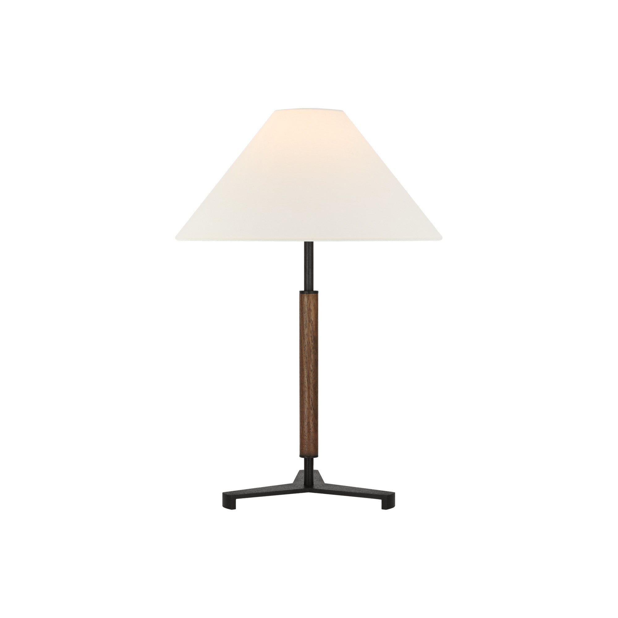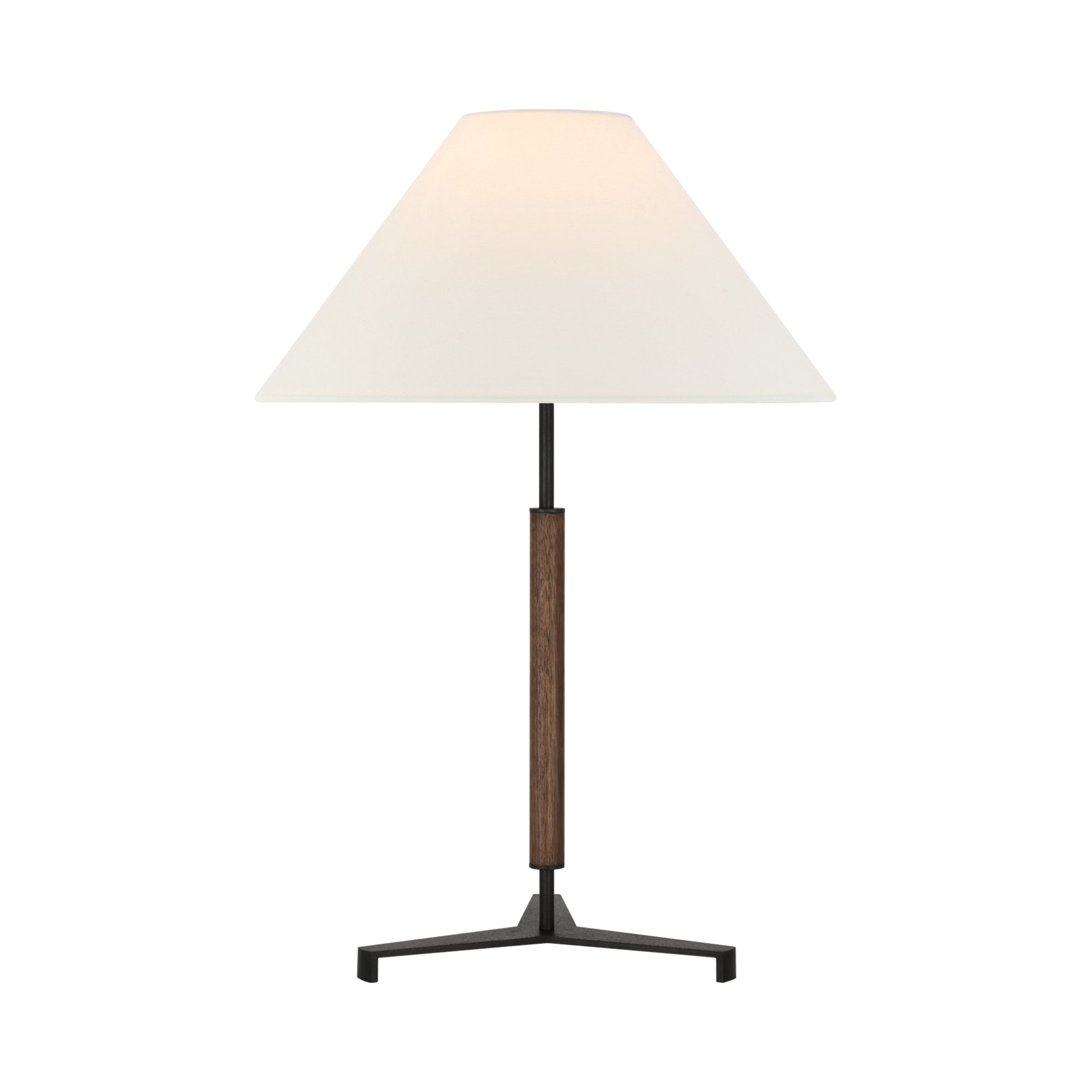 Low-key design transitions into a chic look as the Amaya Table Lamp from Visual Comfort Signature delivers a level of elegance you're seeking for a living space or bedroom. Metal framing includes a tripod base, with a wood sleeve creating divisional visual appeal. This lamp's silhouette is heightened by a soft linen hat shade.