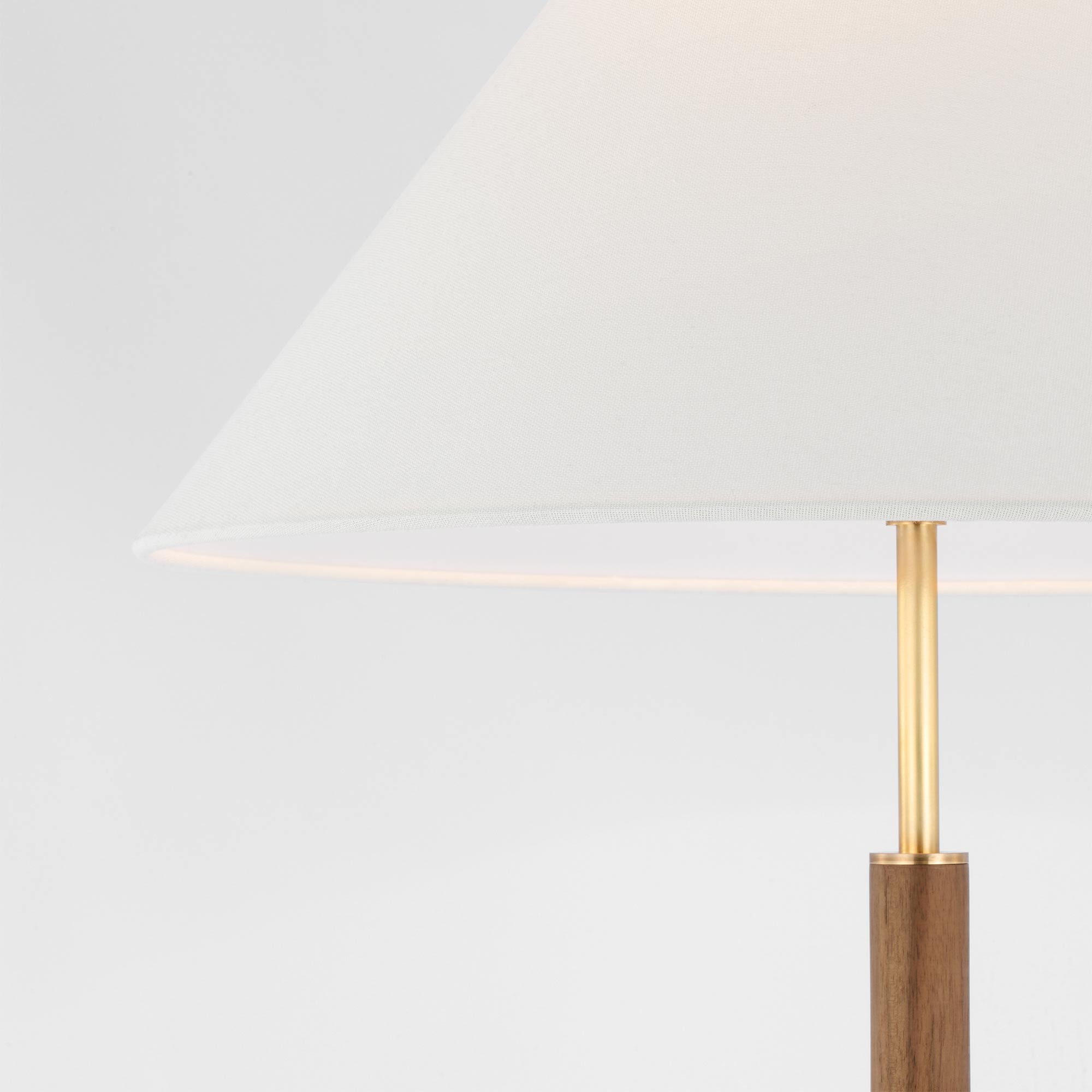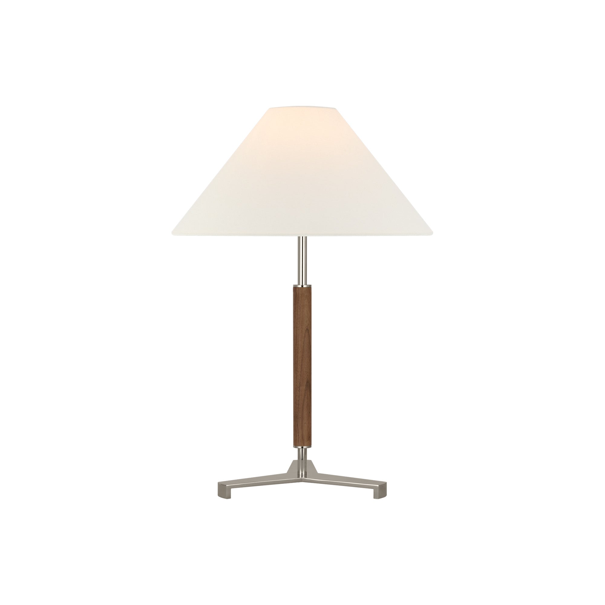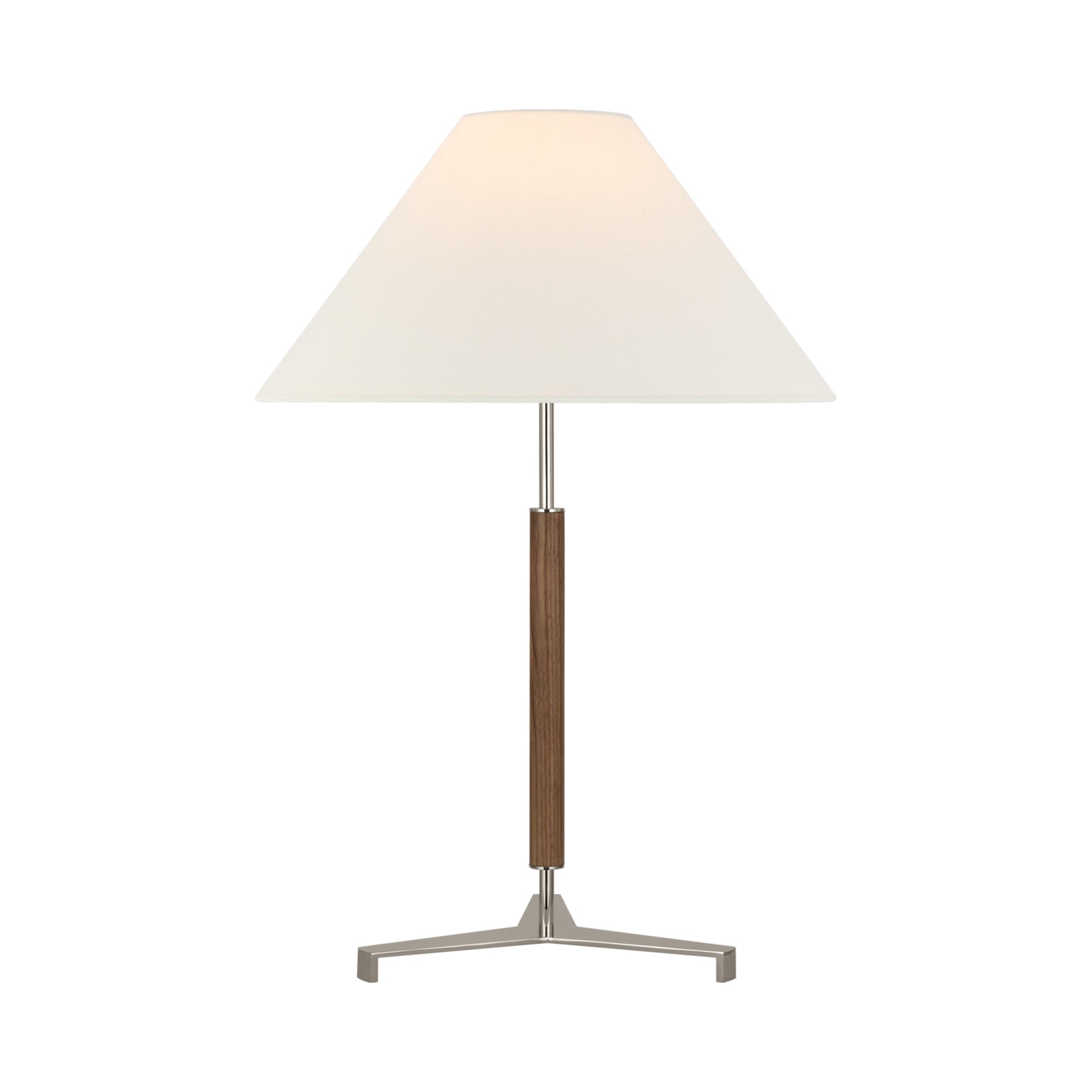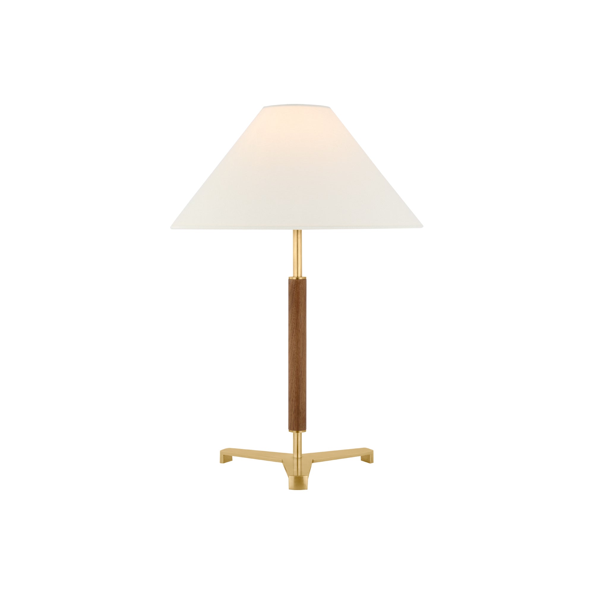 Low-key design transitions into a chic look as the Amaya Table Lamp from Visual Comfort Signature delivers a level of elegance you're seeking for a living space or bedroom. Metal framing includes a tripod base, with a wood sleeve creating divisional visual appeal. This lamp's silhouette is heightened by a soft linen hat shade.
