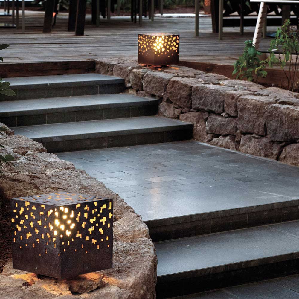 Lend landscapes and verandas an eye-catching, dazzling light show with the AMS Outdoor Floor Lamp from B.Lux. An artsy metal cube with geometric punch outs illuminates its surroundings, accenting grass, stonework and other natural textures or architectural elements for a breathtaking modern display.