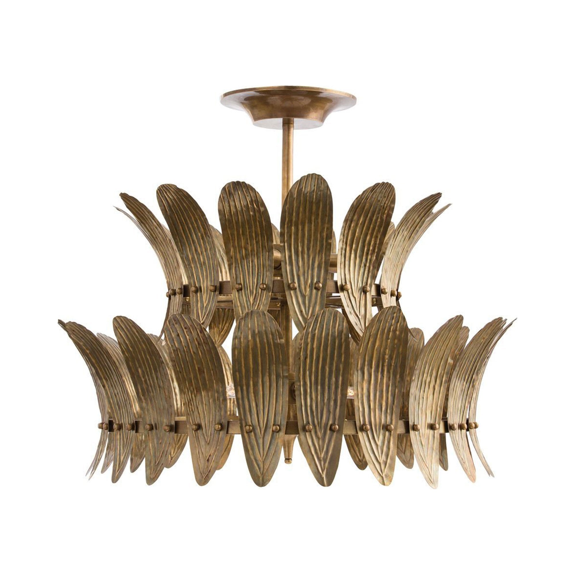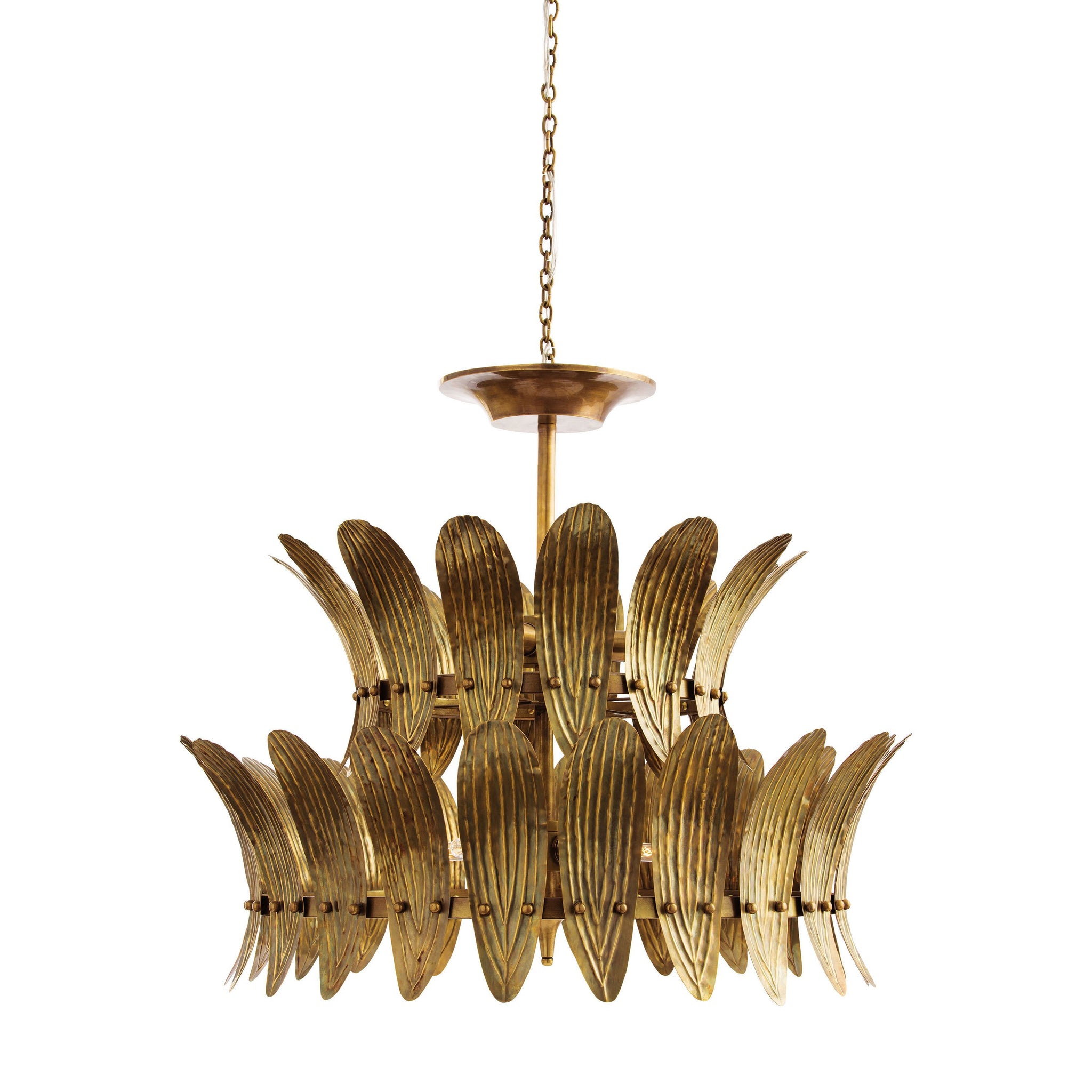 This eight-light chandelier features a stunning arrangement of gently-curved plates embossed with a leaf motif and finished in vintage brass. This gilded piece has a traditional and feminine feel that won't overpower a streamlined space. A frosted acrylic diffuser softens the light.