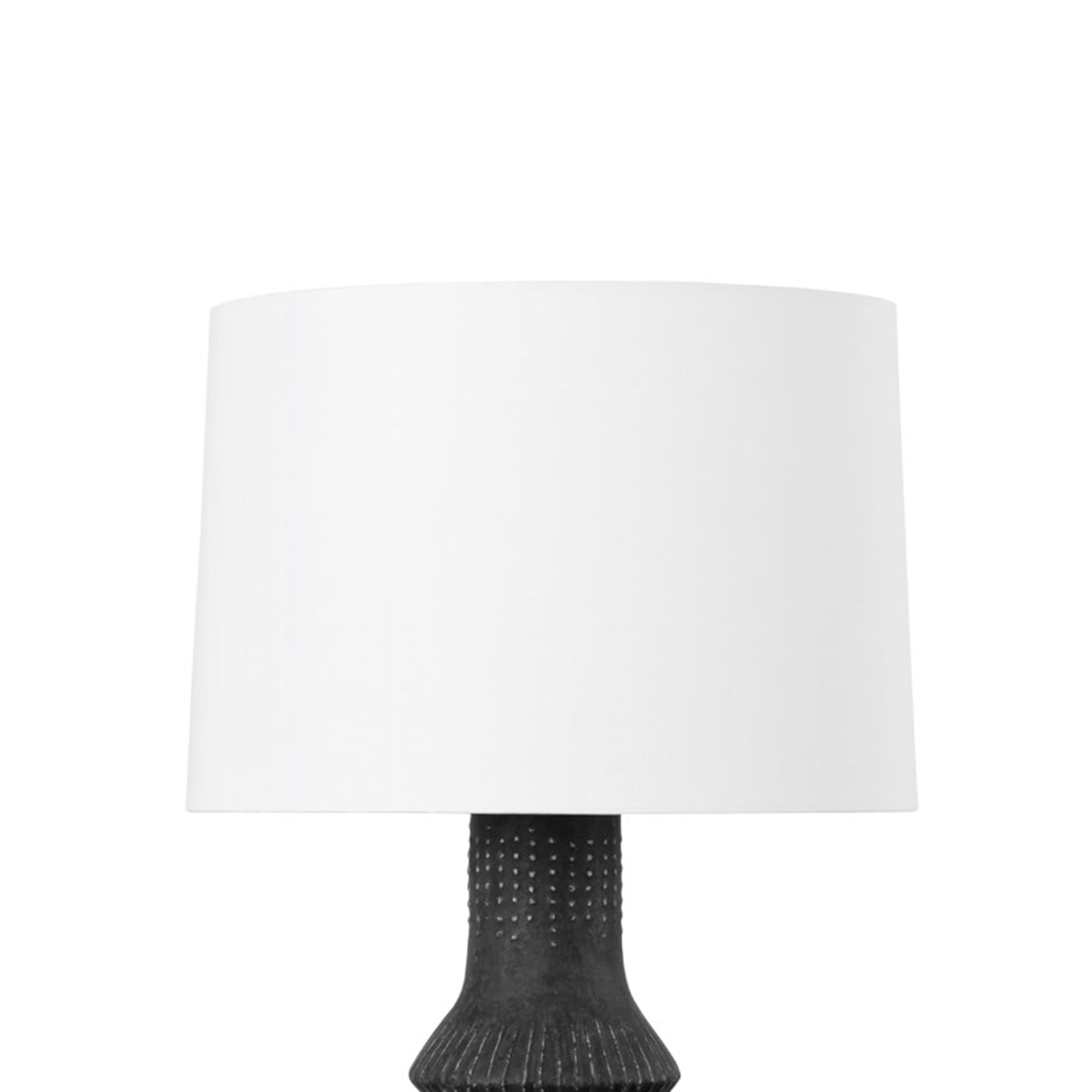 Texture is a mainstay that elevates the Ancram Table Lamp from Hudson Valley Lighting to chic status in any space, adding a dramatic aesthetic and bold style. Ceramic construction delivers an exceptionally shapely silhouette with gritty vertical ridges that catch light emanating from a single socket. Angles and curves commingle with contemporary energy, contrasting its black finish body with a crisp white linen shade.