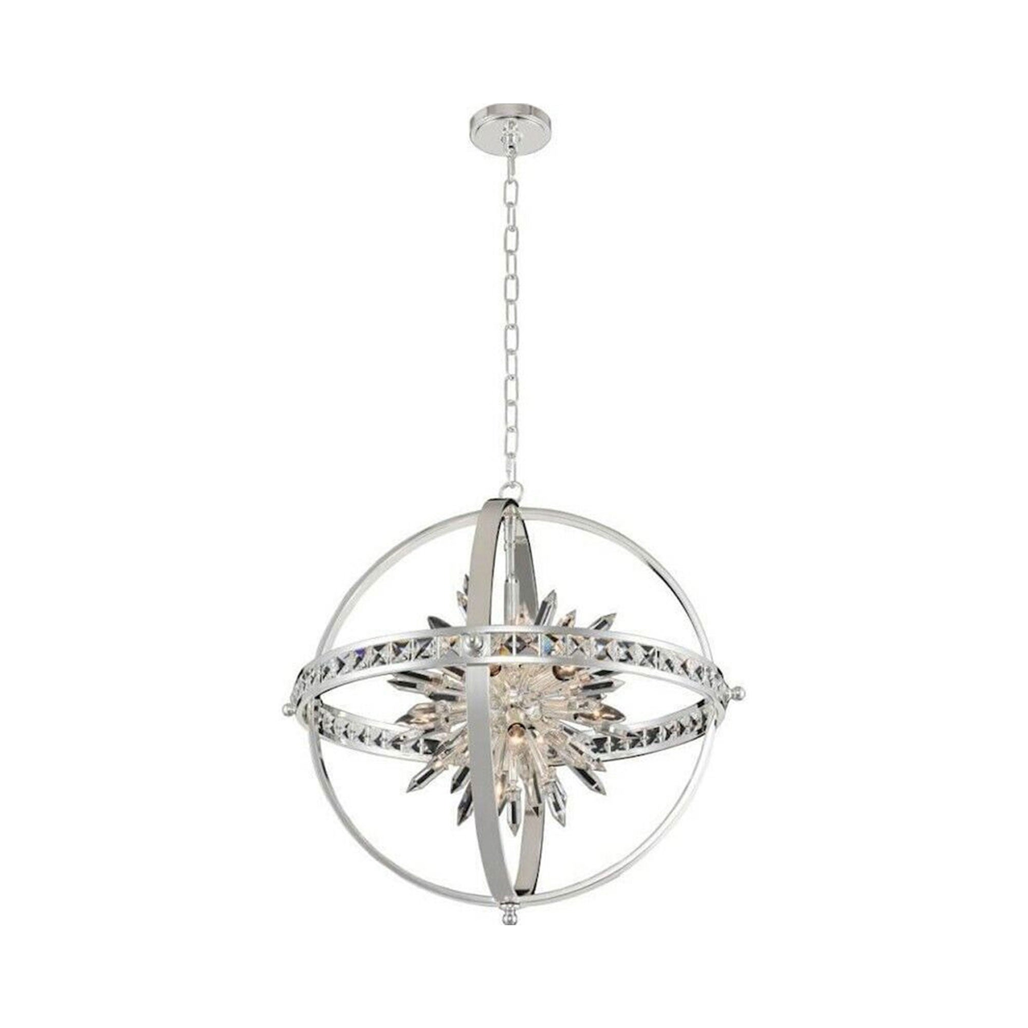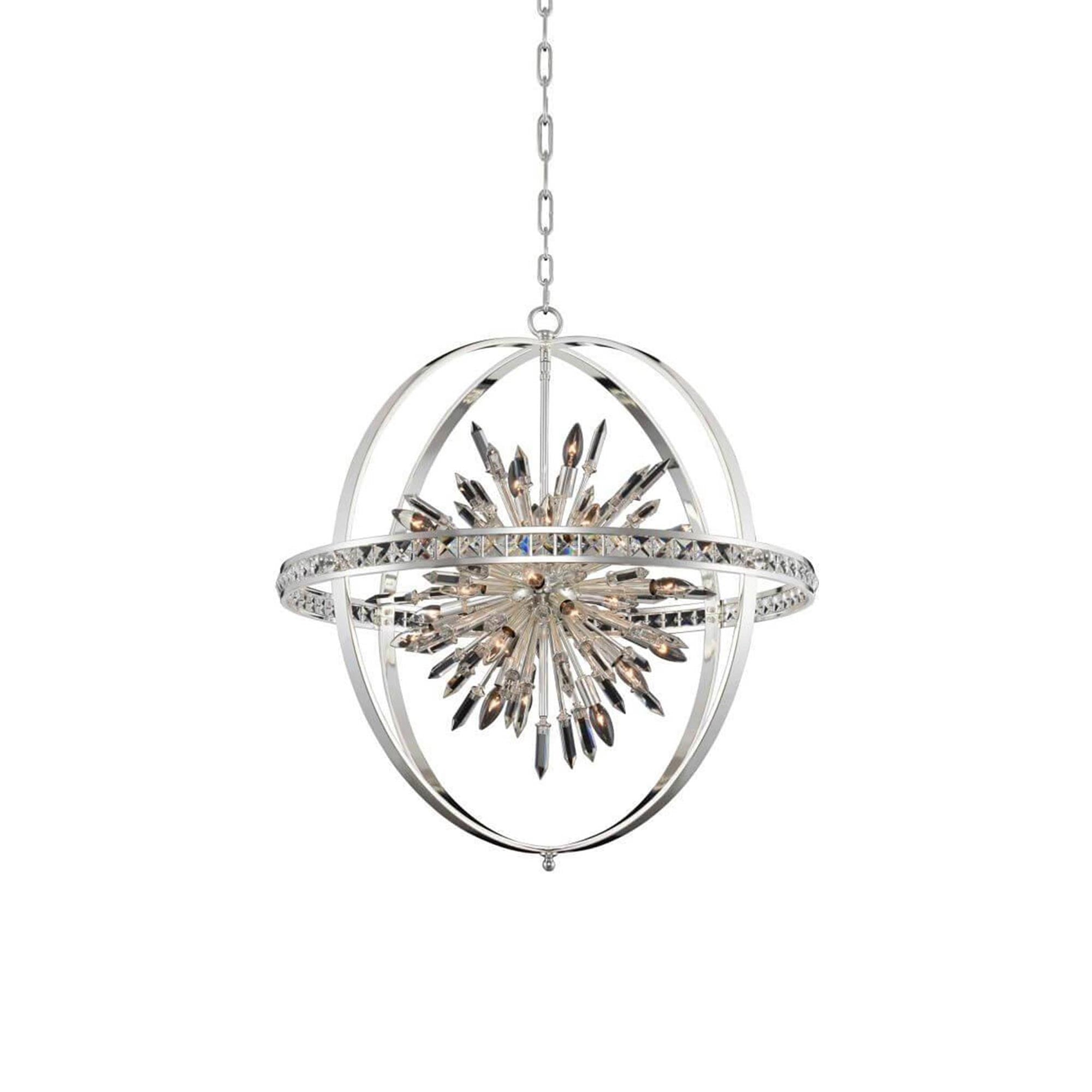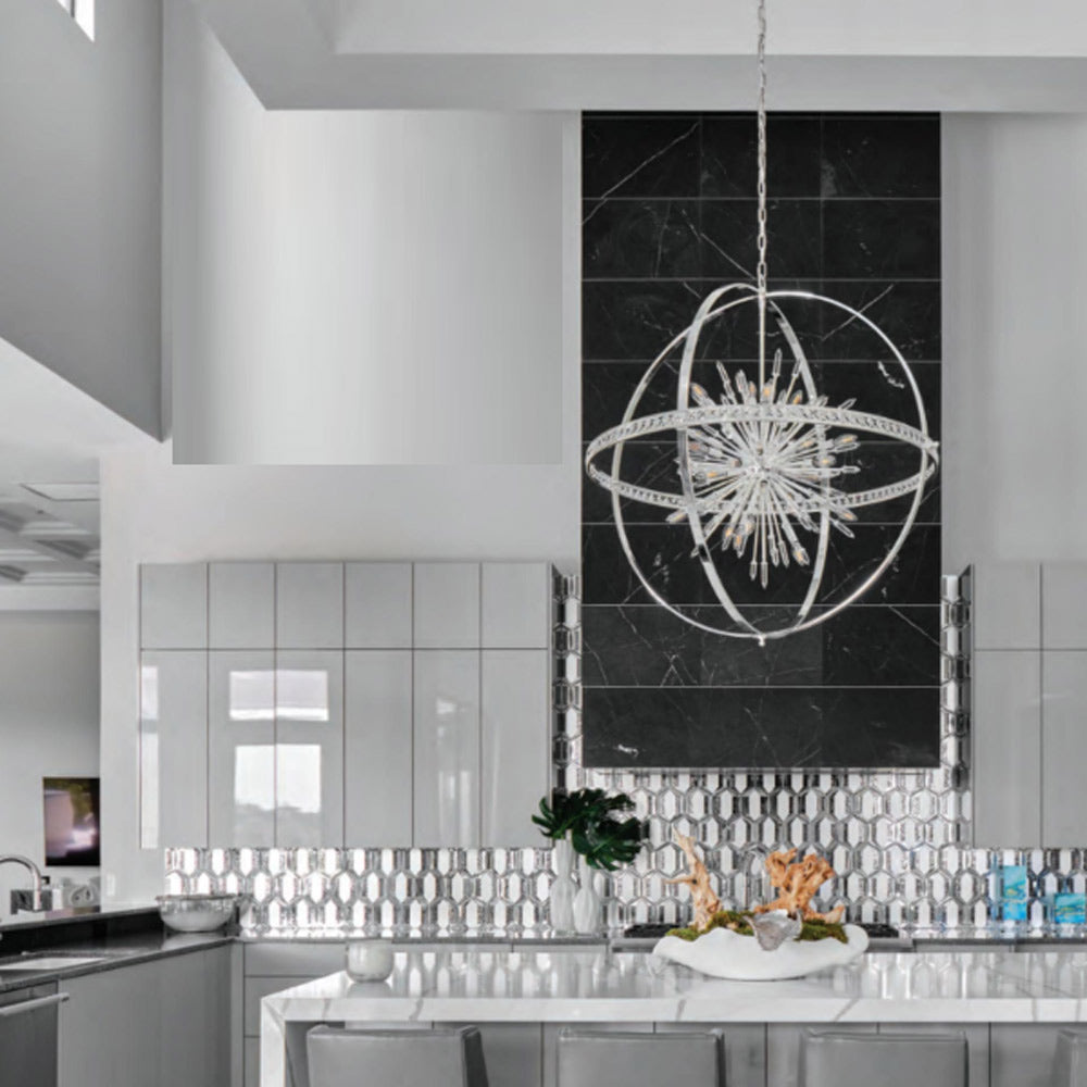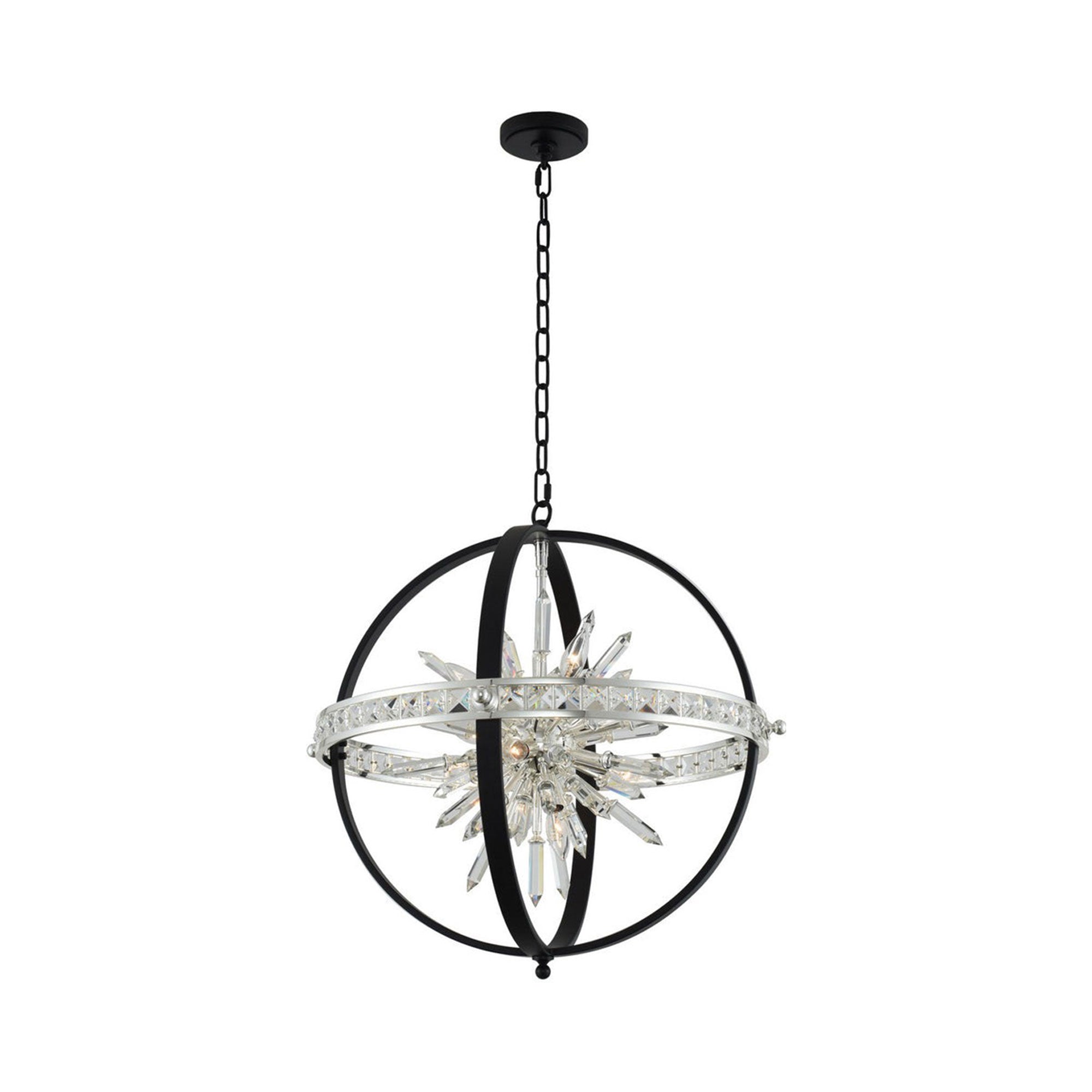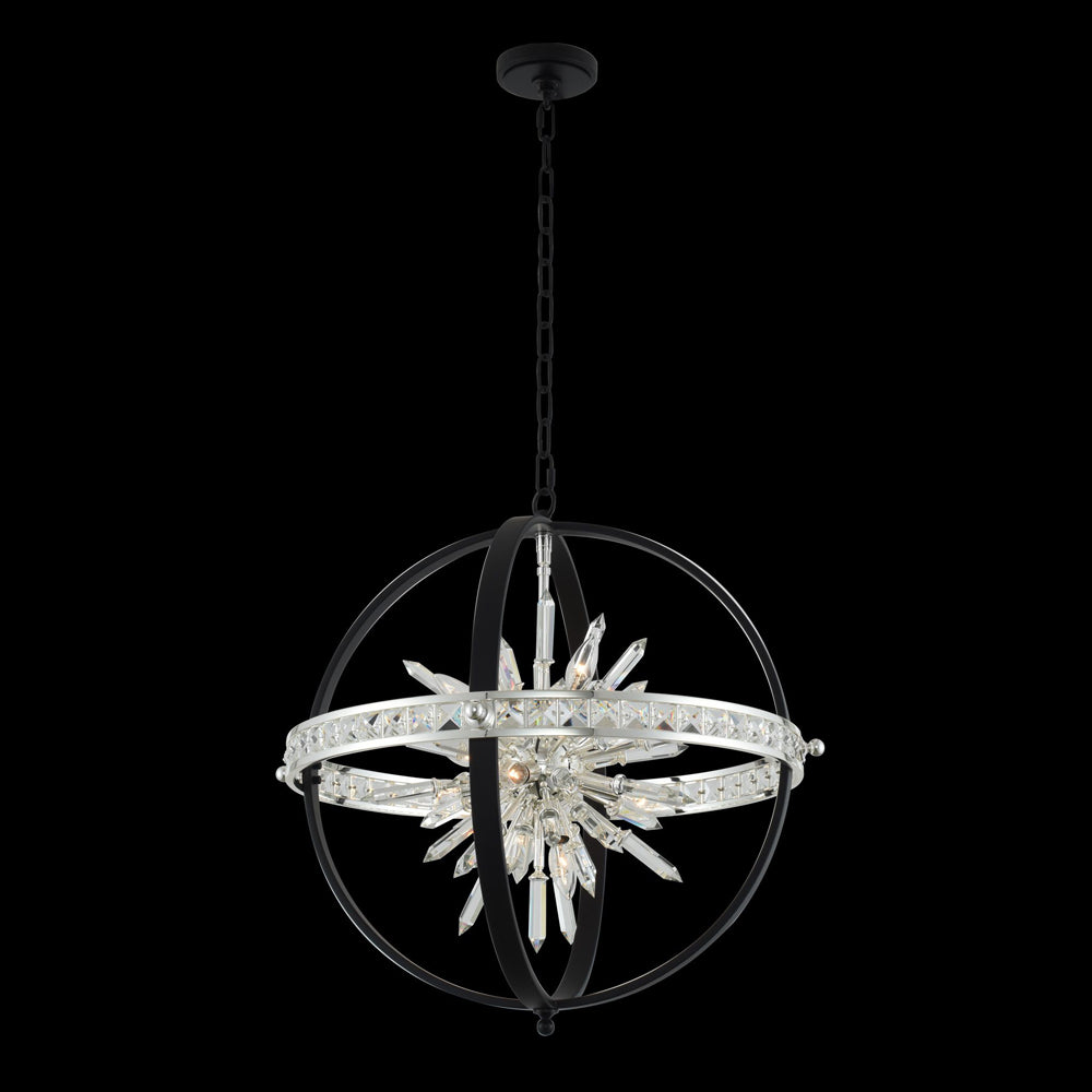 Orbital rings and a glittering jeweled band create glamorous structure for the starburst center of the Angelo Chandelier from Allegri. Dynamic over a dining table or in your entry, the pendant reflects glittering, modern sophistication that elevates surrounding decor to new heights. Enjoy the eye-catching elegance of spiky Firenze Crystals that highlight a dramatic design.