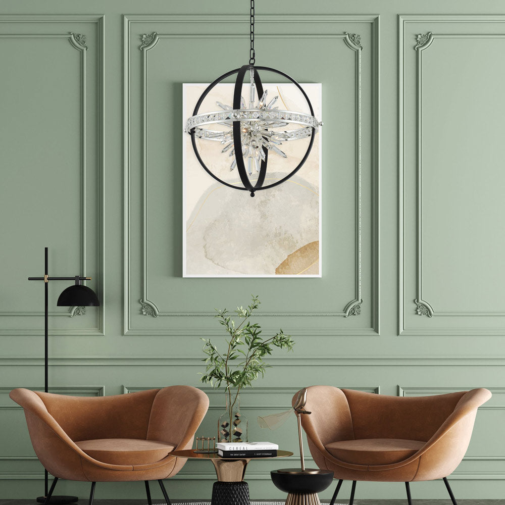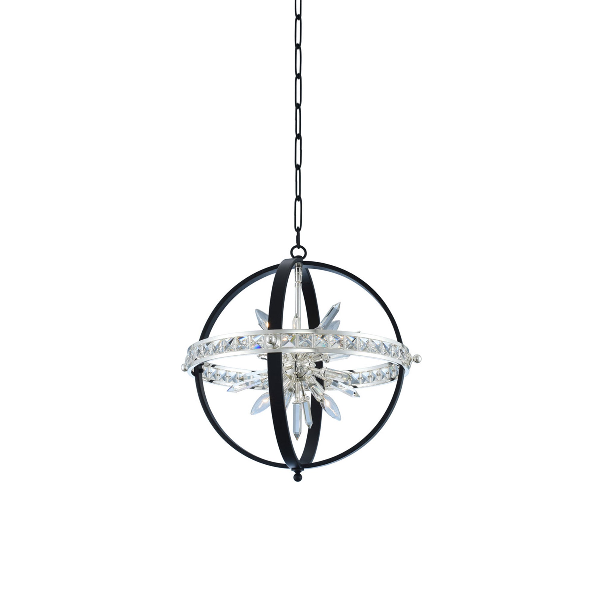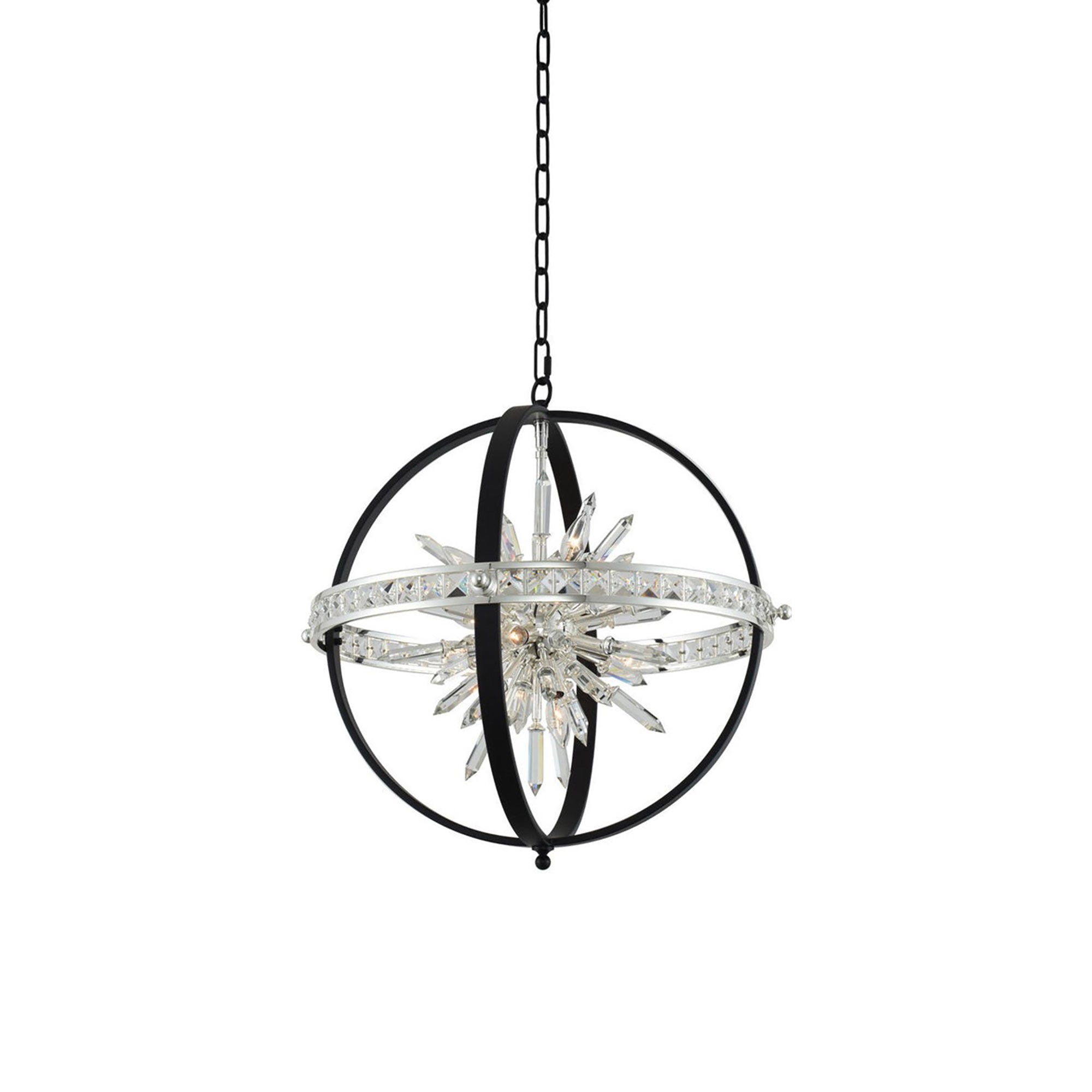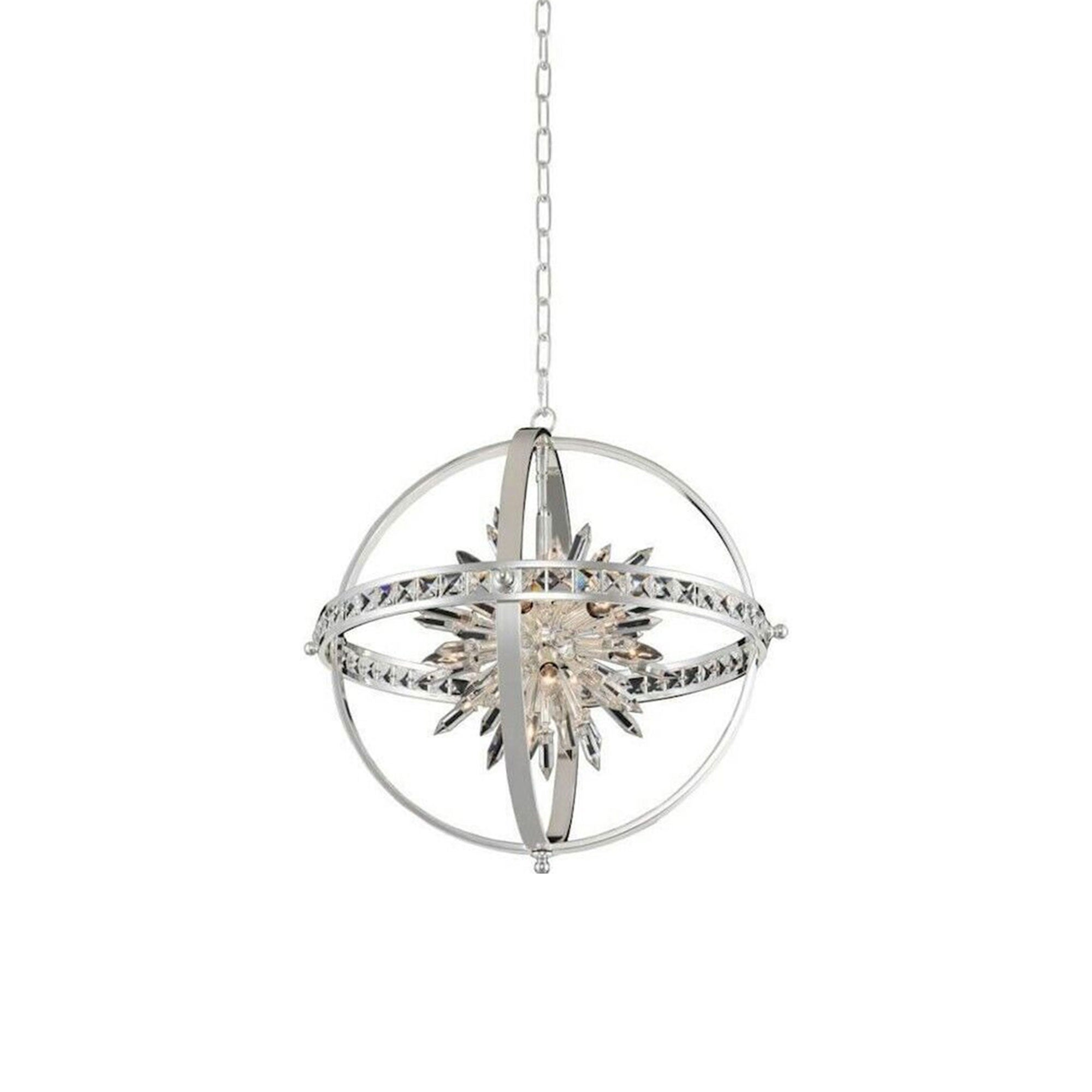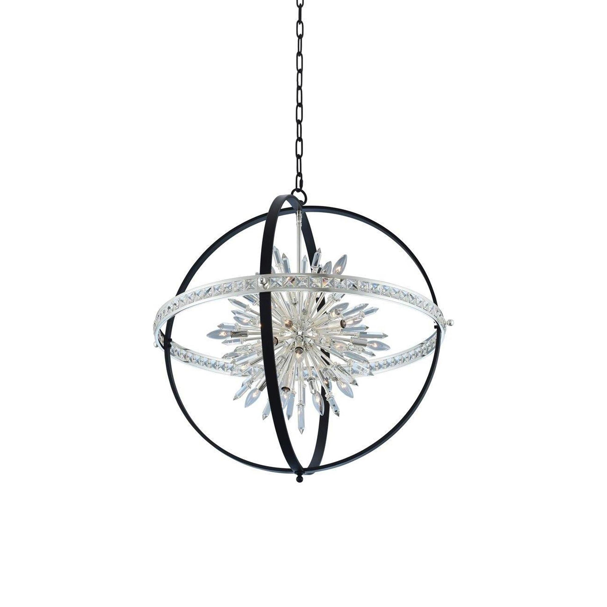 Orbital rings and a glittering jeweled band create glamorous structure for the starburst center of the Angelo Chandelier from Allegri. Dynamic over a dining table or in your entry, the pendant reflects glittering, modern sophistication that elevates surrounding decor to new heights. Enjoy the eye-catching elegance of spiky Firenze Crystals that highlight a dramatic design.