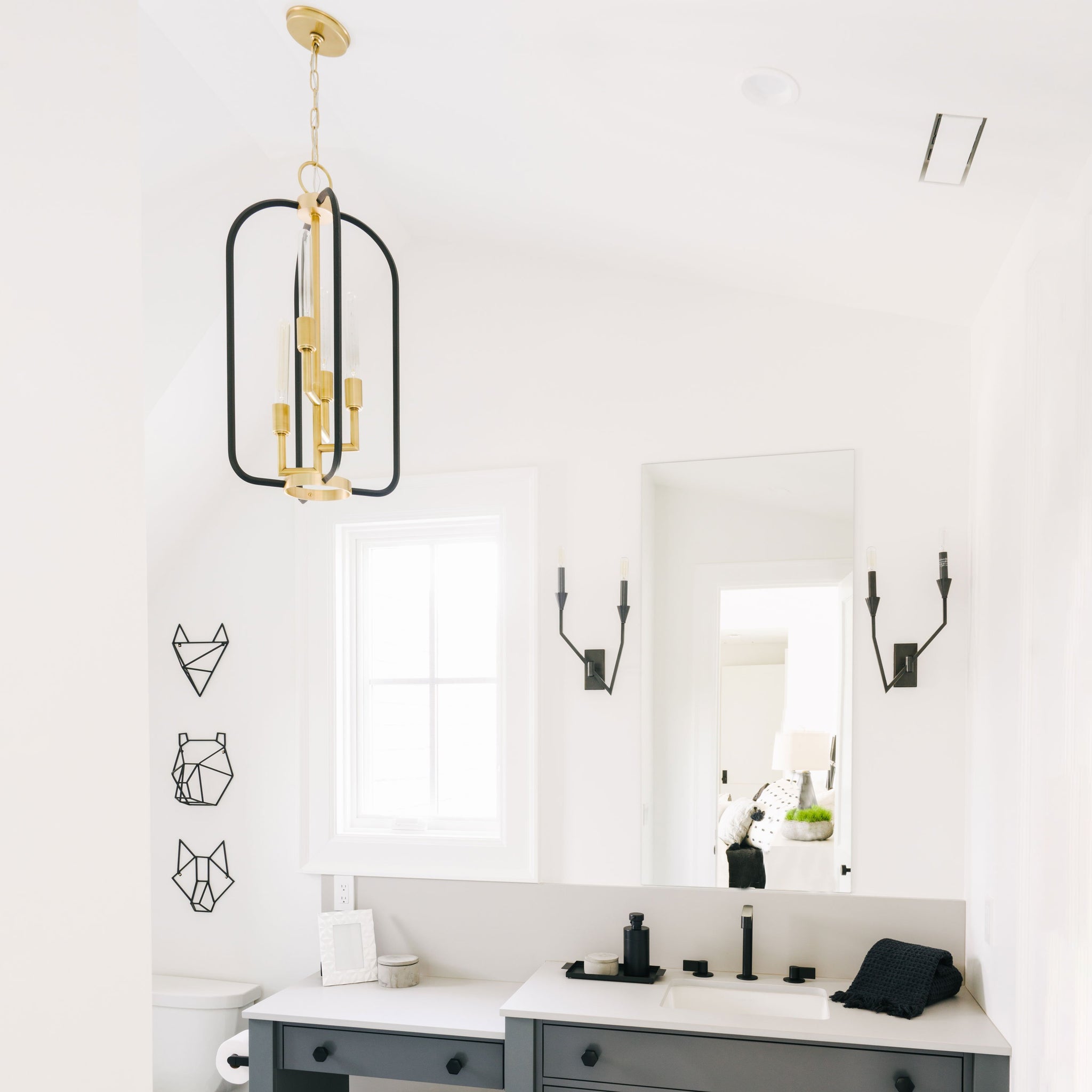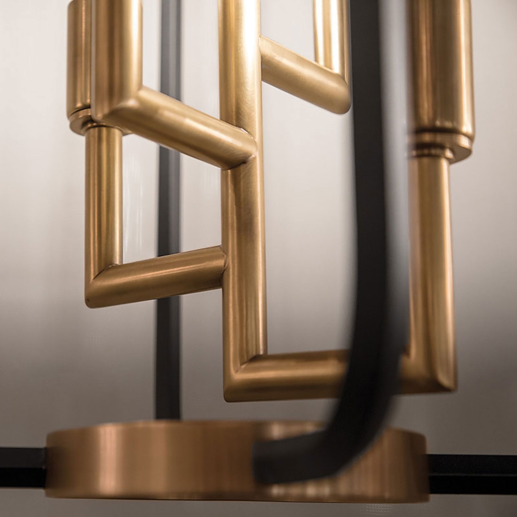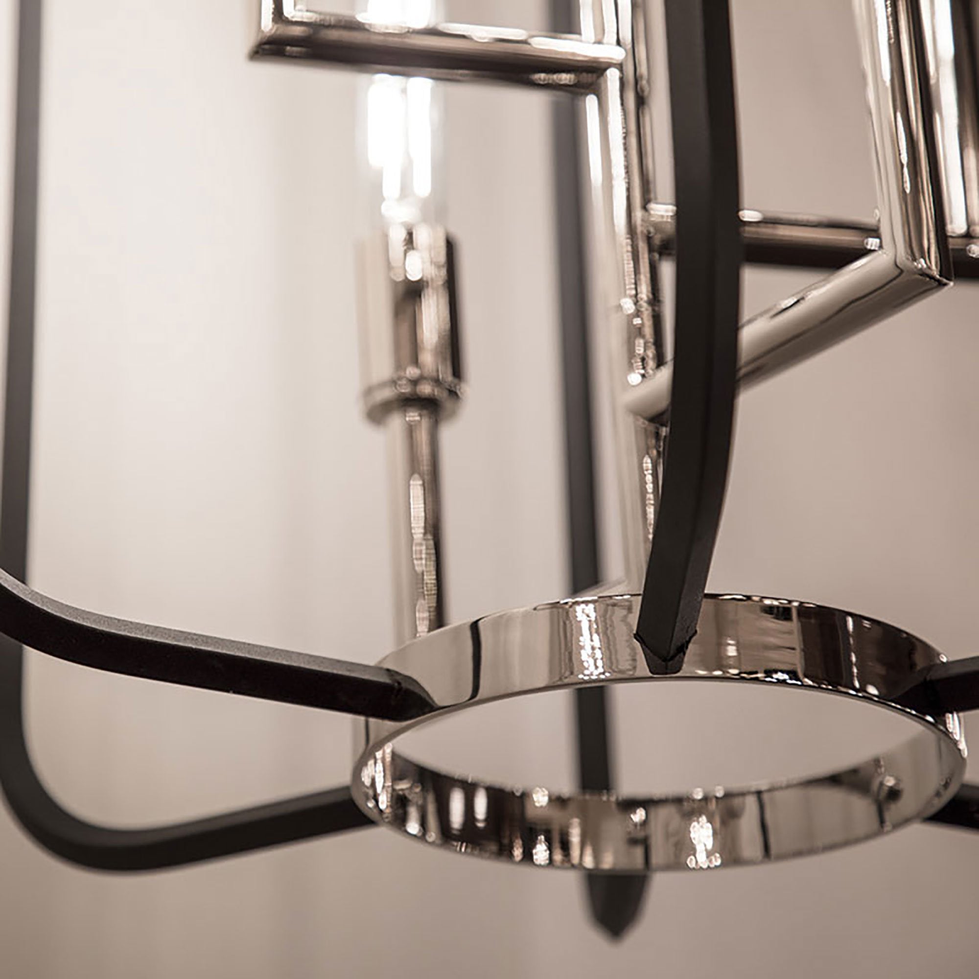 Using a candlestick from the fifties as an inspiration, we designed our Angler family around the idea of staggering bulbs at different heights on off-centered tubular arms bent at sharp ninety-degree angles. The resulting work is minimalist and sophisticated. Two-tone versions contrast the brass or nickel-finished candelabra with a cage of smoothly rounded black metal lines.