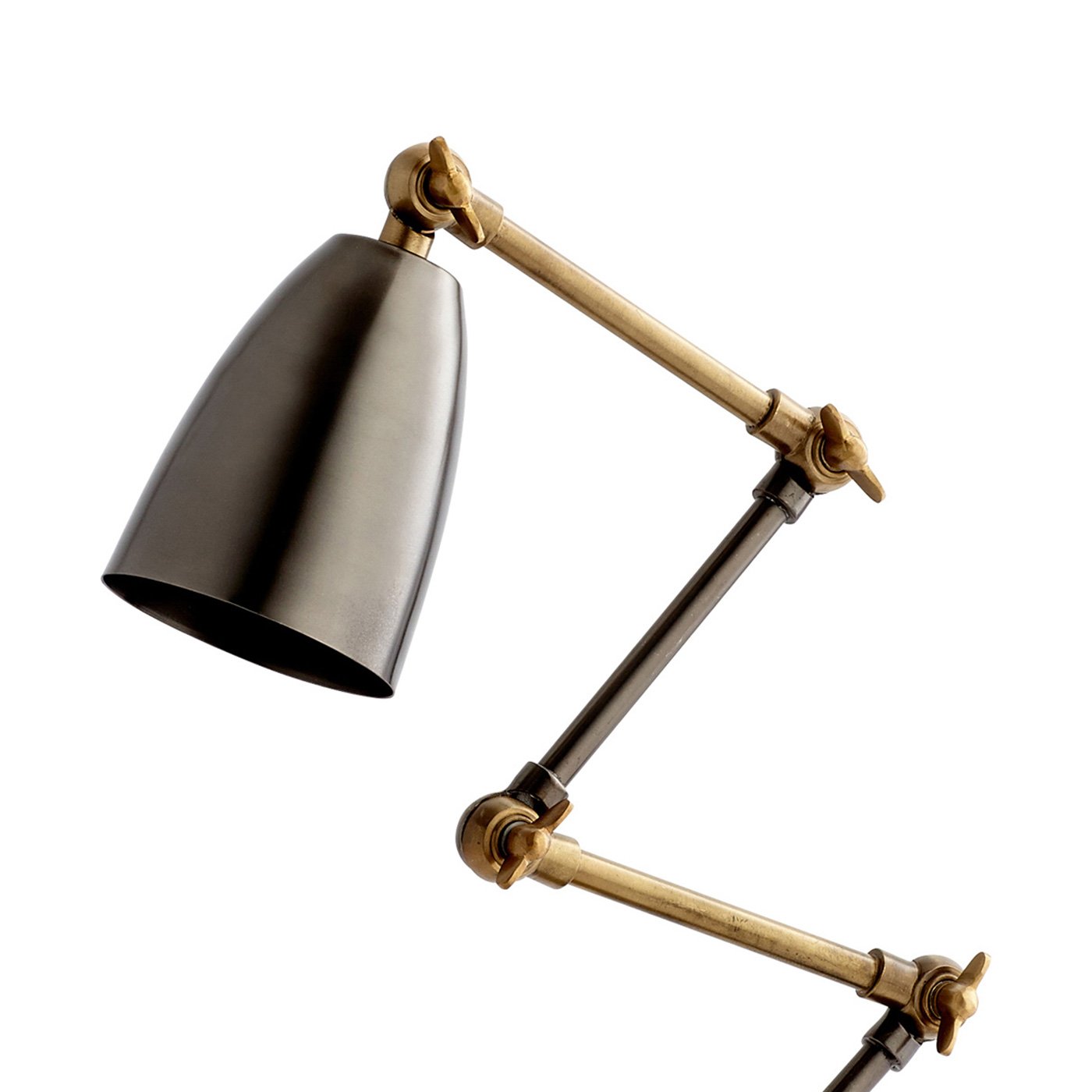 Alternating bronze and black segments are connected with vintage-style hinges to create a charming, adjustable silhouette for this metal desk lamp. Perfect for a style desktop or credenza, the lamp features a bronze base and shade with two bronze segments. Three burnished brass finish segments add contrast and depth to an appealing design.