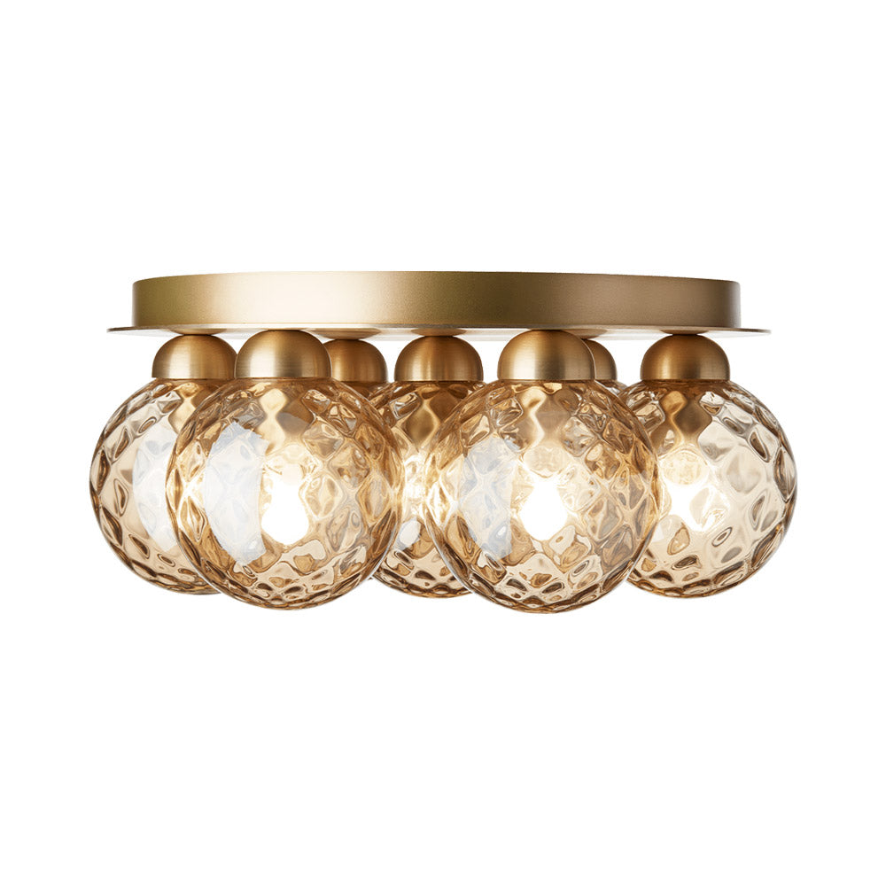A lush, warm palette furthers dramatic essence reminiscent of retro-inspired fare. The Apiales Plafond Flush Mount Ceiling Light from Nuura adopts a Mid-Century Modern motif, clustering optic gold glass globes with chic dome tops, affixed to a gorgeous brushed brass finish round canopy.