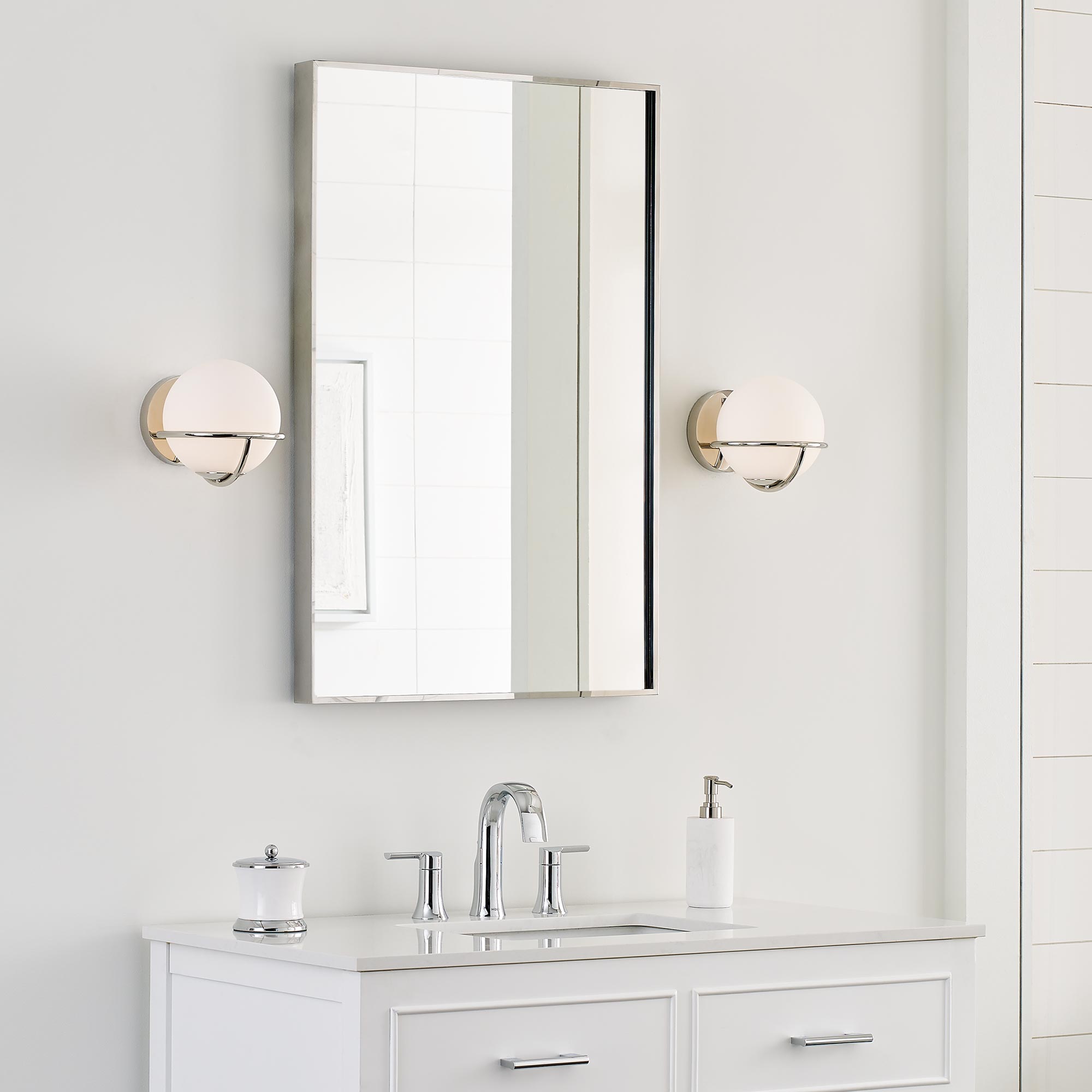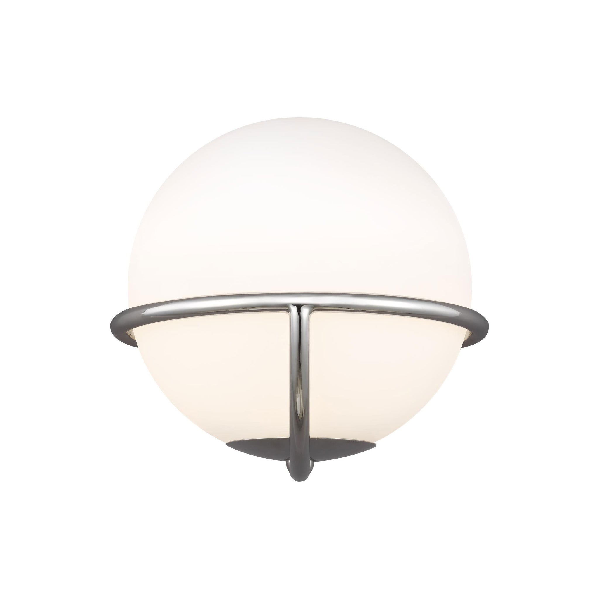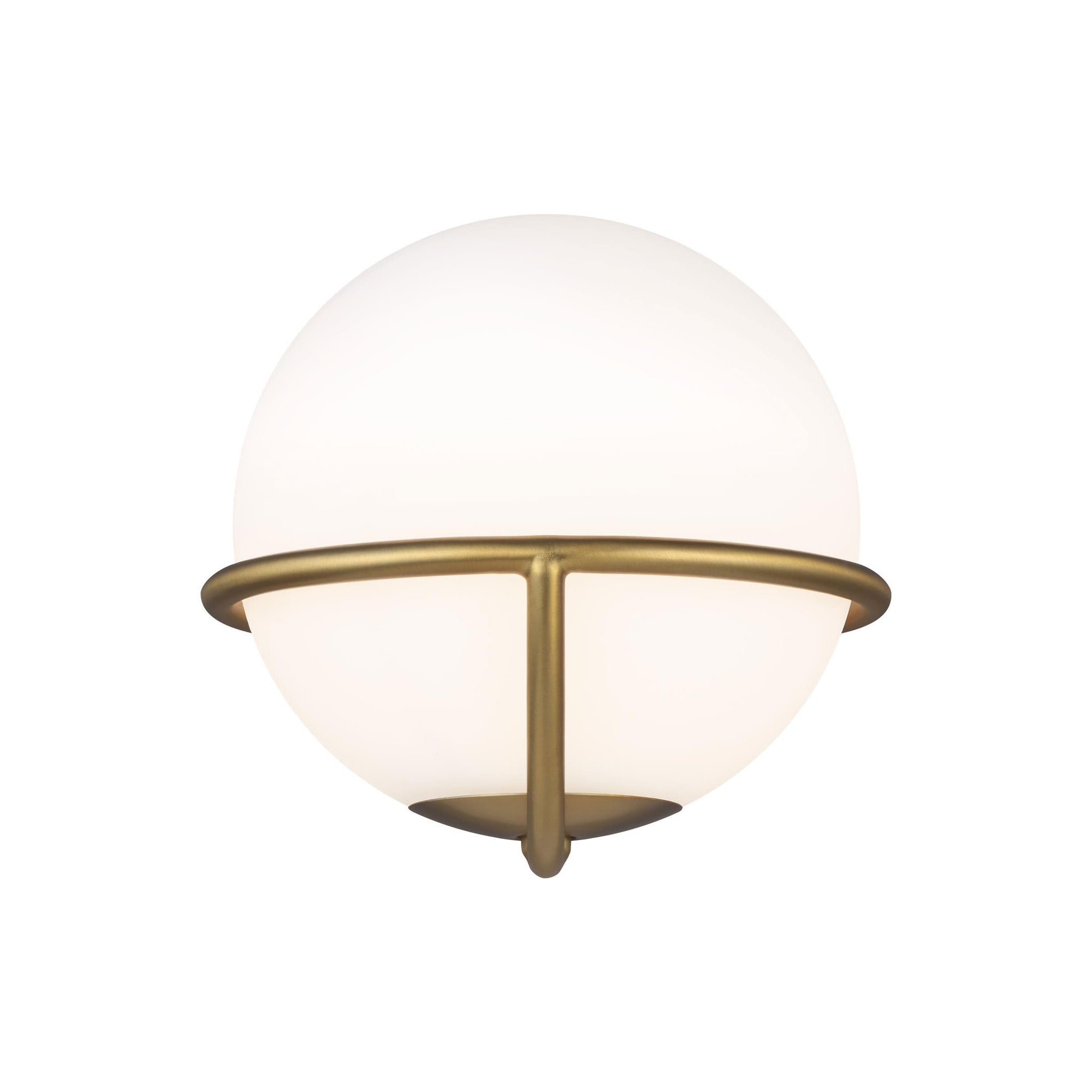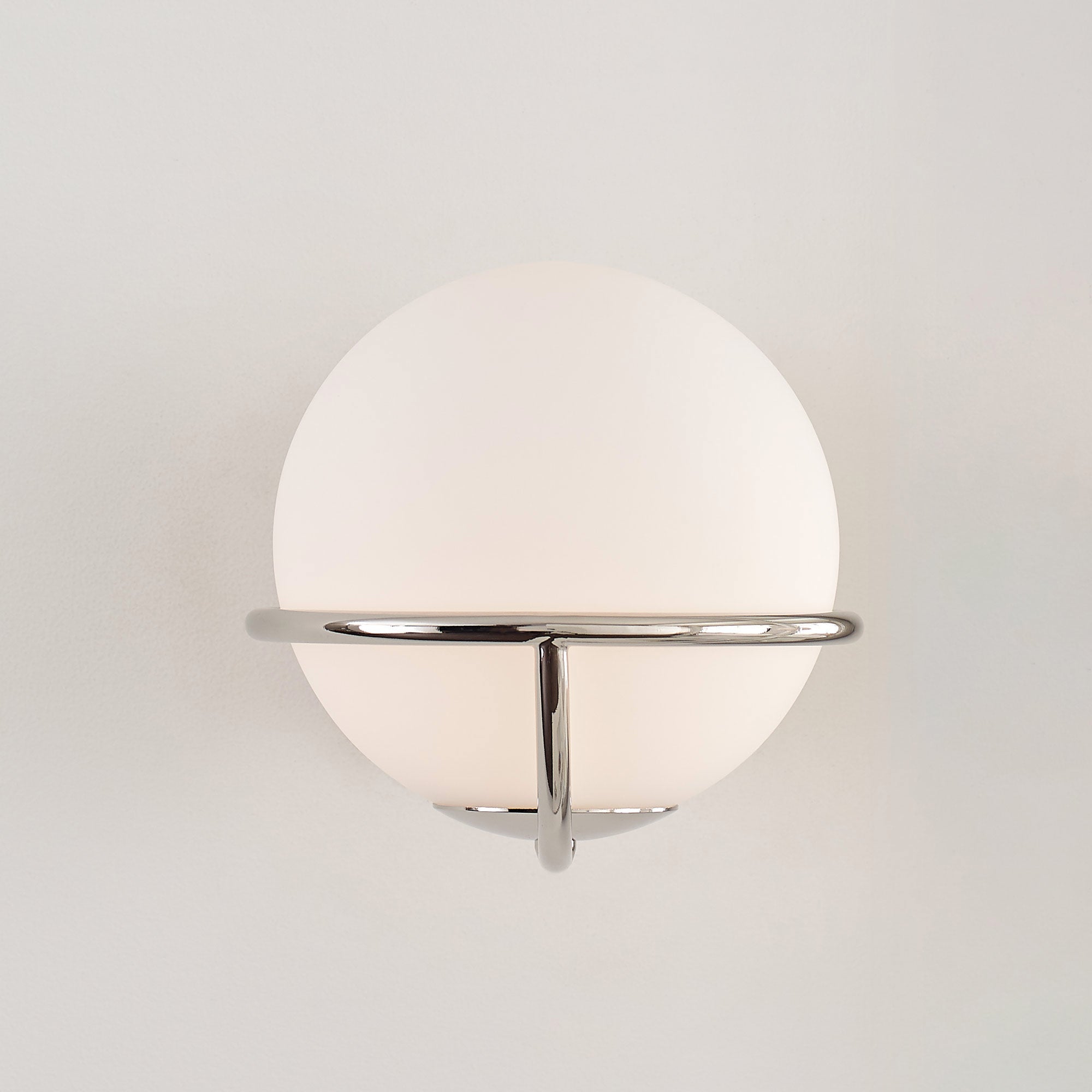 The modernist Apollo impresses with perfectly balanced White Opal Etched Glass globes that gently rest within a spherical Burnished Brass or Polished Nickel frame. Apollo's cosmic appeal and artistic mid-century design is sure to become the focal point of any space.