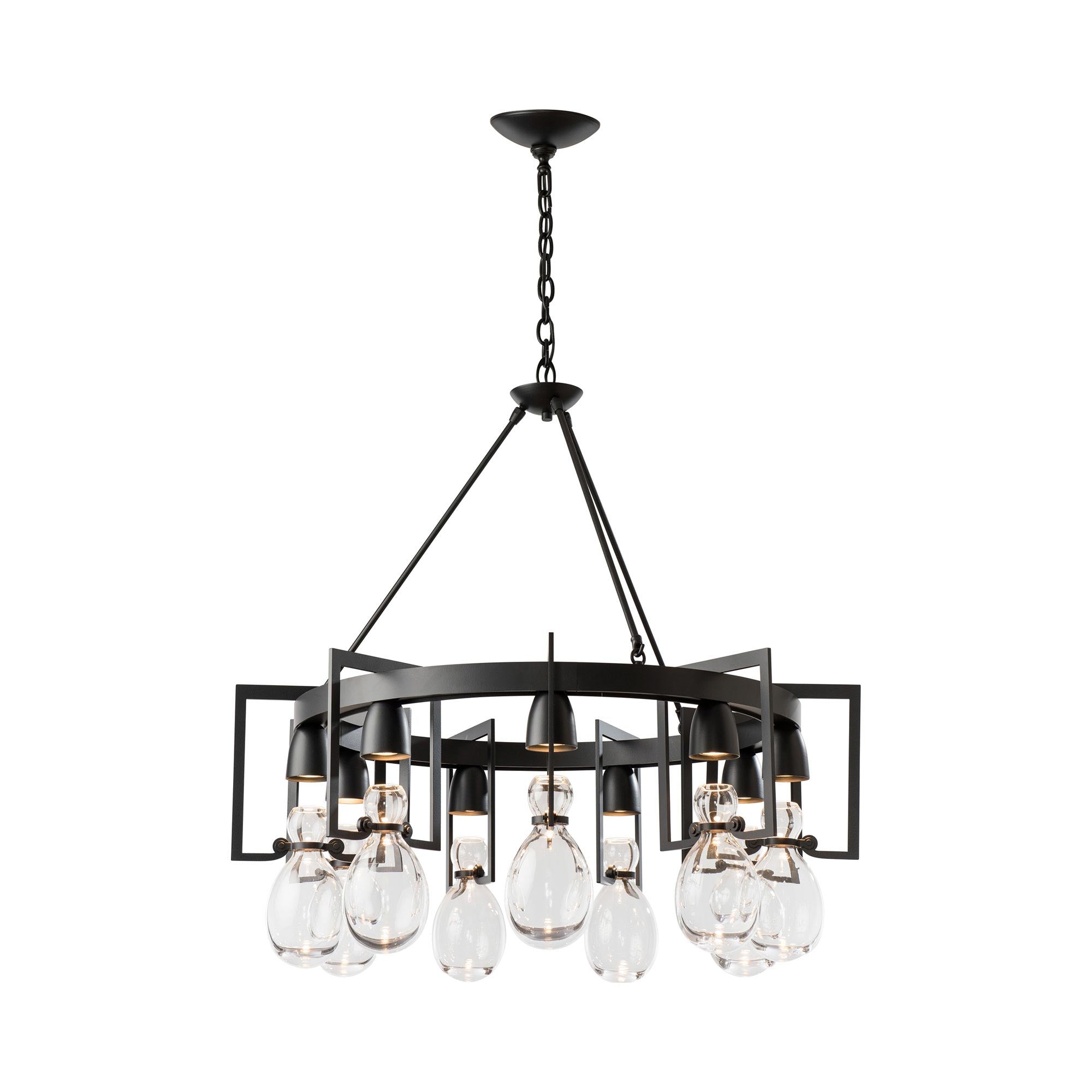 Steel cuffs suspend hourglass vessels within the forged frame of the Apothecary Chandelier from Hubbardton Forge.