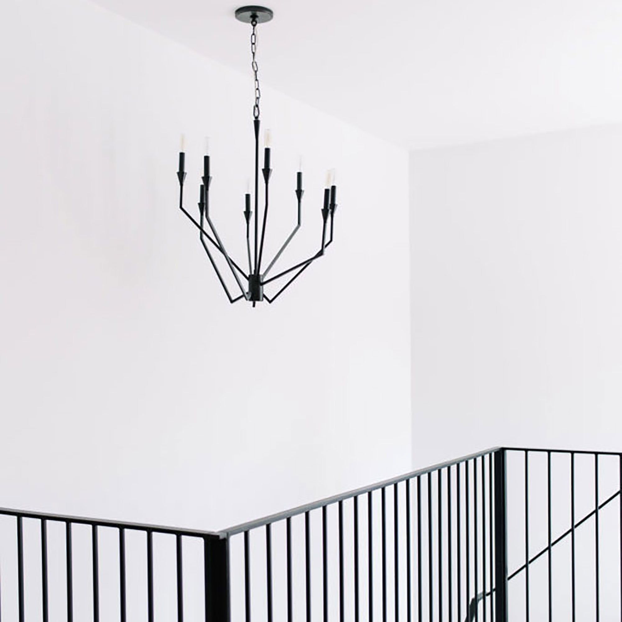 When we happened upon a breathtaking avant garde Modernist candelabra, we were determined to resurrect it as a chandelier and sconce with electric lamping. The ensuing process was a labor of love, as we sought to establish balance in a purposefully asymmetrical fixture and create the illusion of continuity. Transforming the piece from a sculptural base for wax-and-flame candles to an electric fixture, we continued our brand tradition of keeping the bobeches and making the candle sleeves the same finish as the rest of the piece.