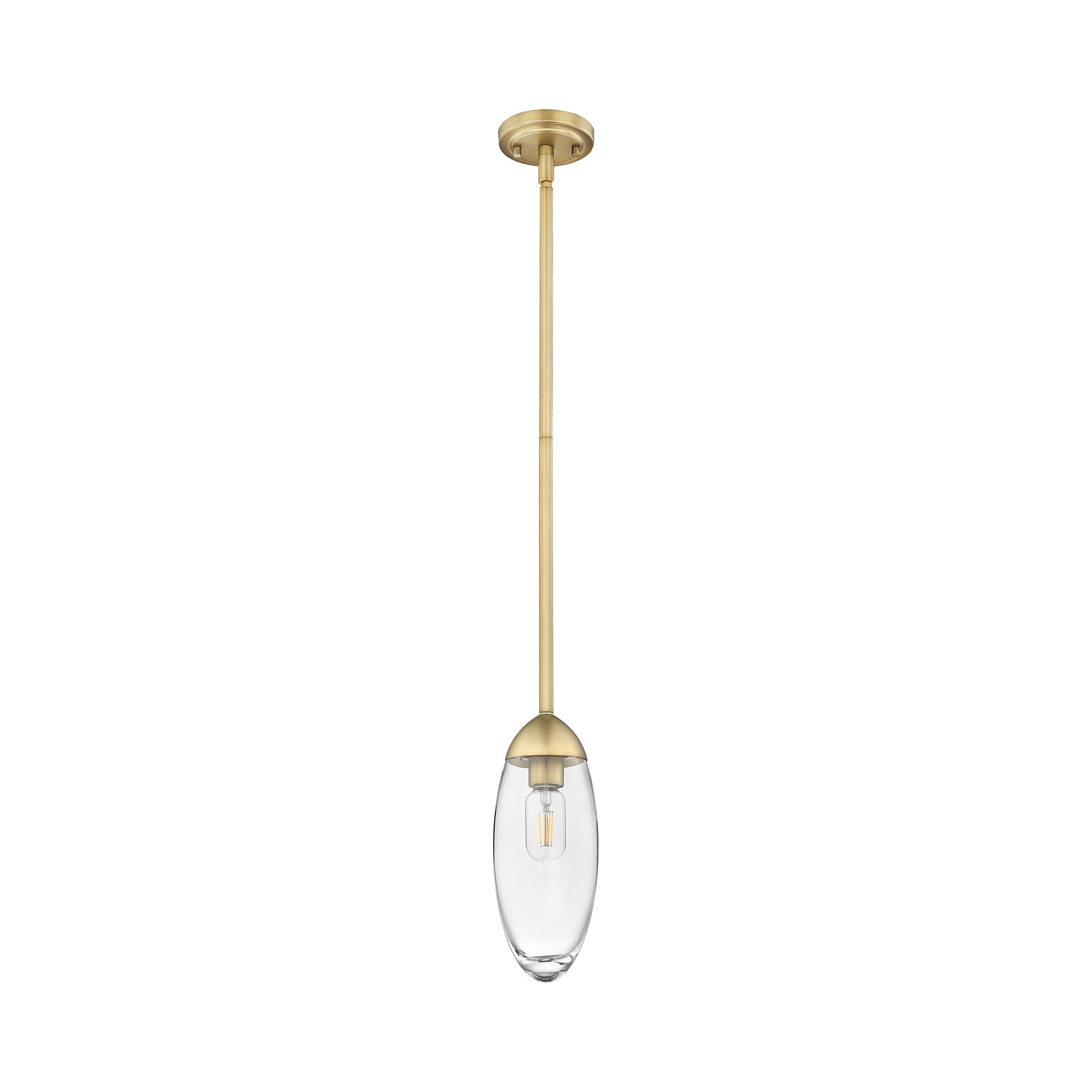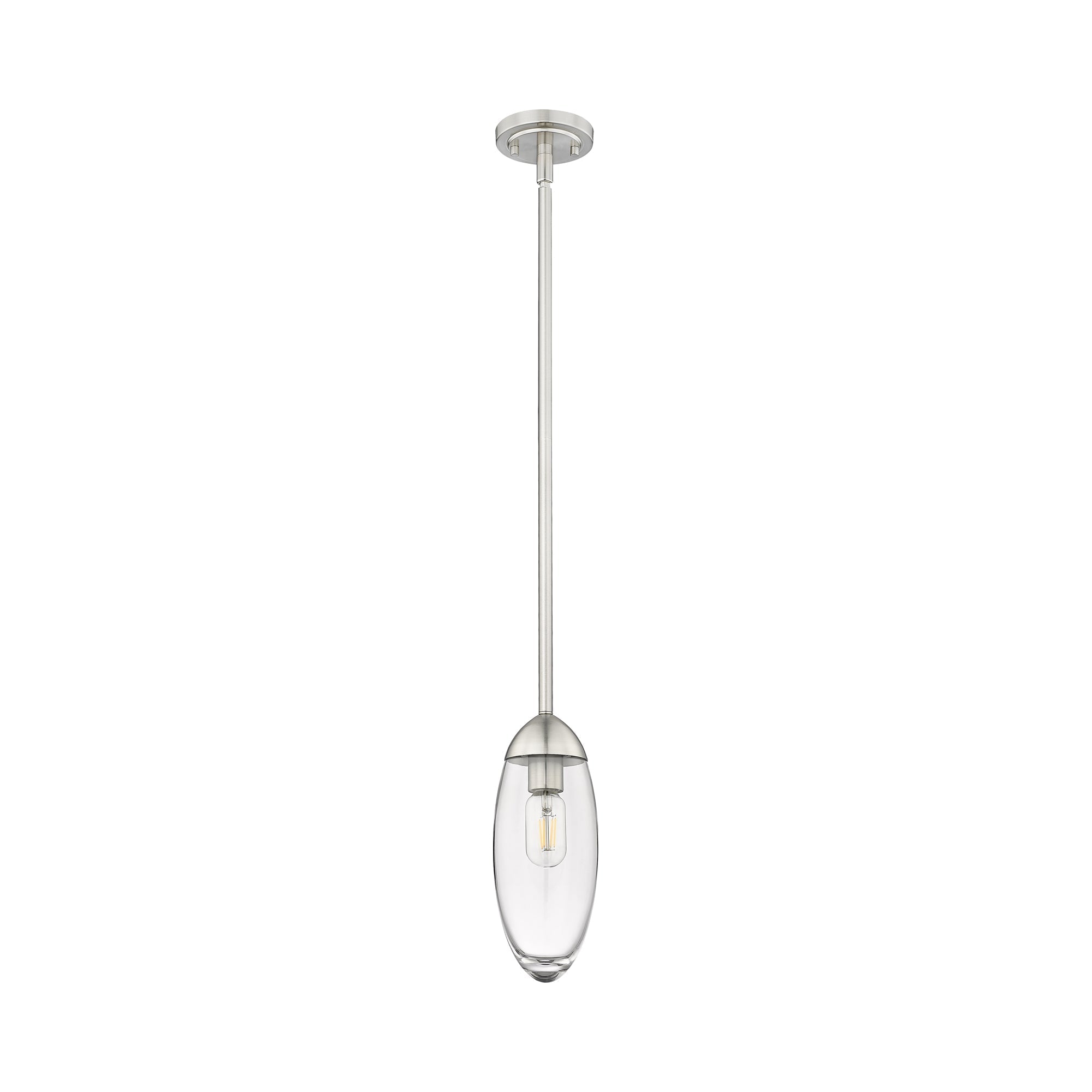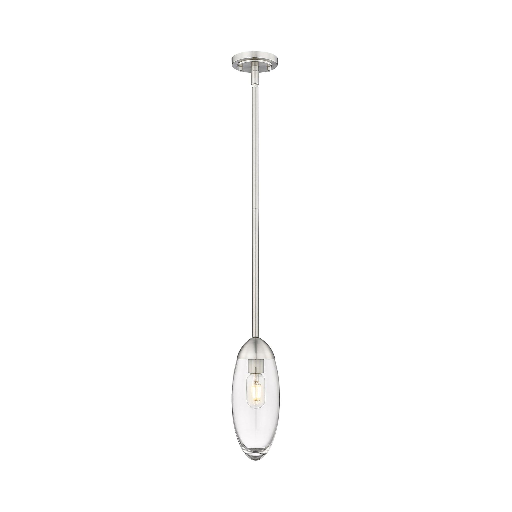 An expressive vibe with signature glam style creates a decadent look in a contemporary space as the Arden Mini Pendant Light from Z-Lite delivers a gallery influence of fine artistry. A purposefully linear silhouette begins with a slender down rod made of metal, culminating in a delicate clear glass oval shade. Mount this fixture as a solo light or in a line to magnify illumination.
