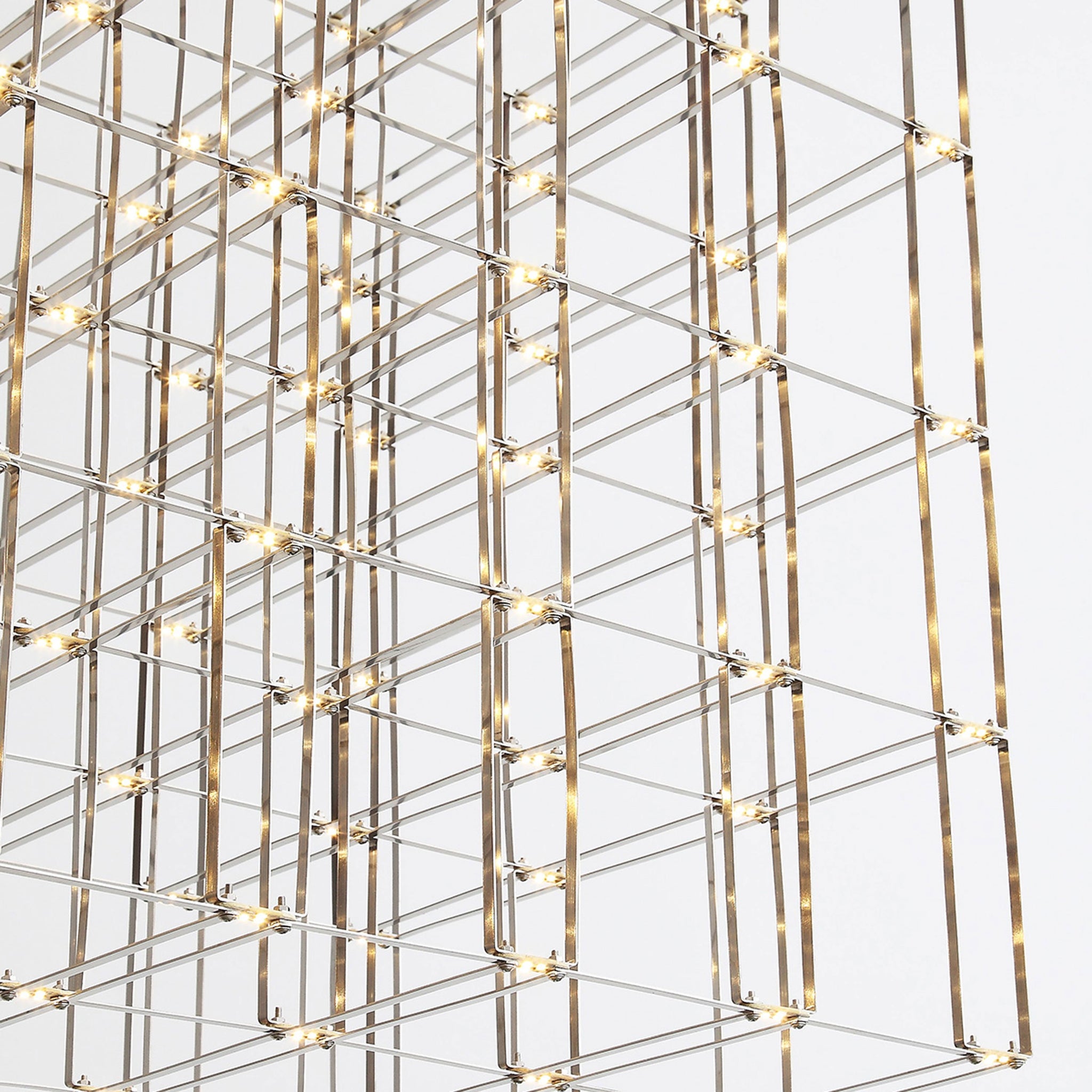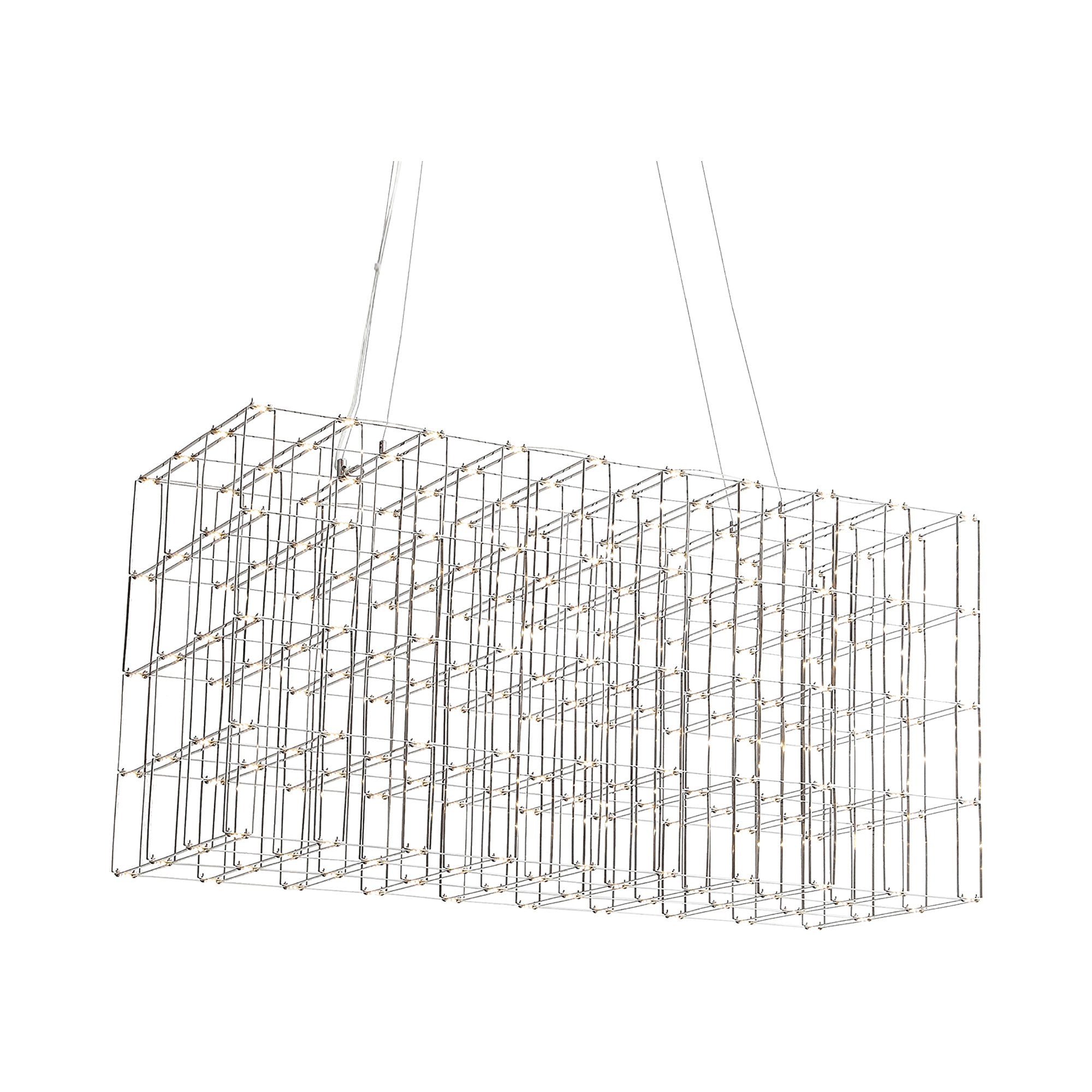 The Argyle Chandelier features a retro industrial modern stainless-steel cage light fixture, illuminated by 100, 200, 260s of LED diodes that glisten throughout this 3 dimensional fixture