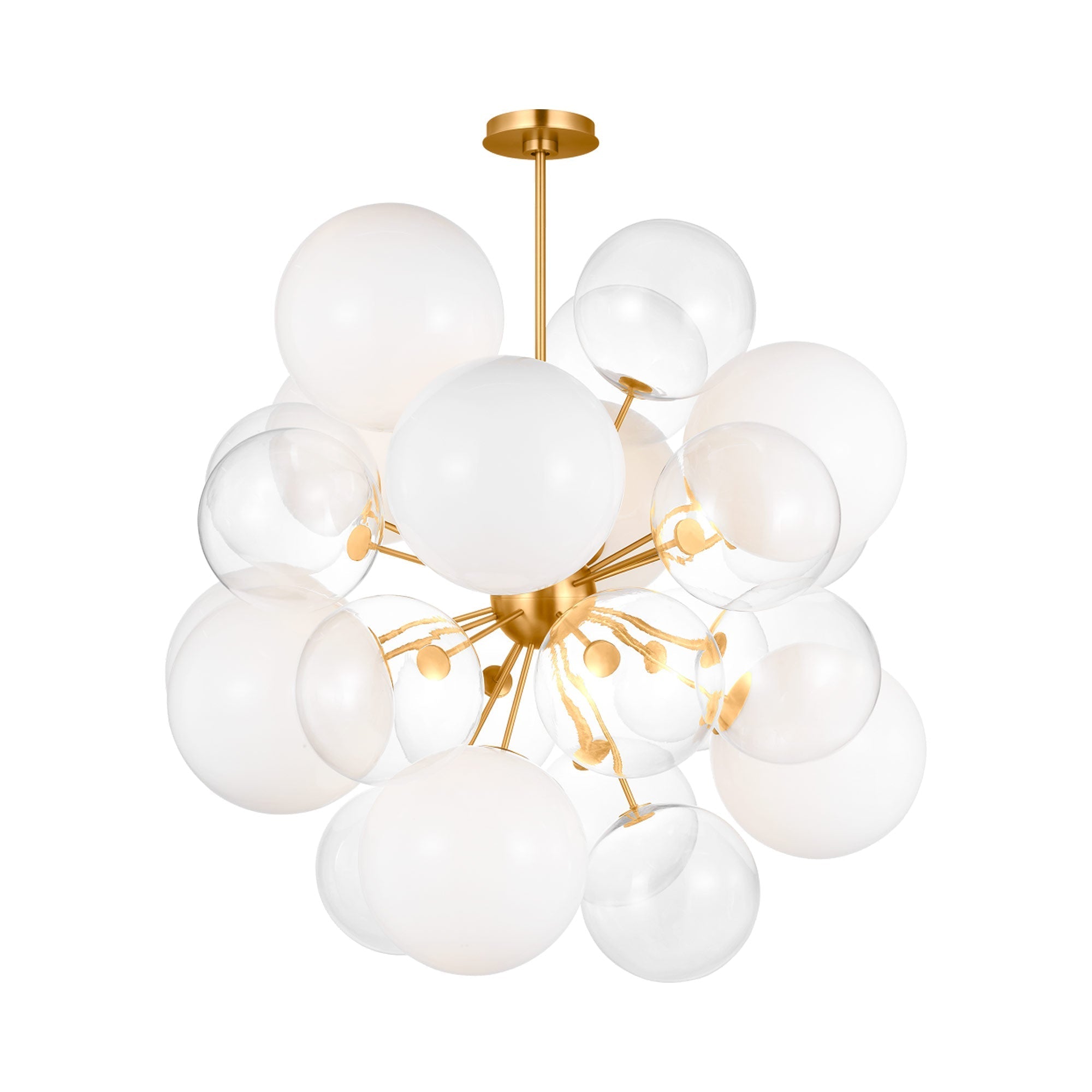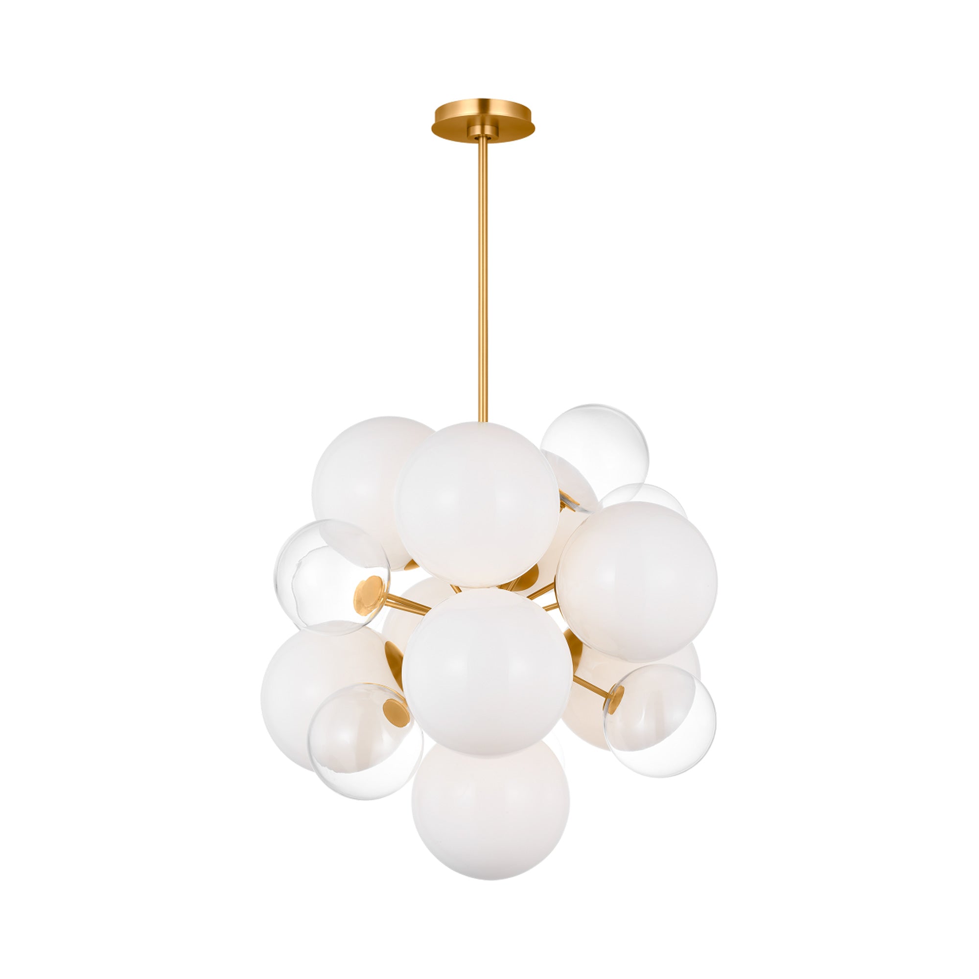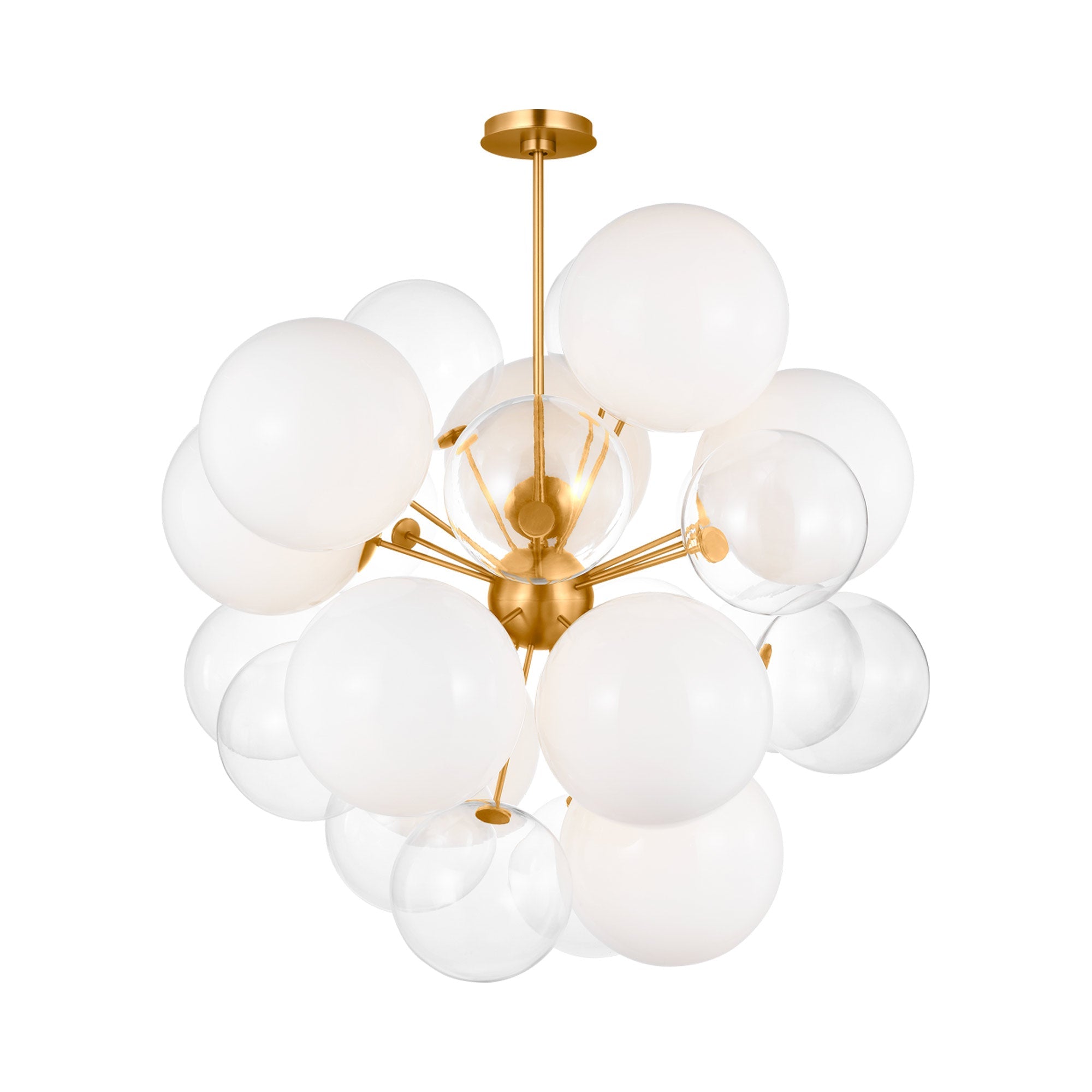 Effervescence is the key to festivity and artisan charm as the Aria Chandelier from Visual Comfort Studio becomes a central focus in a light, airy setting. Modern inspiration carries with it a hint of retro fare as this fixture congregates both milk and clear glass orbs in a grape-like cluster. Distinctive metal accents create definition as they add sophistication.