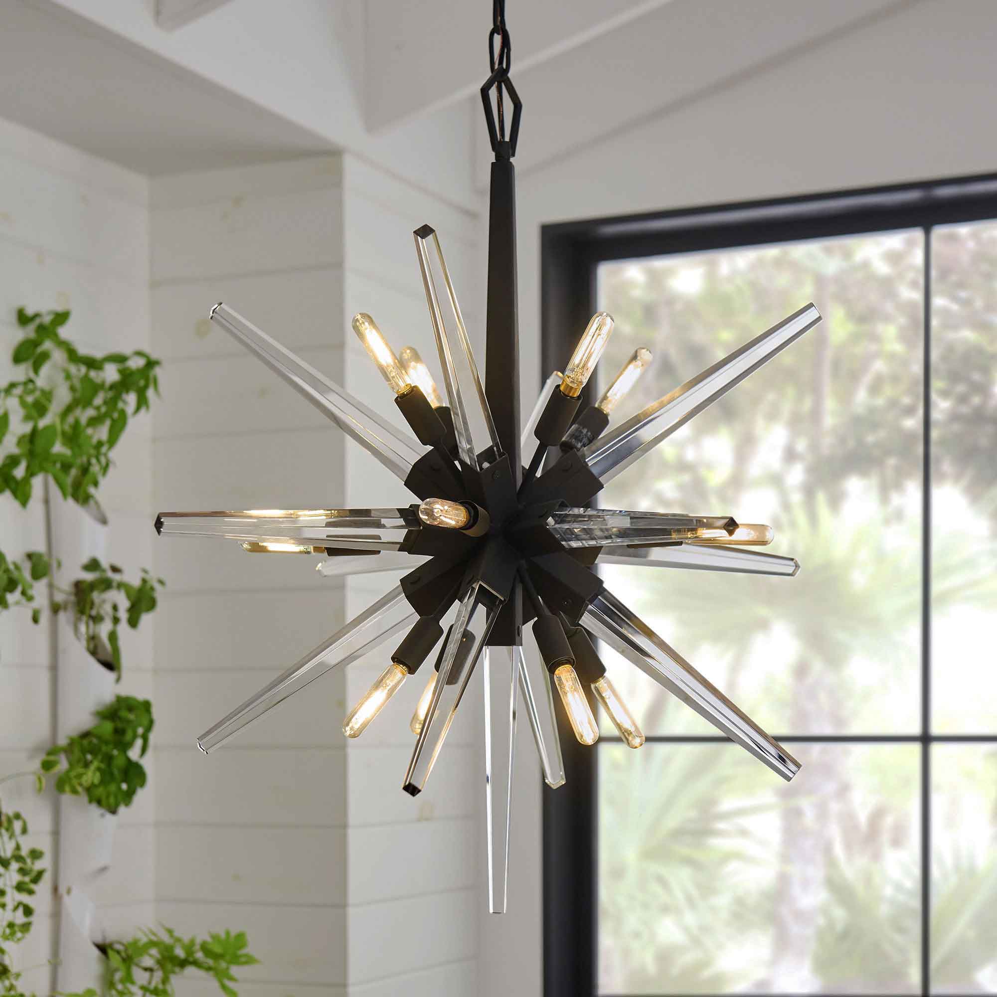 Ariel takes a fresh approach to the classic mid-century modern starburst shape. Reinterpreted with a sleek, minimalist profile in a jet-black finish, Ariel Star Chandelier adds an unexpected dash of elegance with the addition of sophisticated crystal spires.