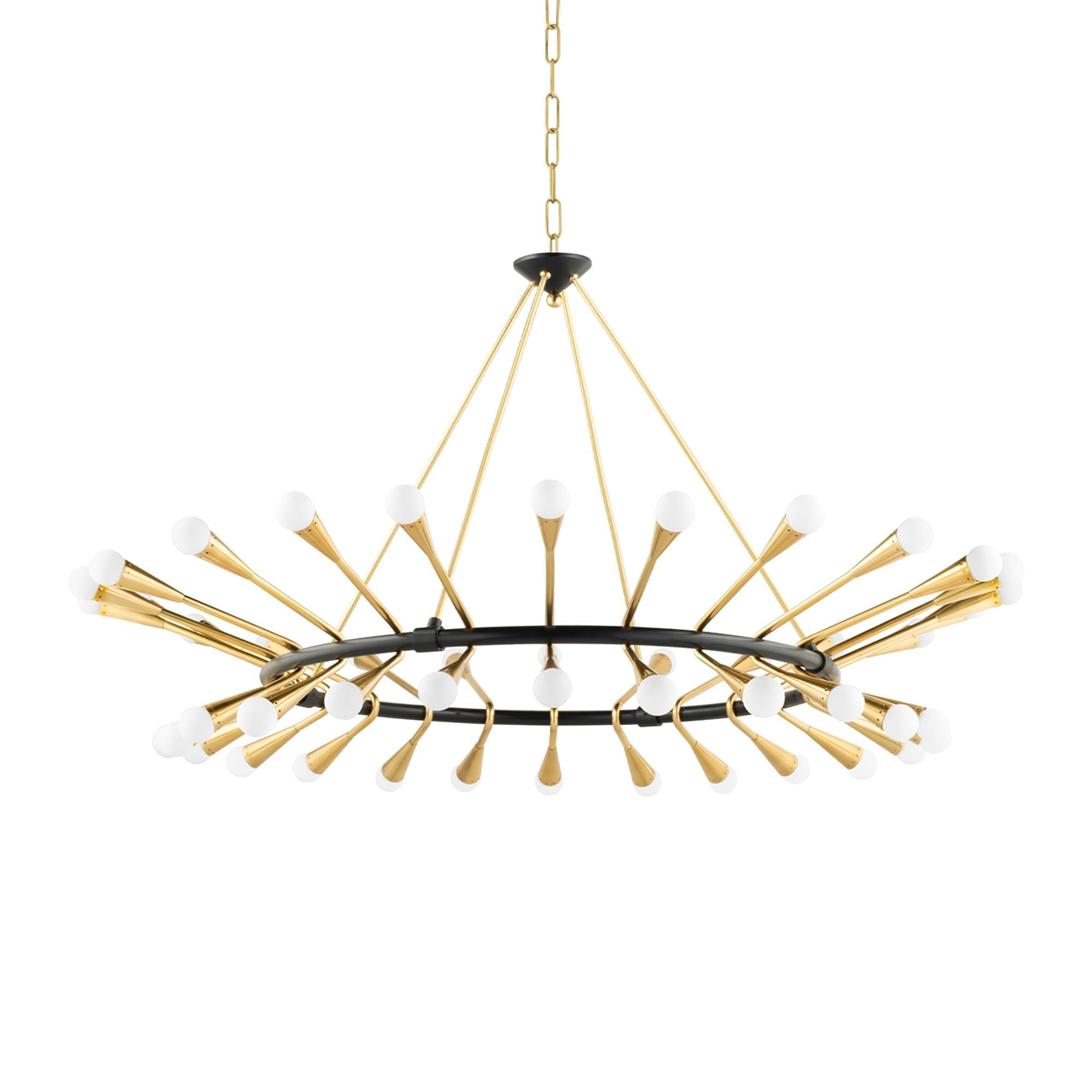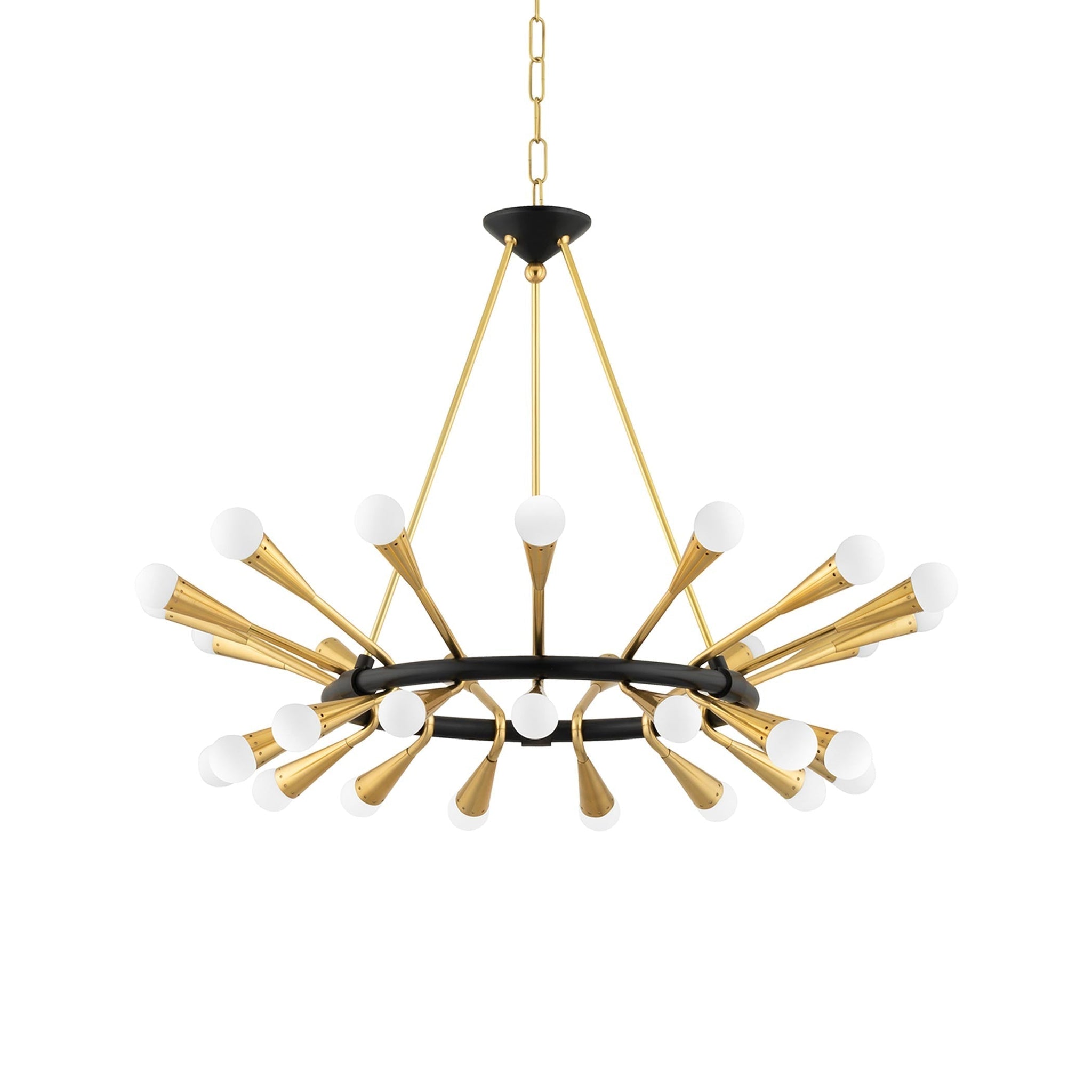 Atomic age influences shine through the Midcentury vibes of the Aries Chandelier from Corbett Lighting, featuring a flared circular frame design complete with conical trumpet shape arms with perforated edges for a sparkle effect. A warm brass metallic finish offers up dramatic glam touches. Topped off with round opal globes, this chandelier offers an all-around diffused ambiance to dramatic dining areas and open concept living rooms.