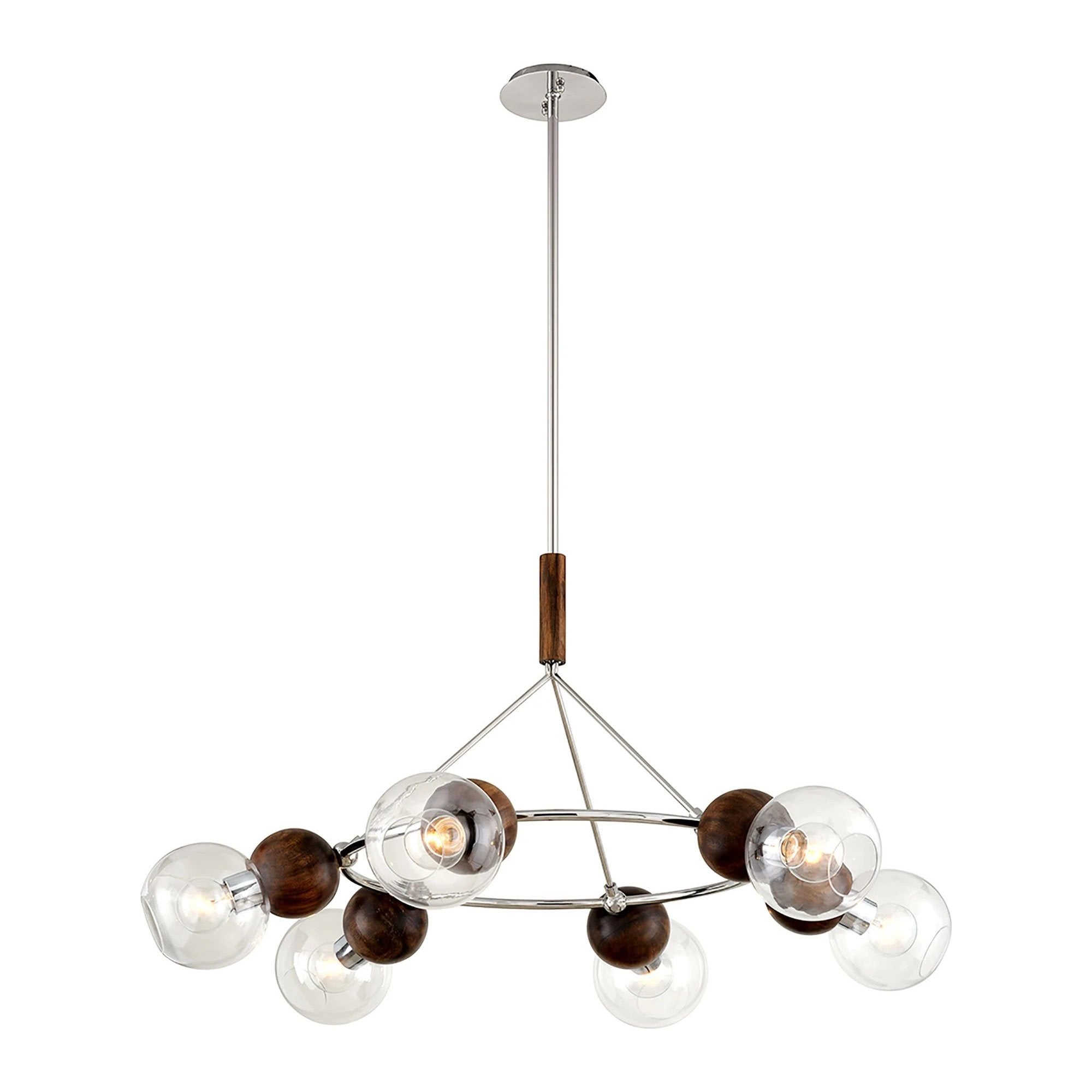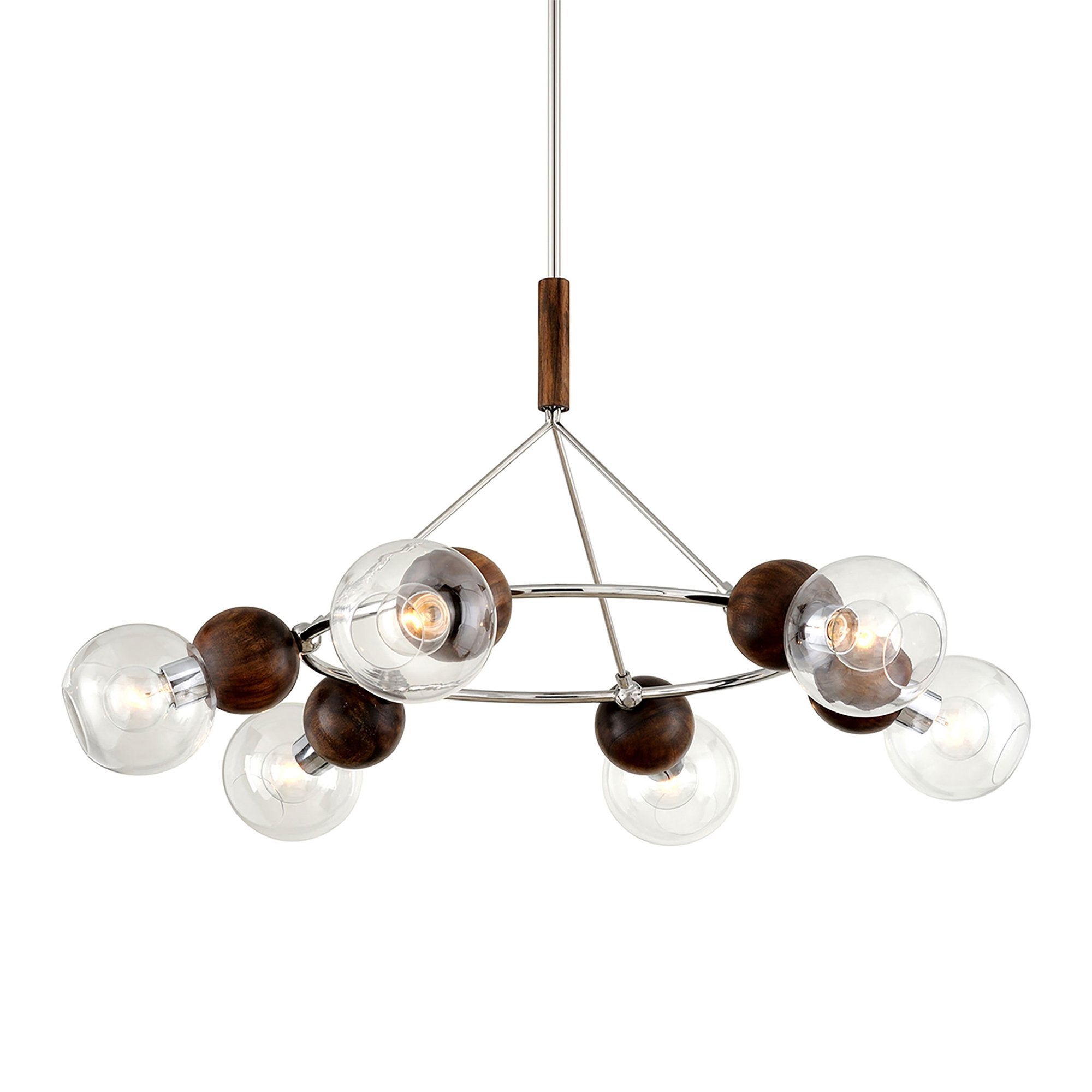 Acacia orbs and clear glass globes create a compelling look and feel for the intriguing, contemporary Arlo Chandelier from Troy Lighting.