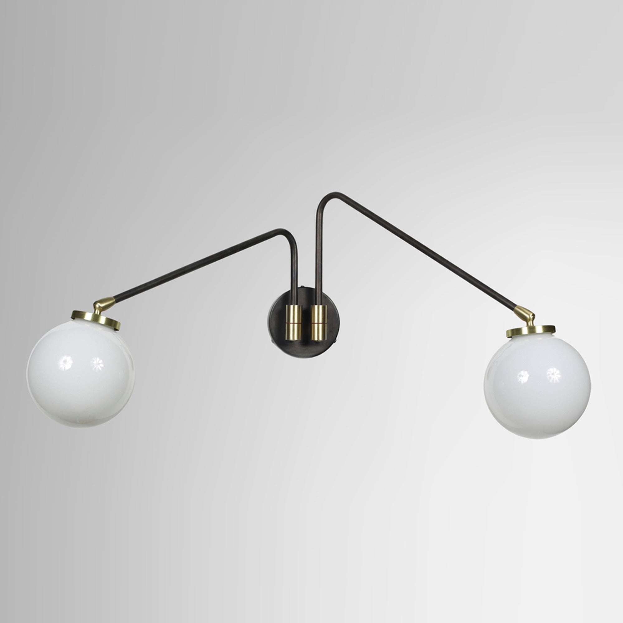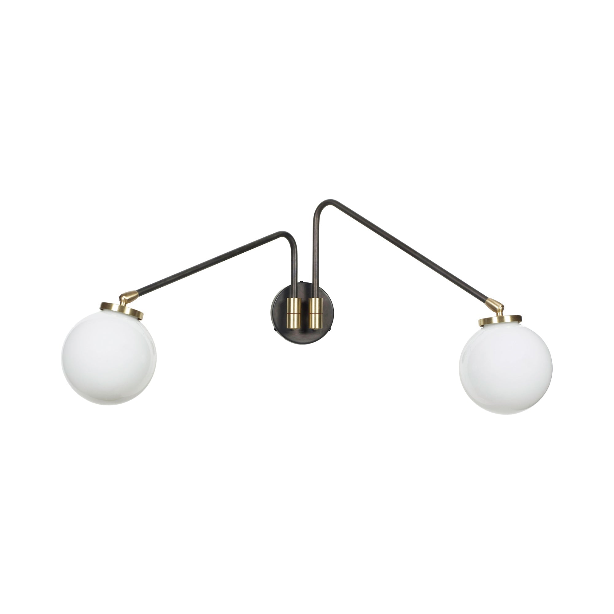 Create a festive atmosphere in a modern space with the Array Twin Opal Wall Light from CTO Lighting. The whimsical look of globe shades delivers a prominent element to this light that borrows from old studio style and improves on it with modern adjustability. Metal accents include satin brass details and bronzing, both of which pay tribute to a vintage Hollywood feel.