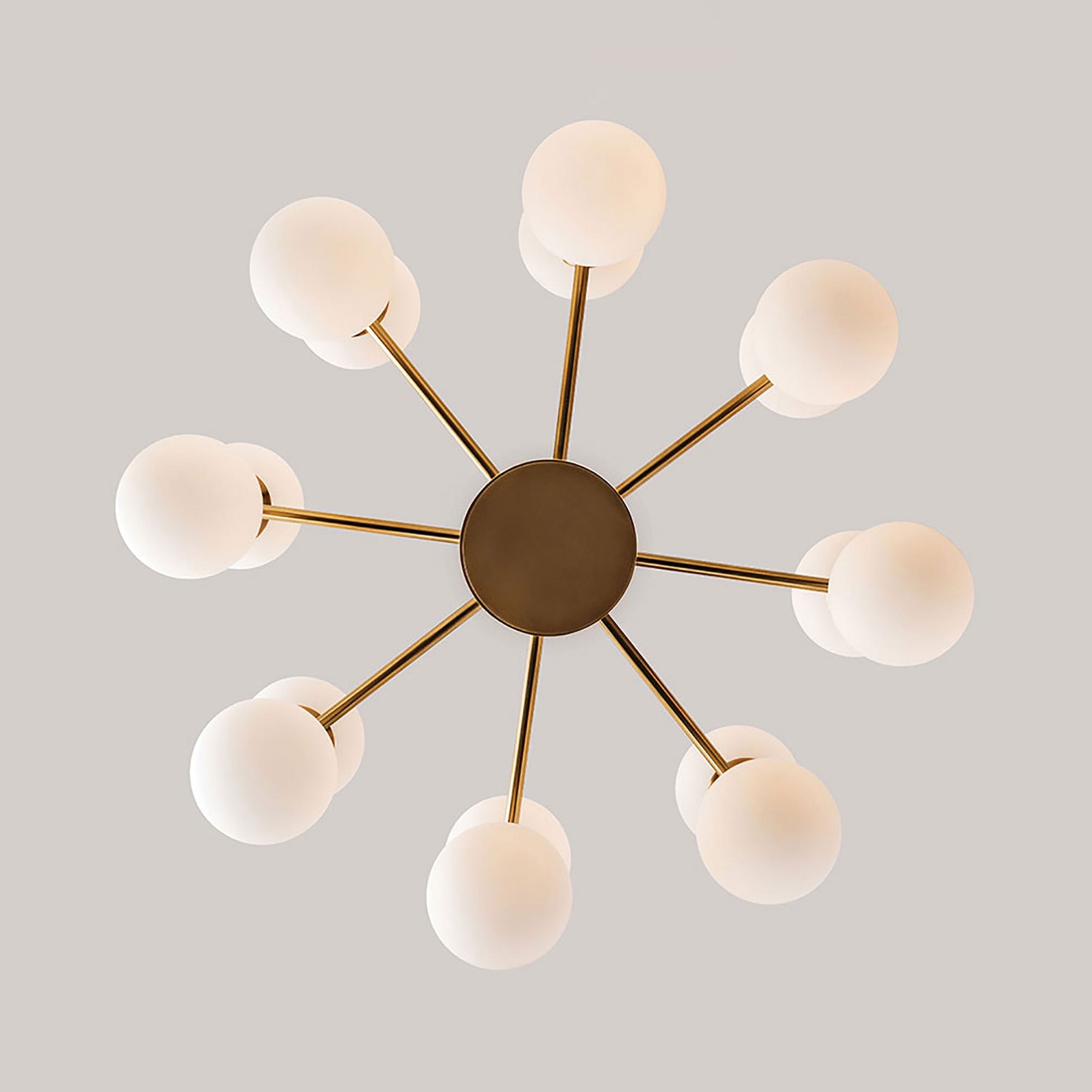 Delight in simplicity and symmetry in our Astoria family. Bubbles of light balance on and balloon forth from trumpets of cast metal. Opal-etched glass diffusers poise in balanced rows, above and below, along a wheel of light, concealing warm, dimmable LED bulbs.