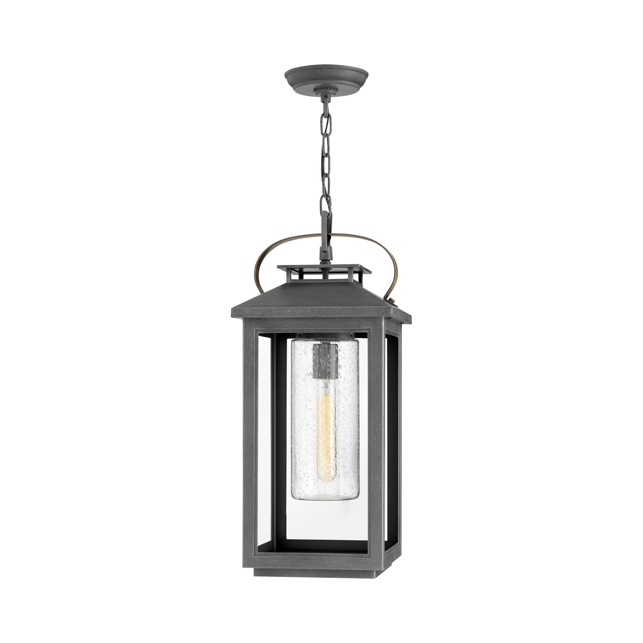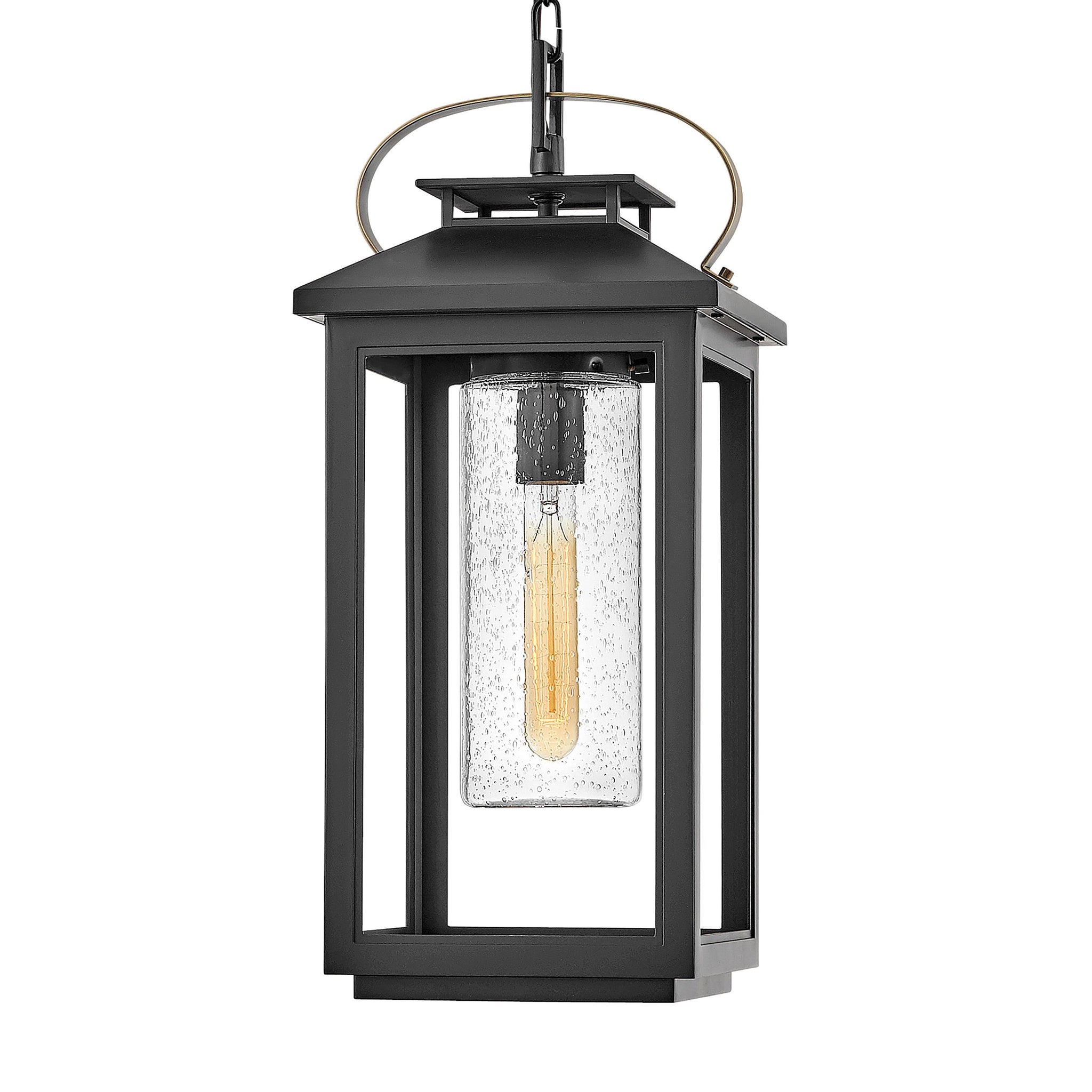 Glowing seedy glass centers the coastal lantern design of the Atwater Outdoor Pendant Light from Hinkley. An elevated approach to seamlessly blend vintage and modern design touches.