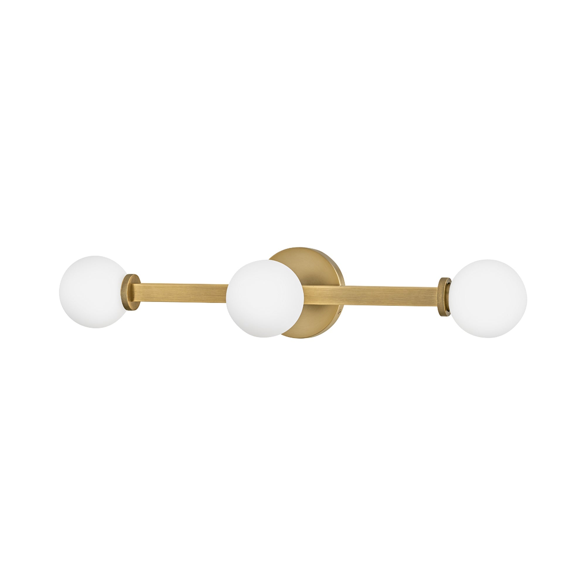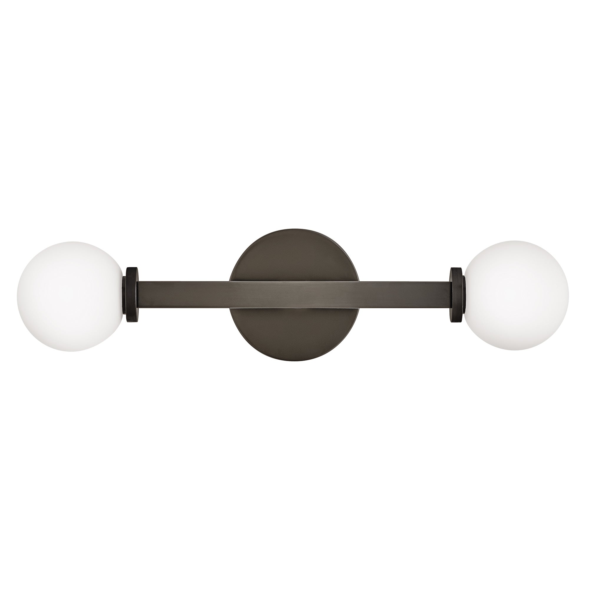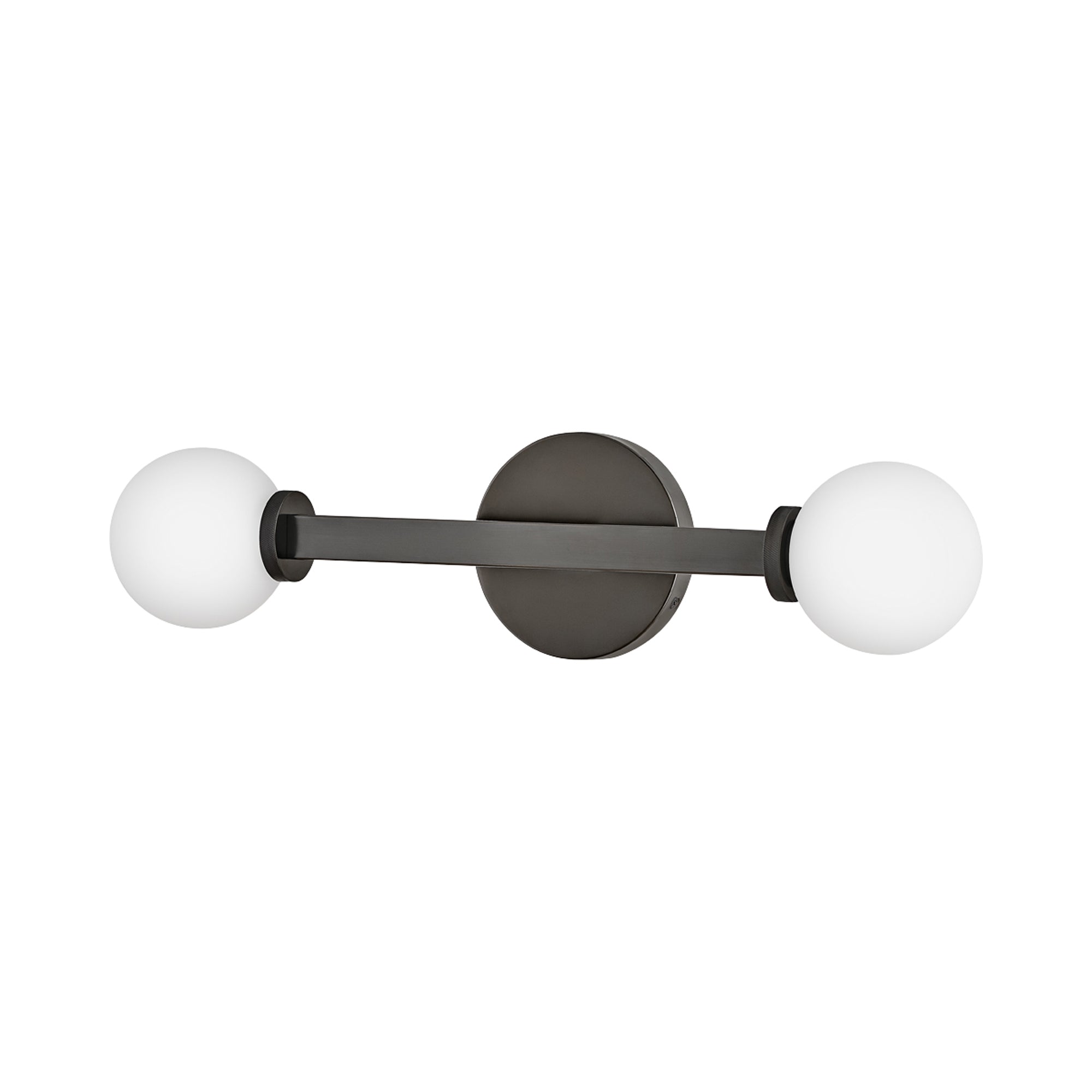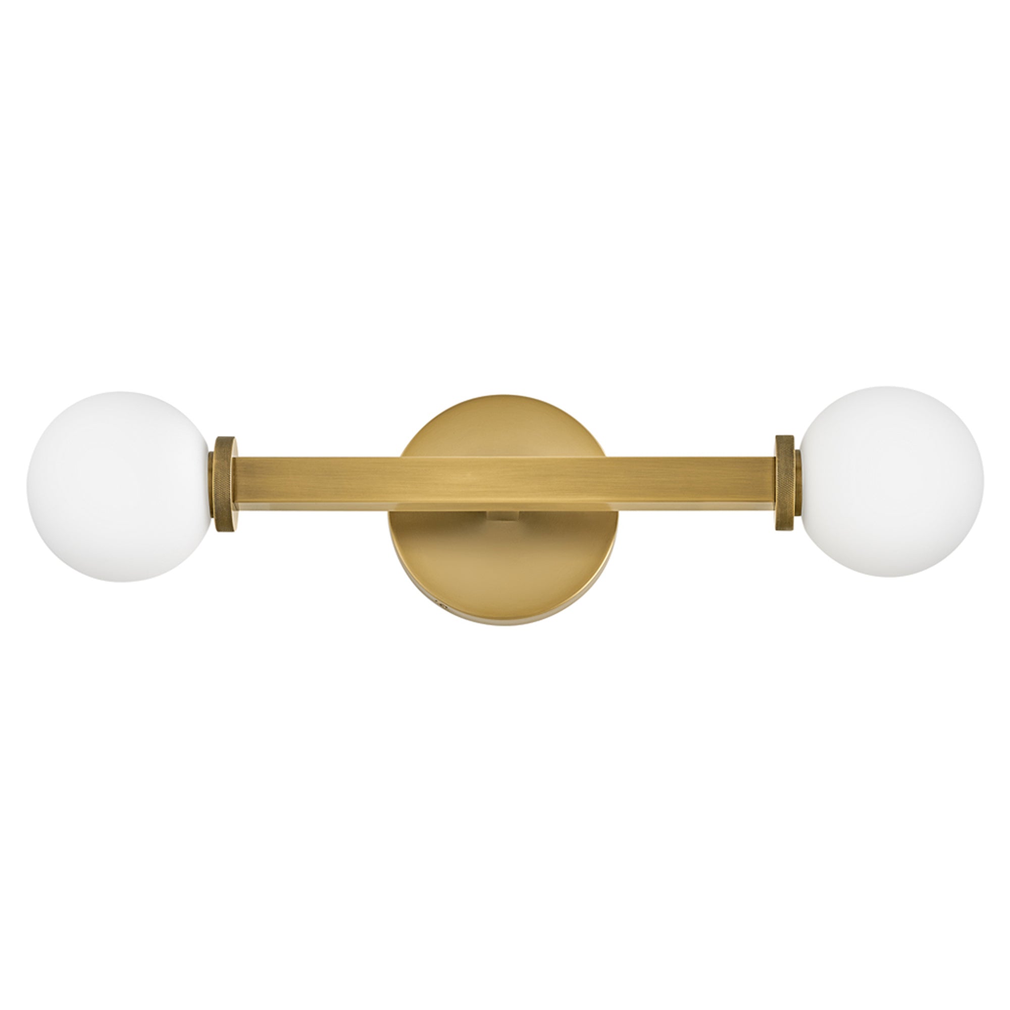 Etched opal glass globes bring vintage character to a modern Audrey Vanity Wall Light from Hinkley. A round wall plate echoes the simple orb shades, while linear elements add structure and elegance. Knurled details add appealing dimension to a versatile fixture that may be installed vertically or horizontally to create the perfect lighting in your bath.