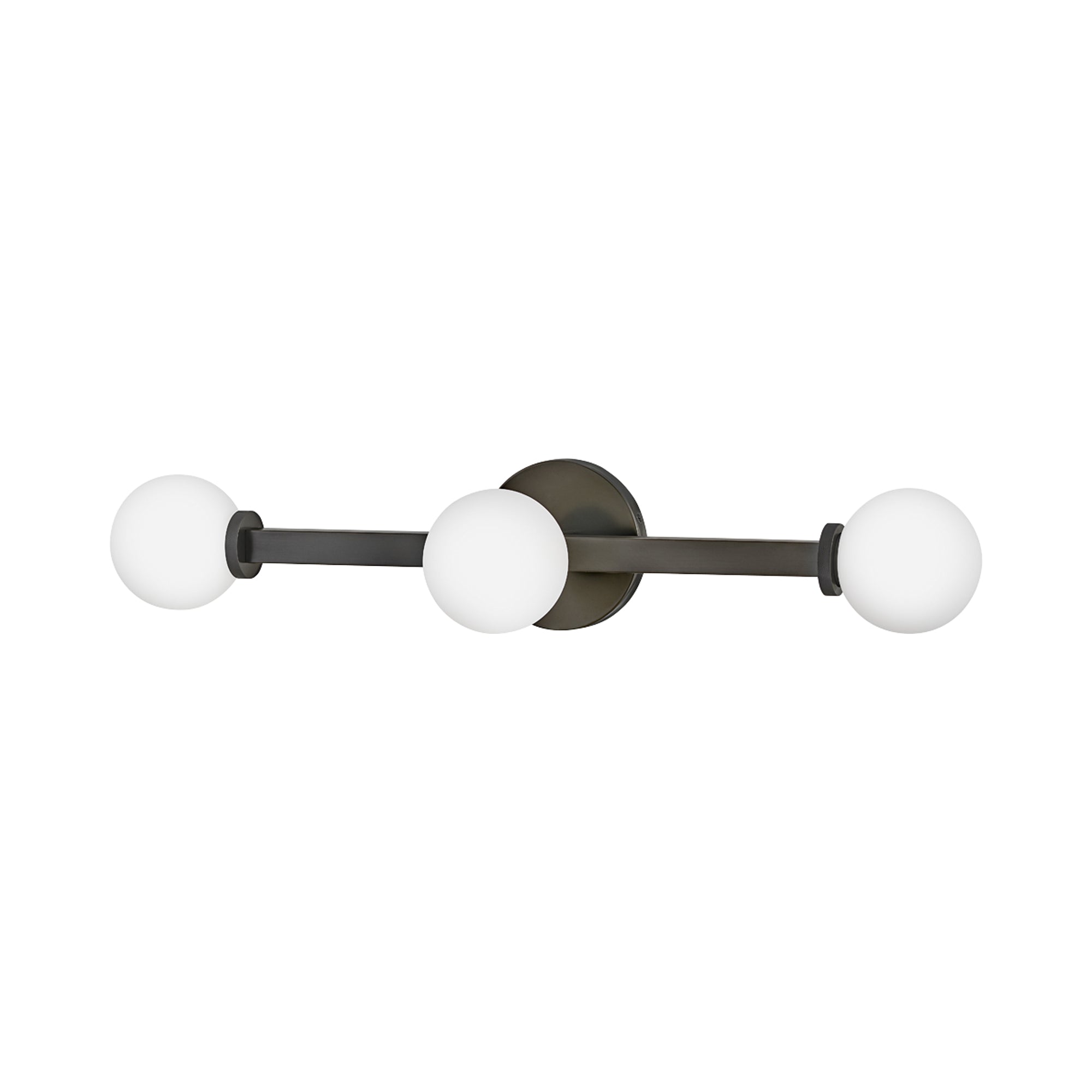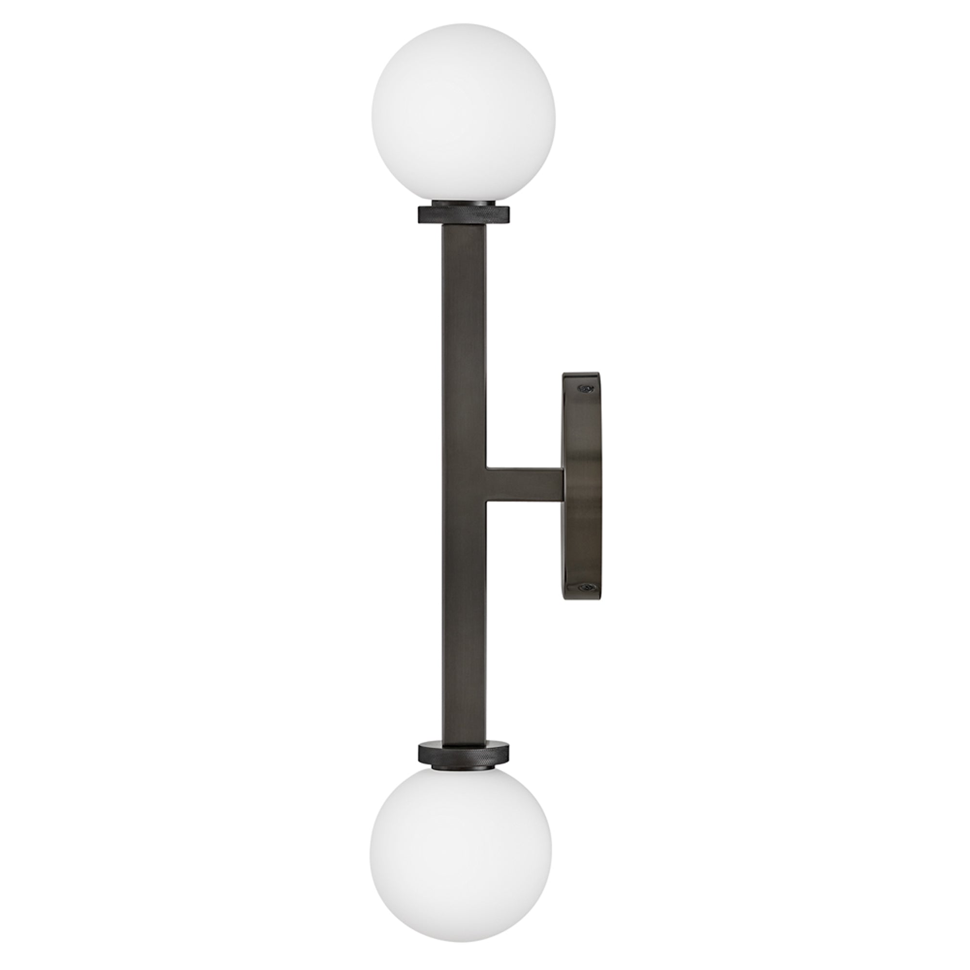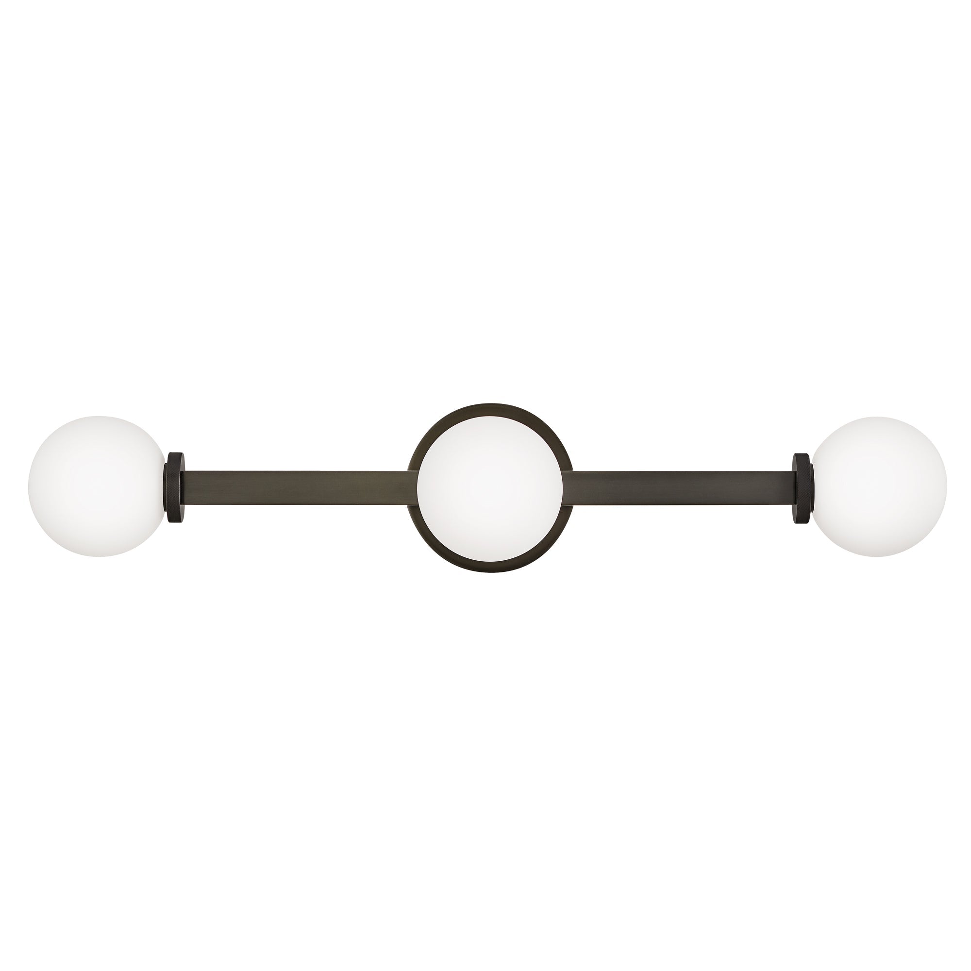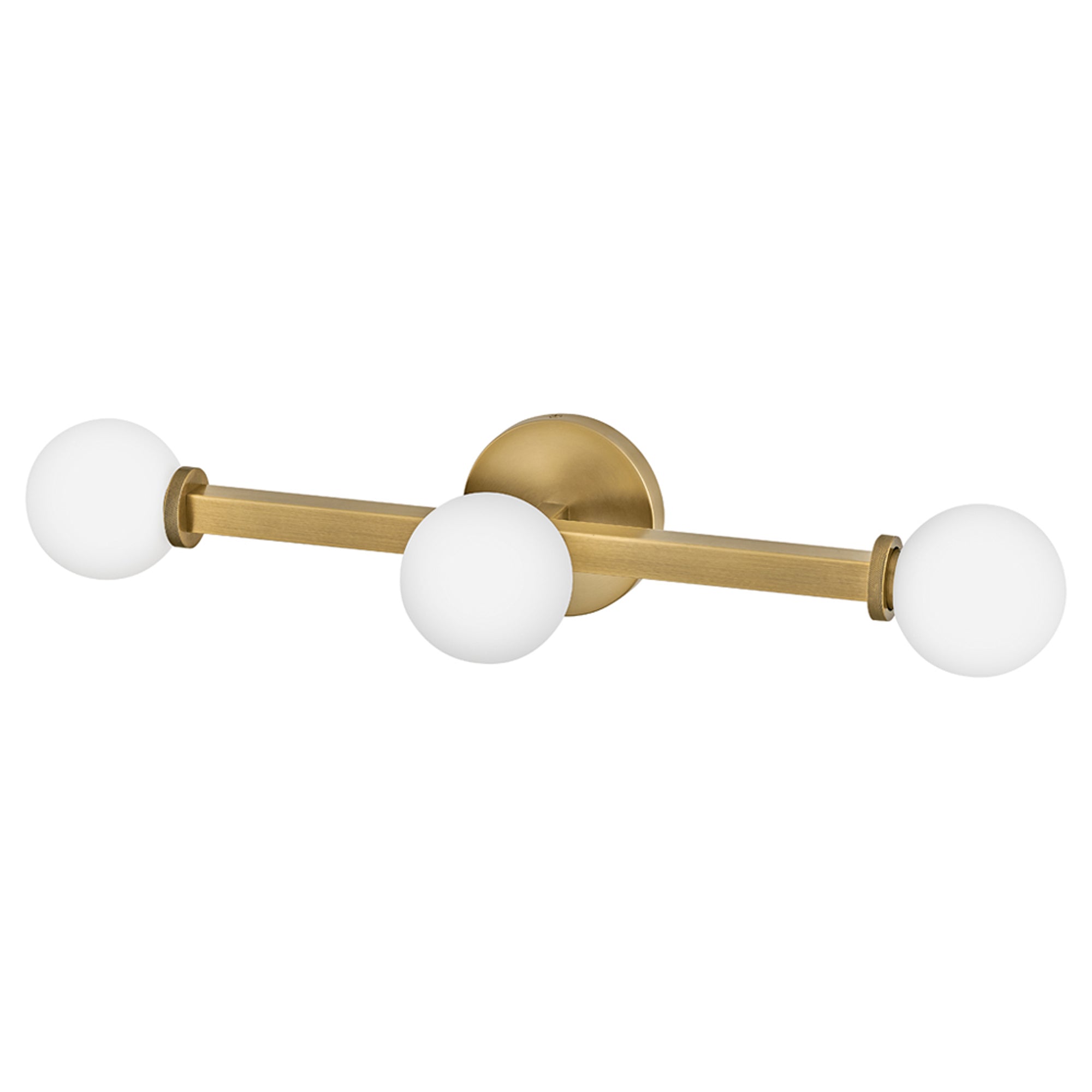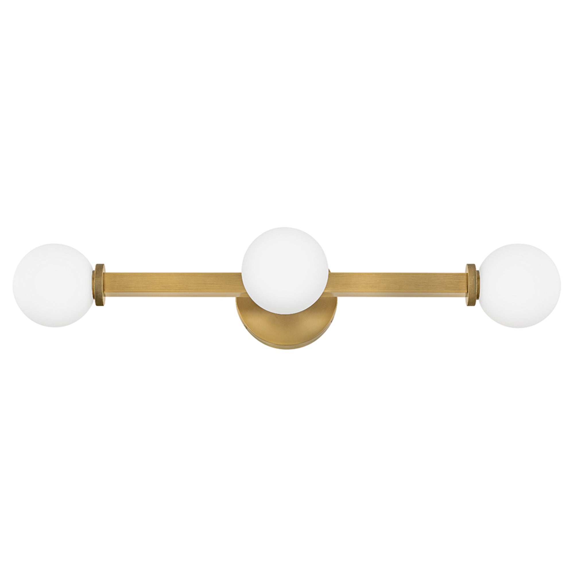 Etched opal glass globes bring vintage character to a modern Audrey Vanity Wall Light from Hinkley. A round wall plate echoes the simple orb shades, while linear elements add structure and elegance. Knurled details add appealing dimension to a versatile fixture that may be installed vertically or horizontally to create the perfect lighting in your bath.