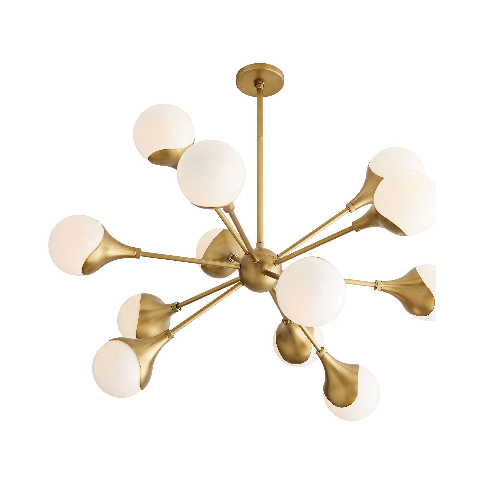 Brazen style is dimensional and expressive as it turns the Augustus Chandelier from Arteriors into a central focus in any space. With retro flavor and Art Deco influence, this fixture protrudes metal arms and frames in a Sputnik-like formation, with opal glass globes at the tip of each arm. This statement-making chandelier is an obvious choice for personality-embellished settings.